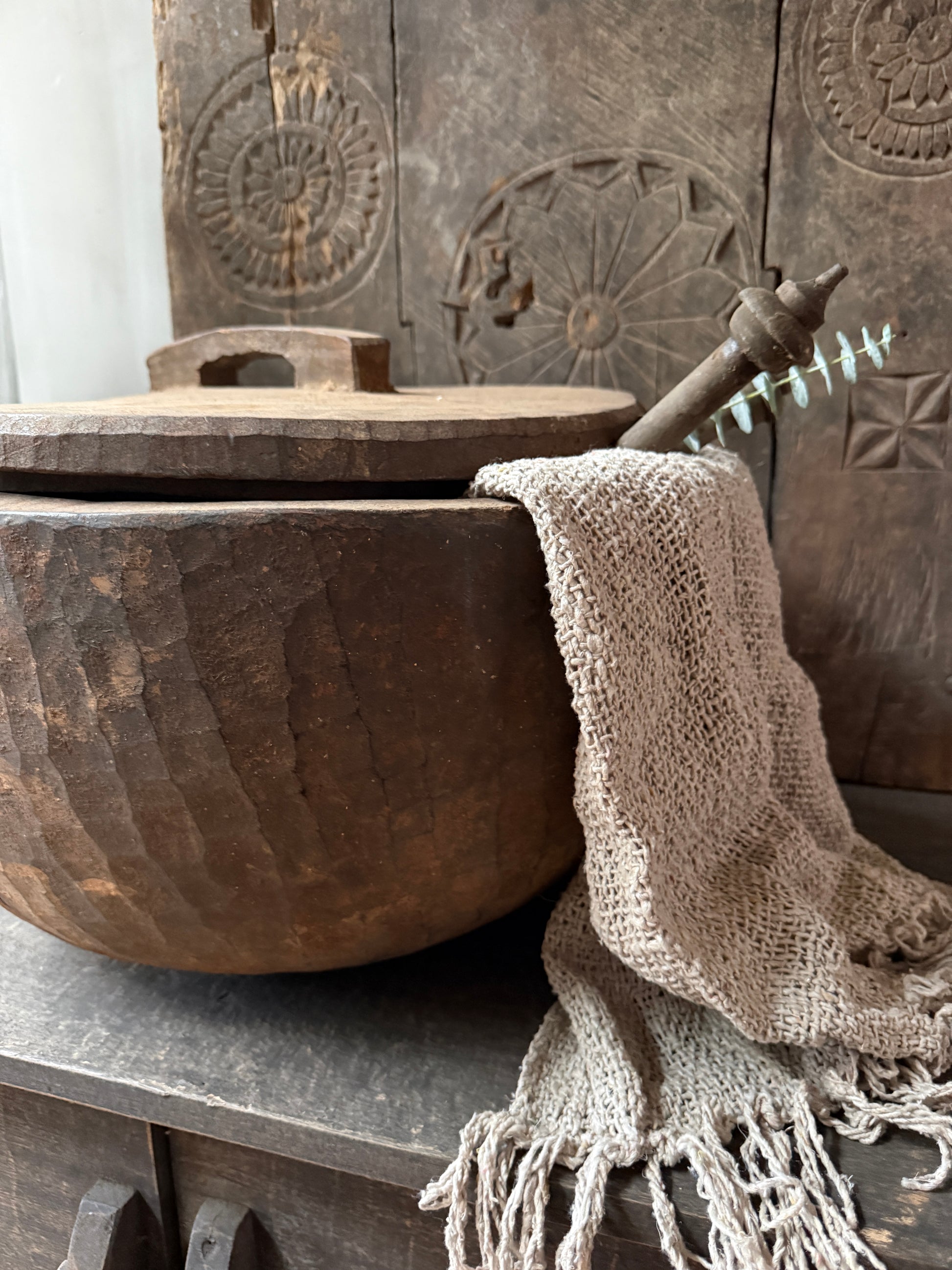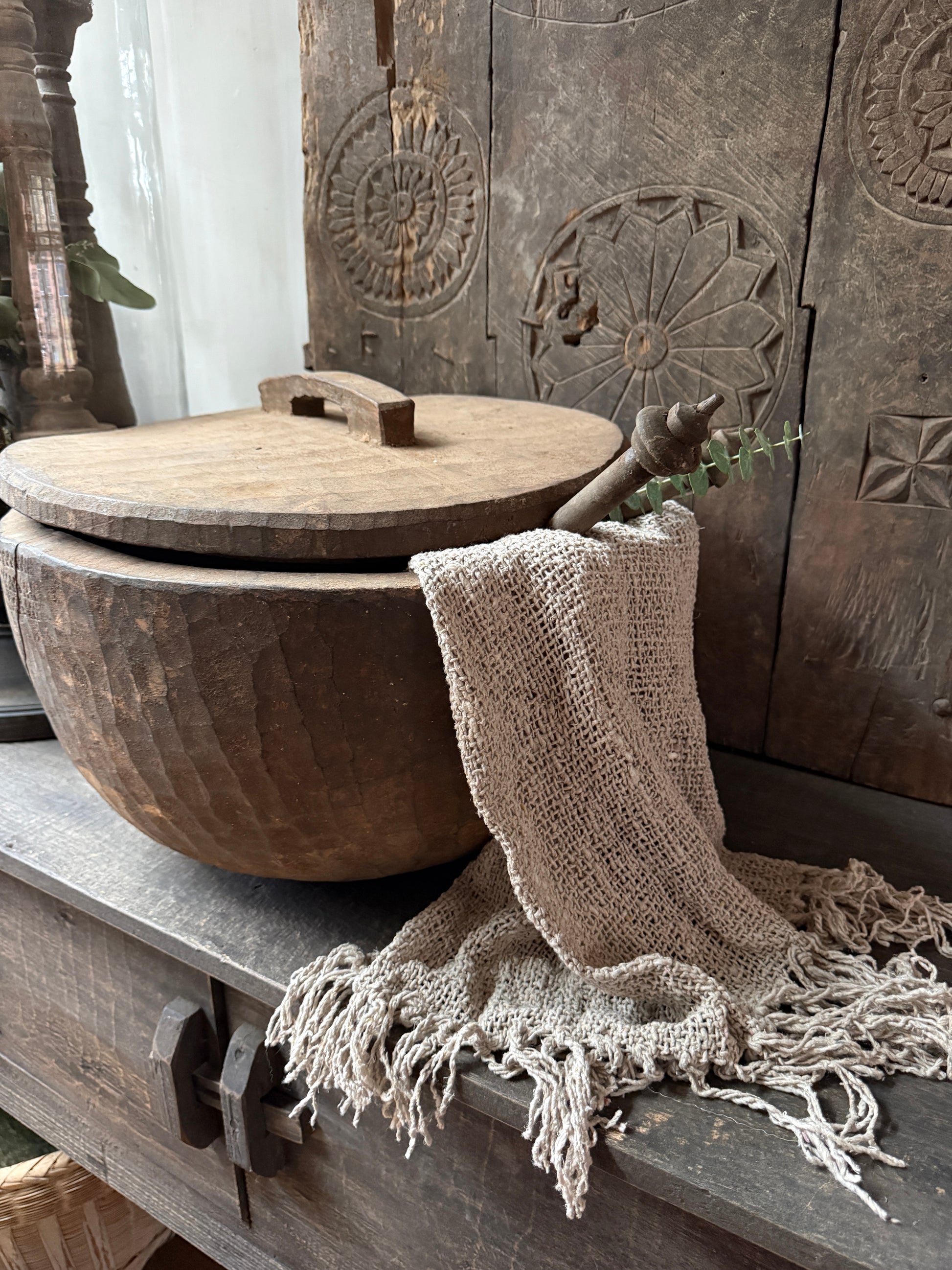 This beautiful old wooden container/jar with lid is truly decorative. These containers are handcrafted and each one is unique. They're lovely for decoration, but also perfect for use in a kitchen, for example. Each item individually complements your minimalist interior and can finally be used for decoration. Bring something truly beautiful into your home with this set.