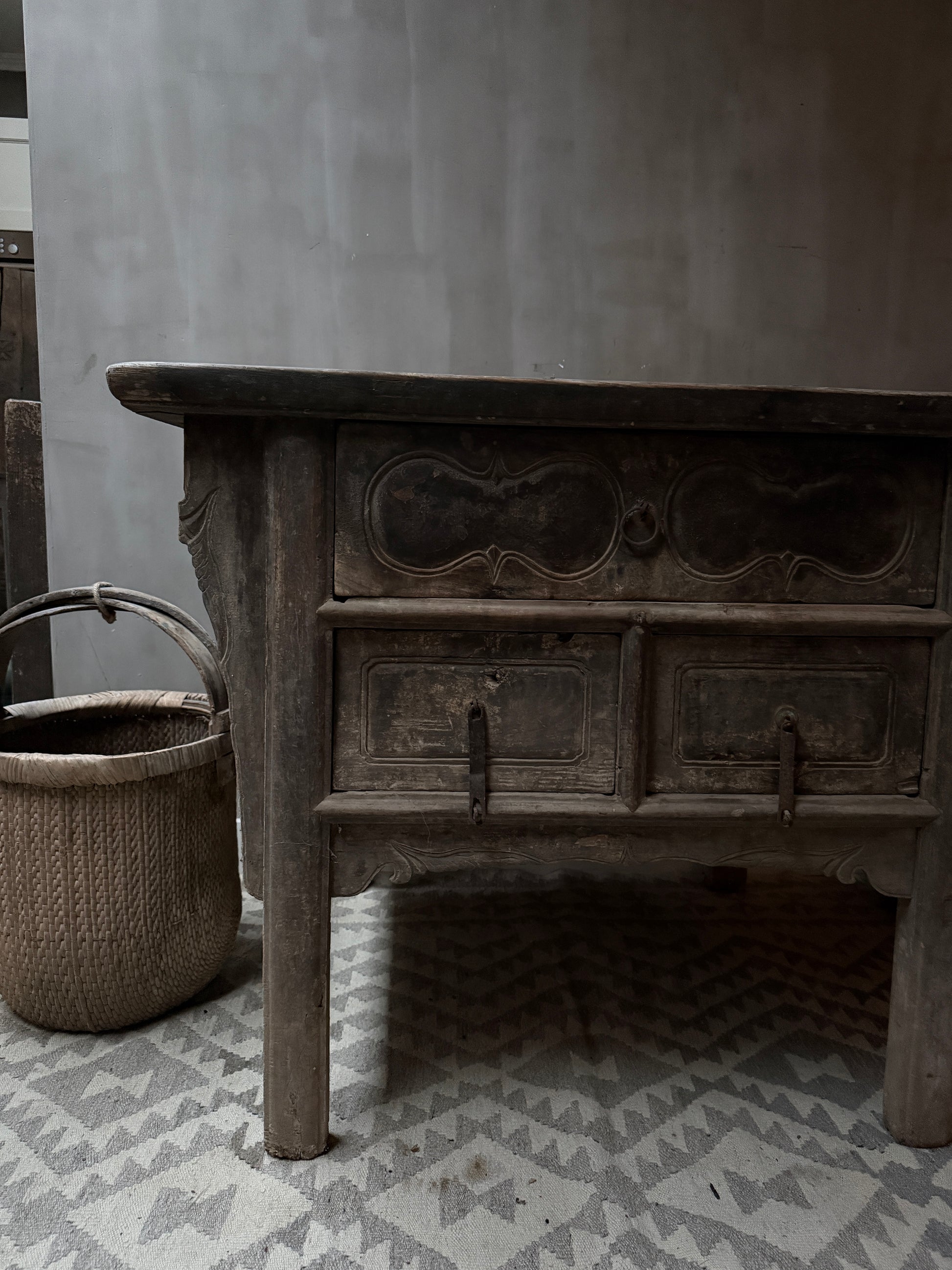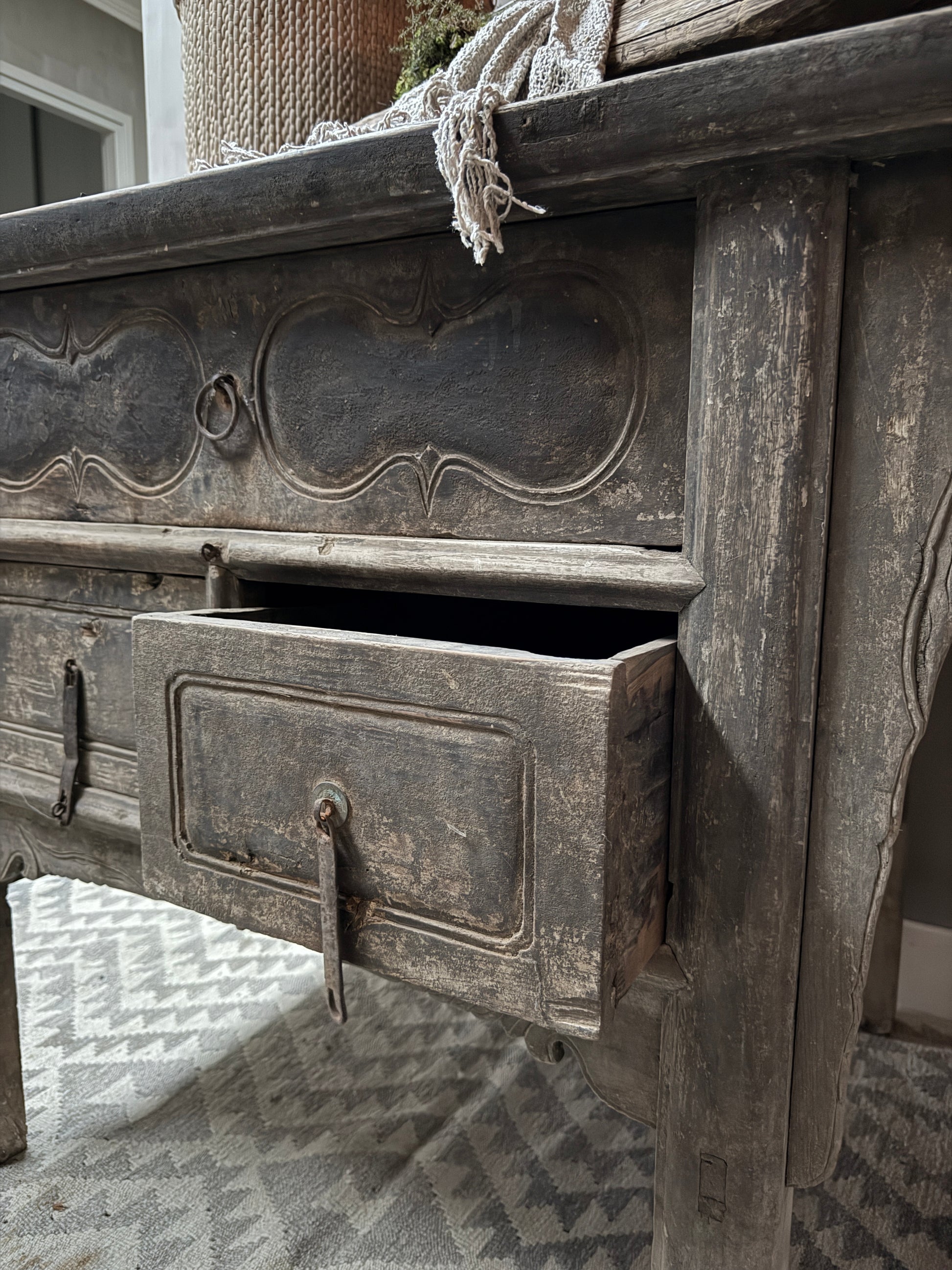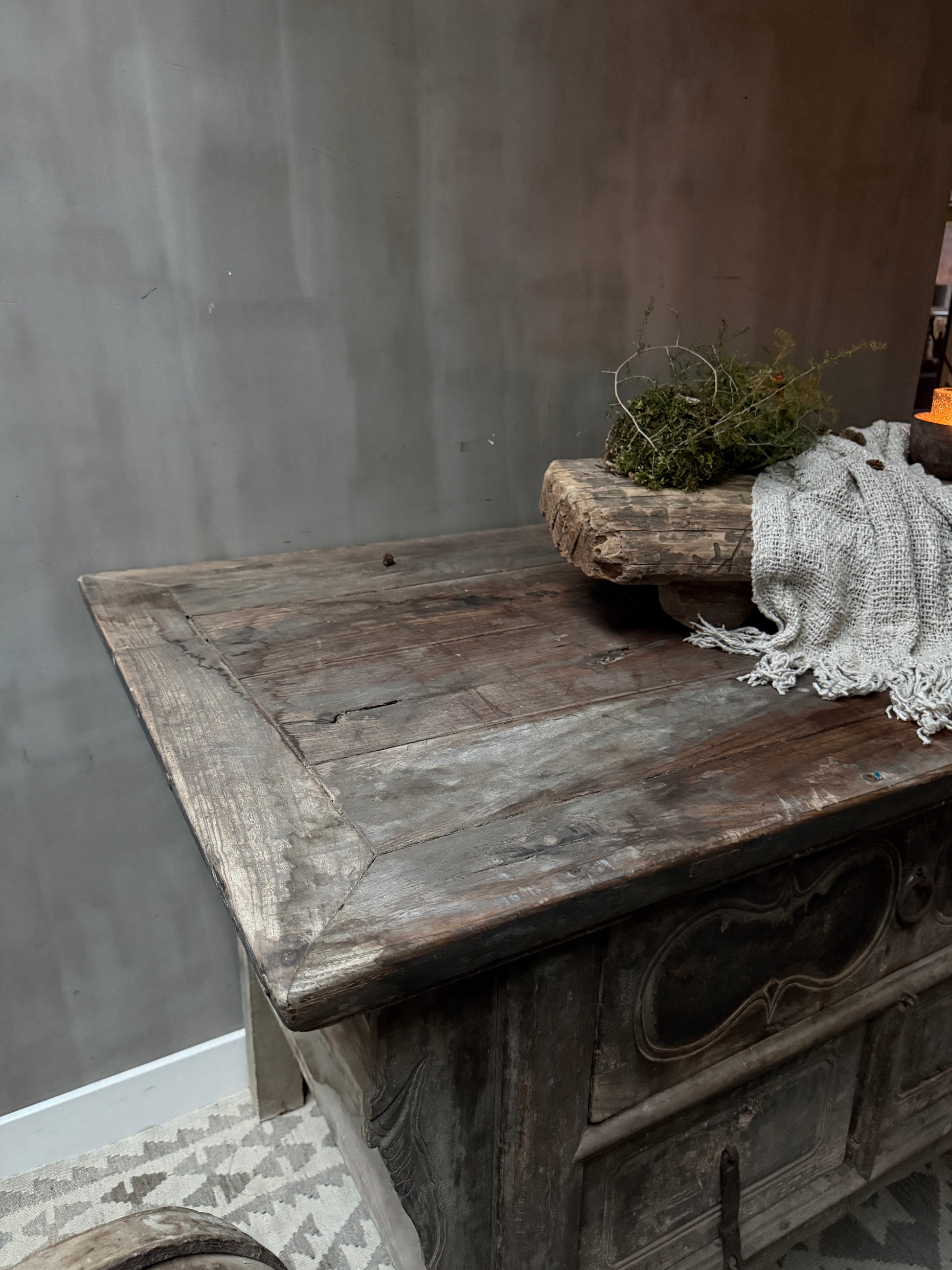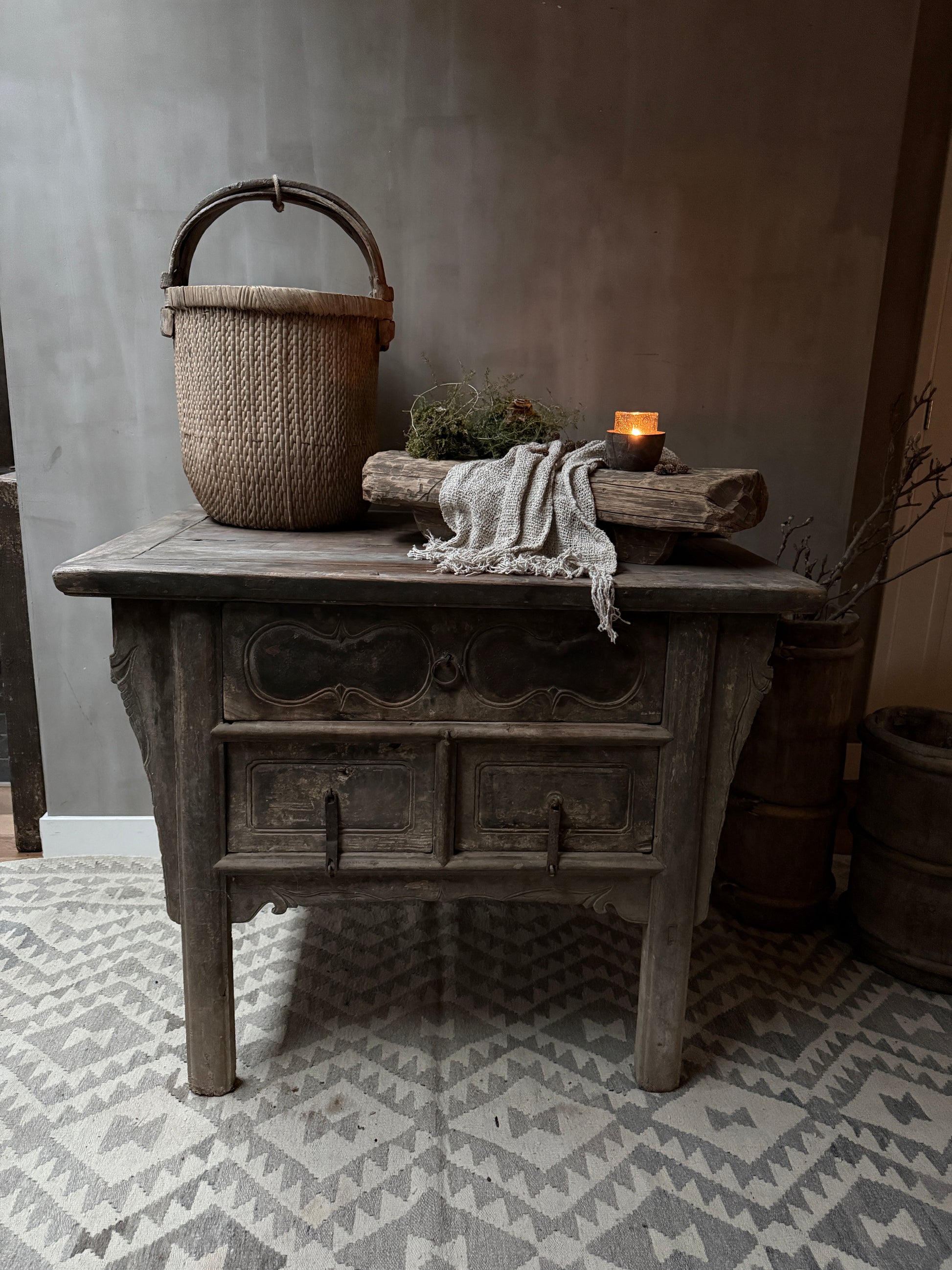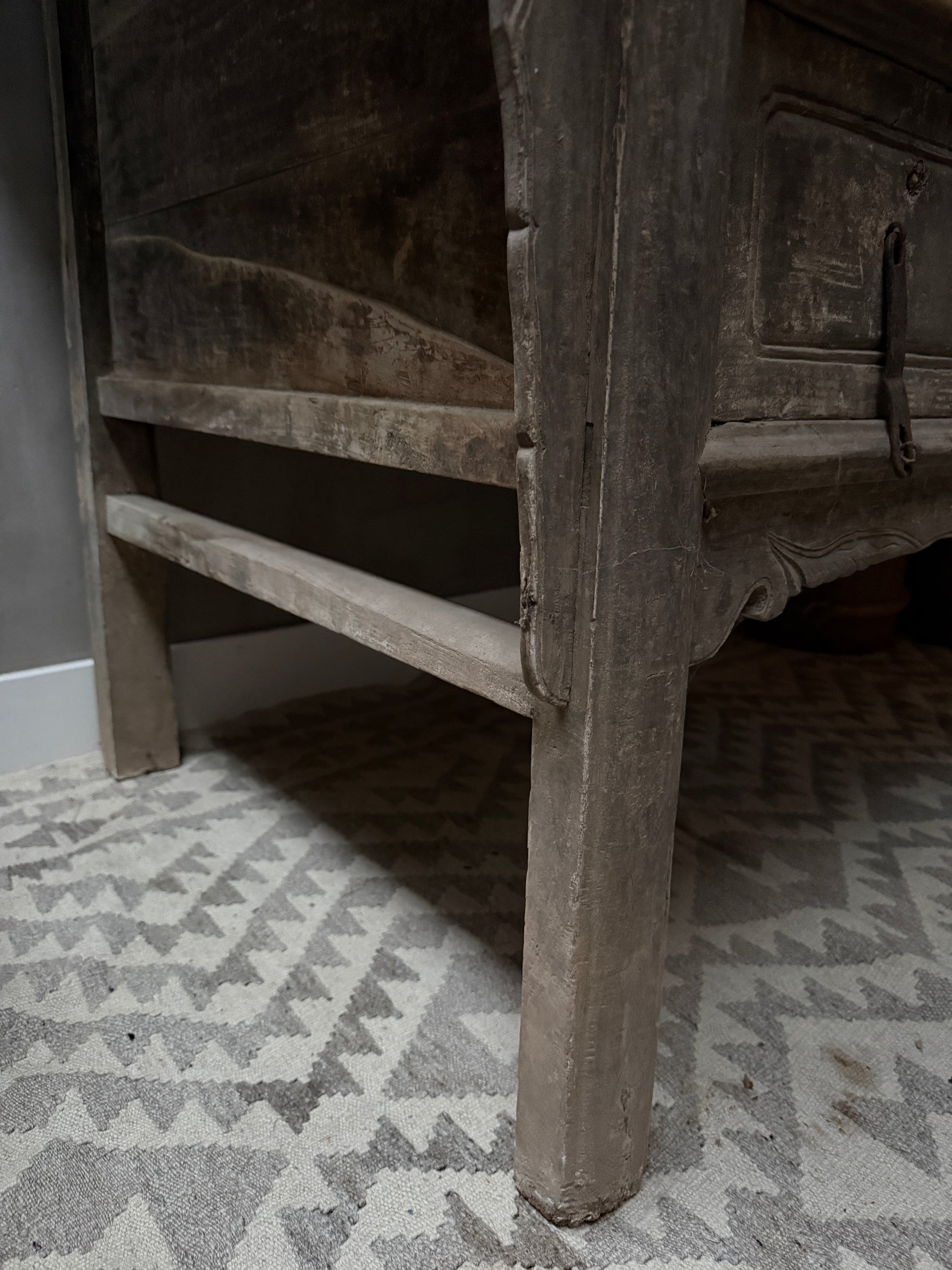 This beautiful, old, authentic Chinese altar table is made of beautifully weathered old wood! It's stunning as a console table or entryway table. Made in China—yet centuries ago! This beautiful altar table carries a story and a history. This cabinet is unique and authentic. You won't find more beautiful pieces like this one. The unique culture, customs, and traditions of China are evident; you can feel the past!