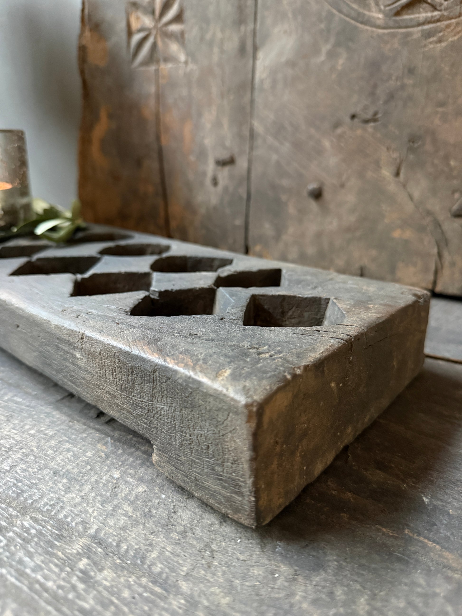I've been told this is an old wooden cookie mold. More specifically, it was used to make glutinous rice balls, coconut candy, and offering balls filled with flowers and rice. These molds likely date from 1880-1930. The wooden molds are handmade. I absolutely love these wooden molds! Very decorative, great for decorating the kitchen, for example, but where wouldn't they be?