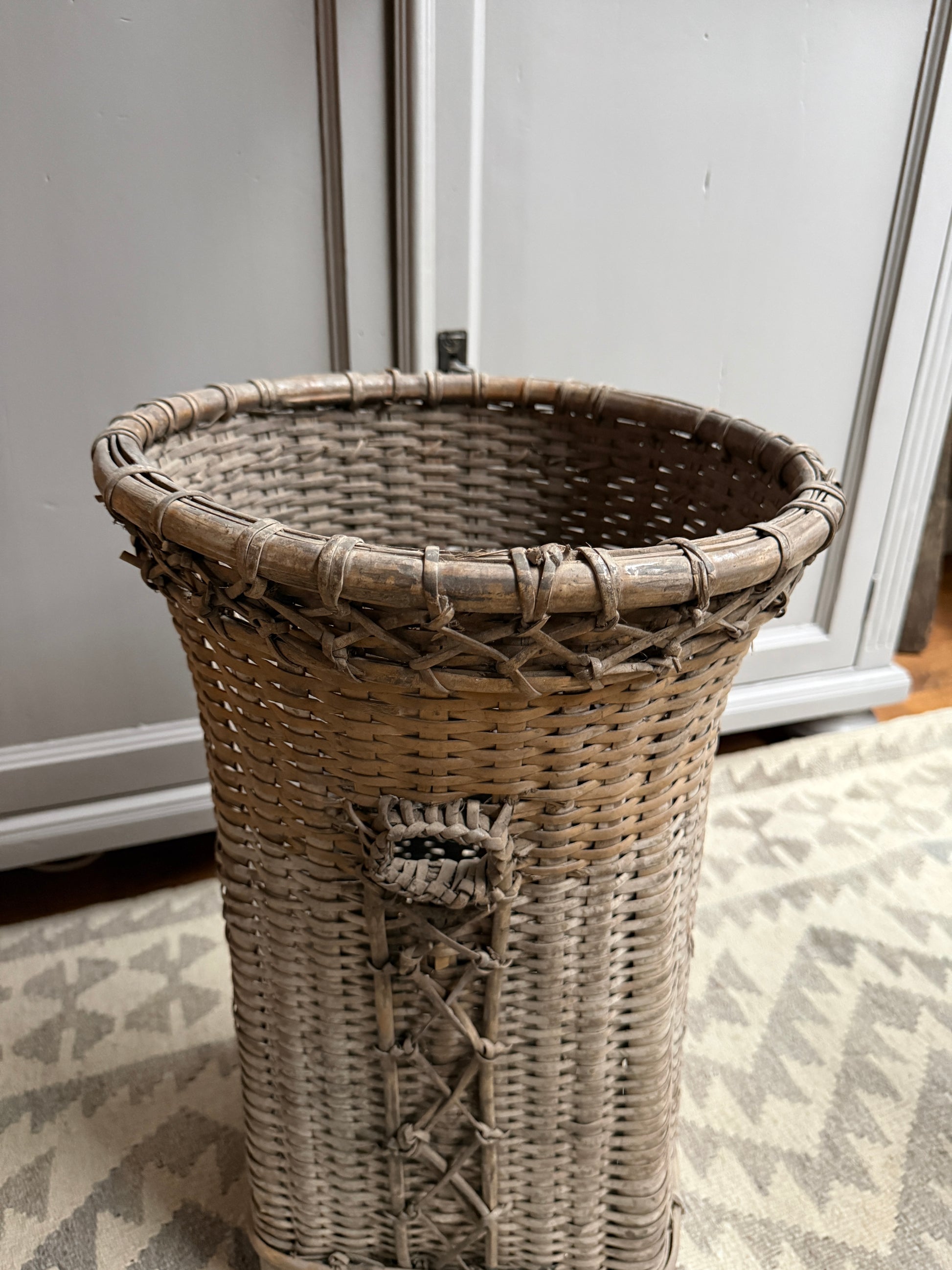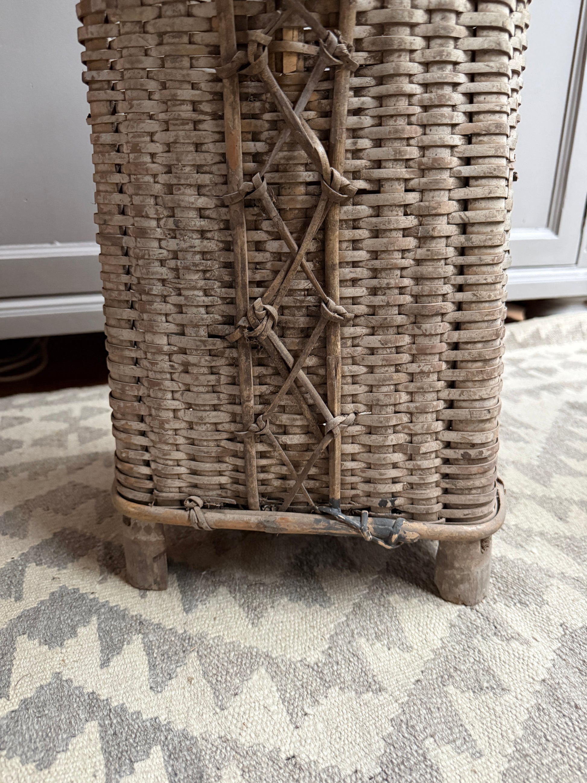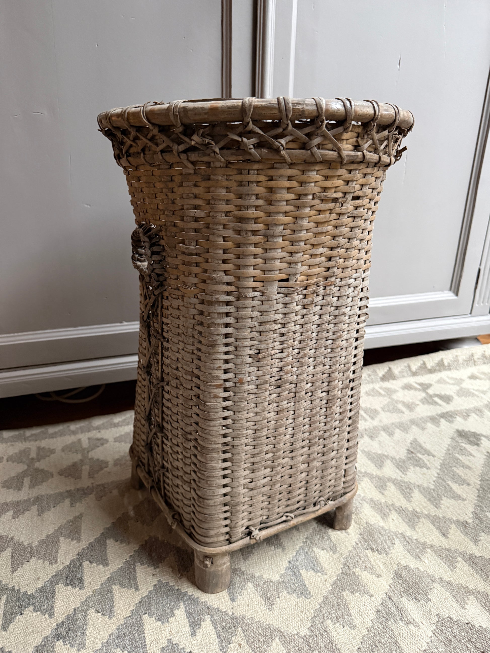 Prachtige traditionele rieten manden op pootjes of te wel rijstmand / oogstmand. In veel Aziatische landen worden dit soort hoge smalle manden gebruikt om rijst, mais of andere droge gewassen te bewaren. De pootjes dienen om de inhoud droog te houden en te beschermen tegen ongedierte. De gevlochten zijkant met kruislings gebonden touw duidt op een constructie die stevigheid geeft - typisch voor manden die zwaar materiaal moesten vervoeren. Soms werden ze ook op de rug gedragen met riemen die aan die bevestigingspunten vastzaten. Wat een mooie items! Weer zo'n item vol historie.