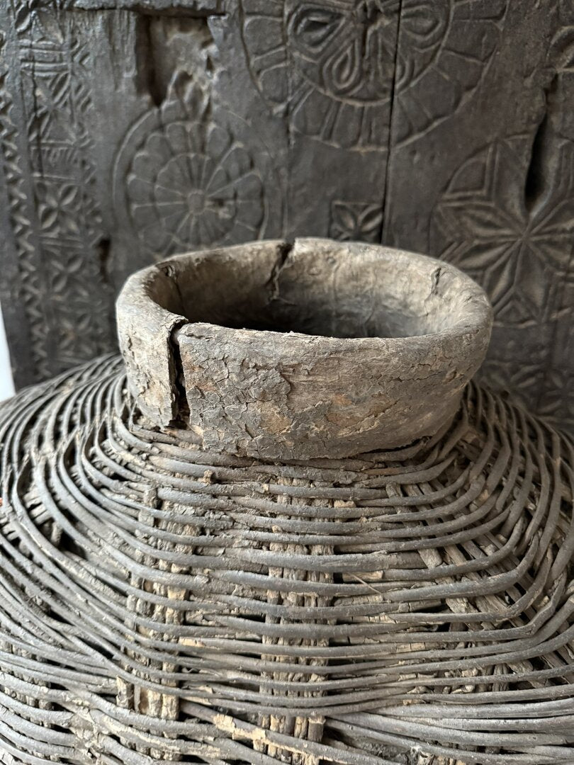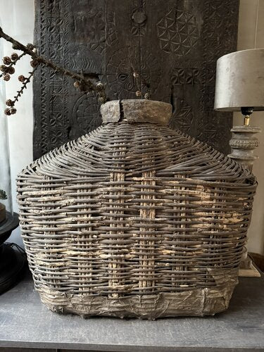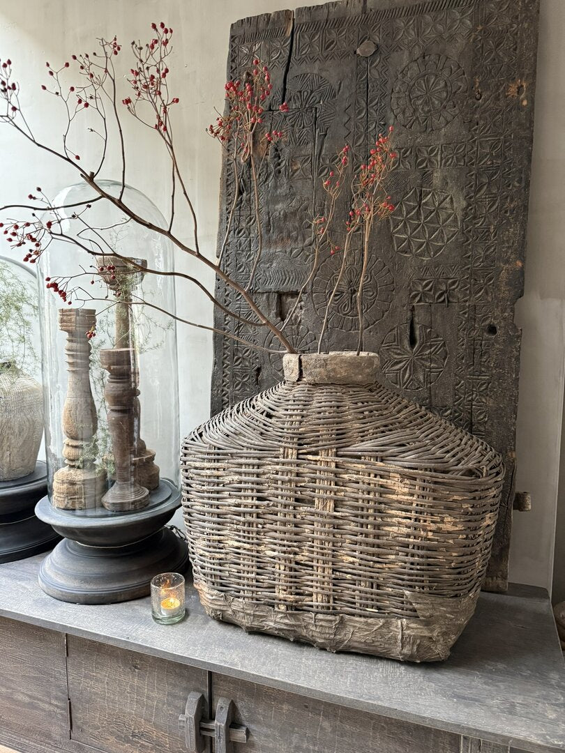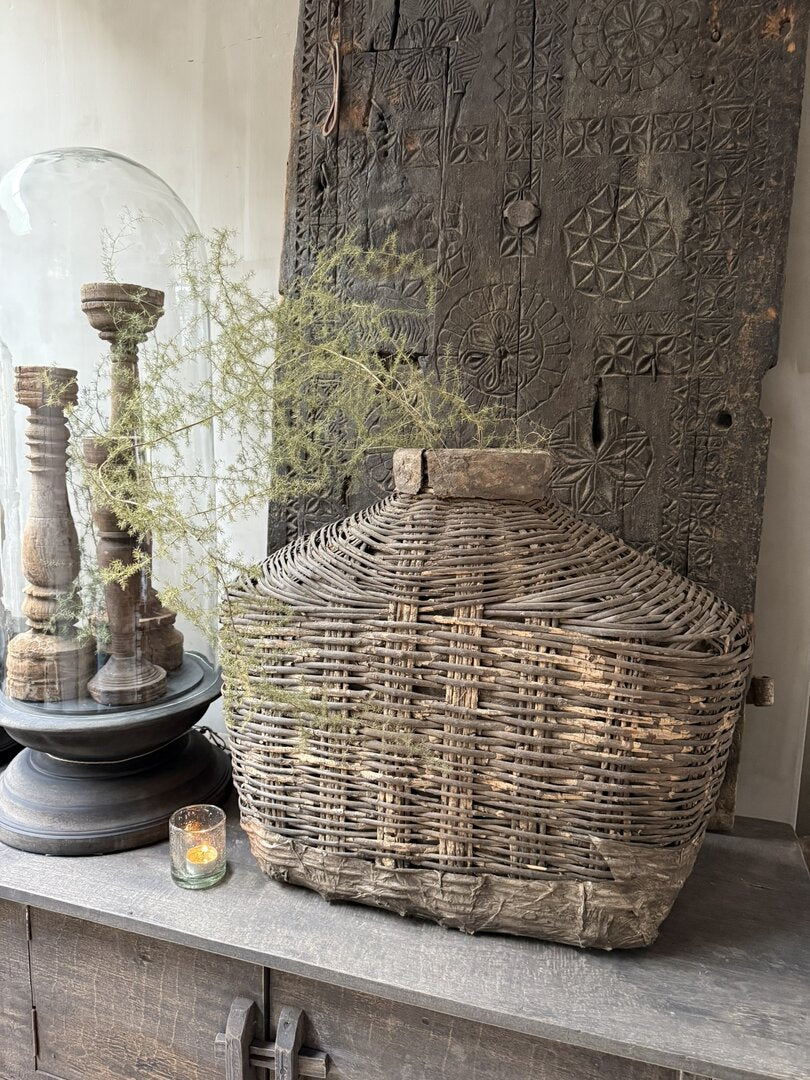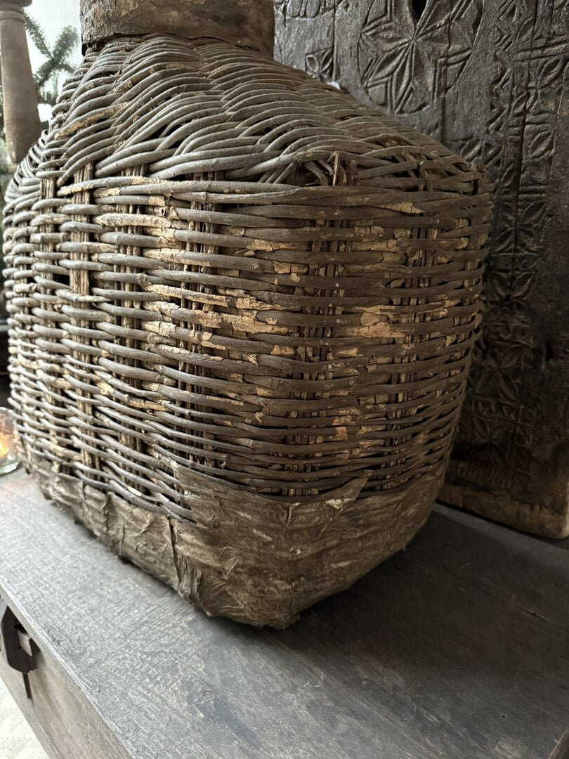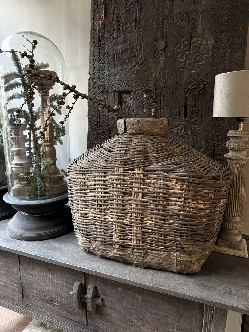 Prachtige unieke oude leemmand. Deze unieke, authentieke leemkruiken zijn afkomstig uit China. Deze oude rieten manden met leem worden ook wel vissersmanden genoemd. De gevangen vissen werden in deze manden bewaard. Door de smalle hals konden de vissen er niet meer uit. Sommige exemplaren hadden ook een deksel. Ieder exemplaar heeft zijn eigen unieke uitstraling. De manden zijn zeer verweerd maar dat maakt hem echt uniek en des te mooier wat mij betreft. In het najaar weer prachtig te stylen met wilde asperagus of rozenbottels. Een uniek item en een echte eyecatcher voor je interieur.