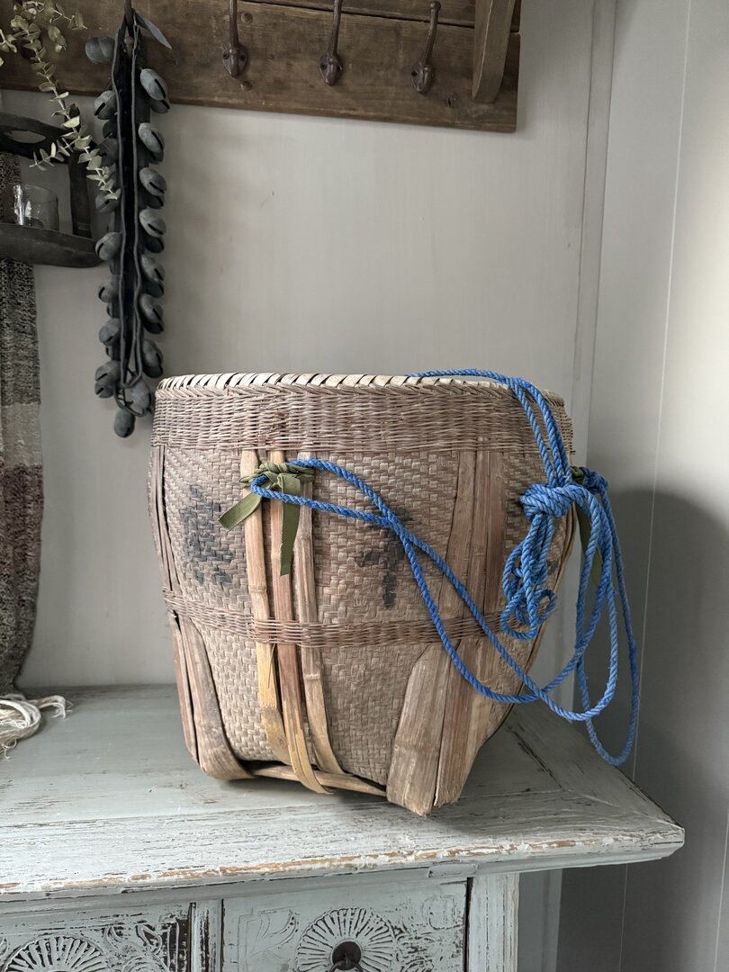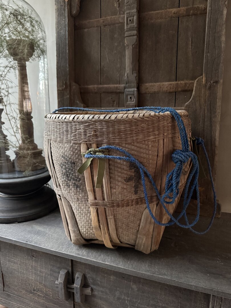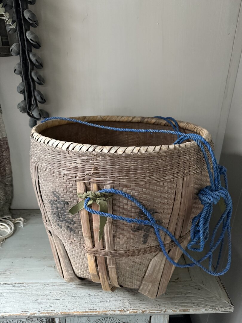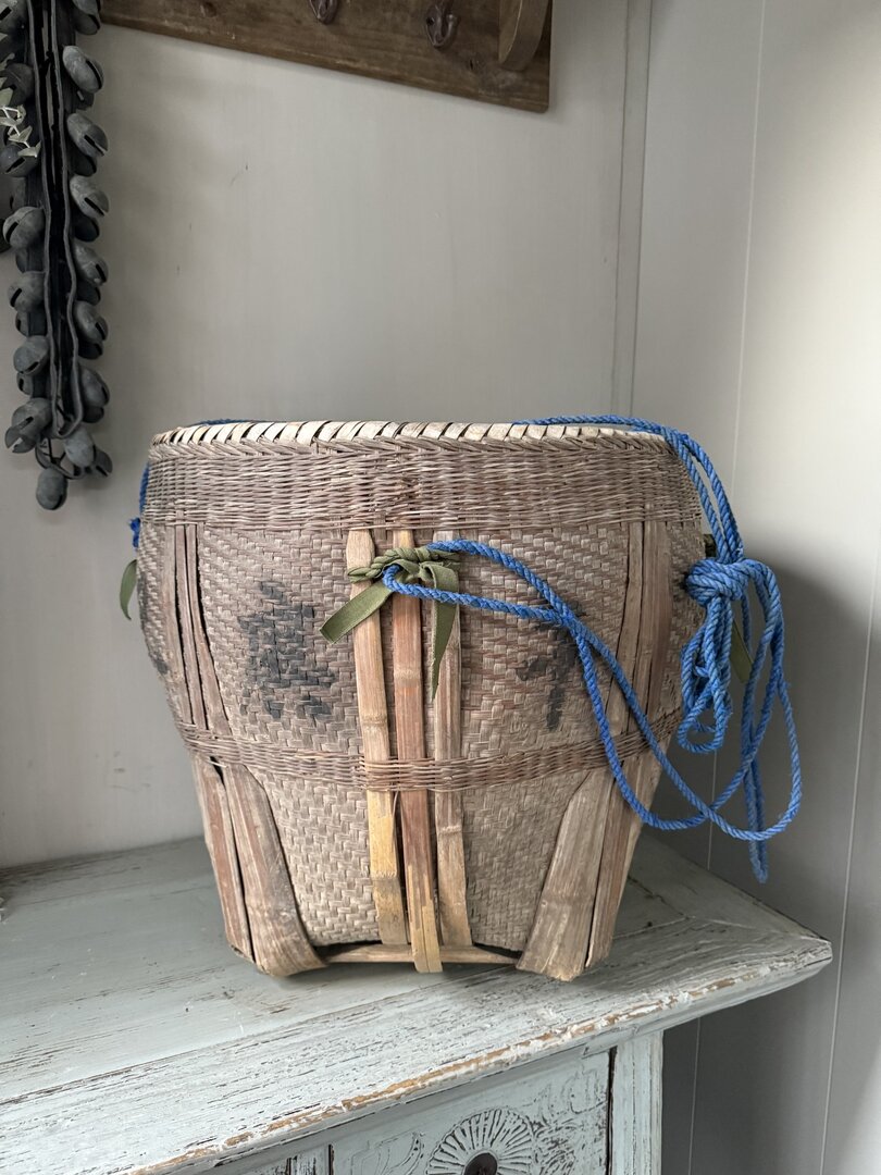 Prachtige originele oude Chinese rieten mand. Prachtige grote authentieke doorleefde rieten mand uit China. Het originele gekleurde touw is er eventueel af te halen.