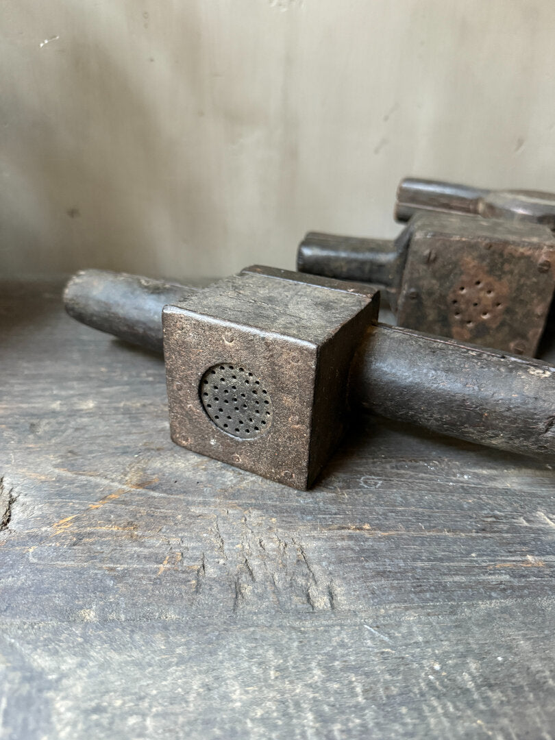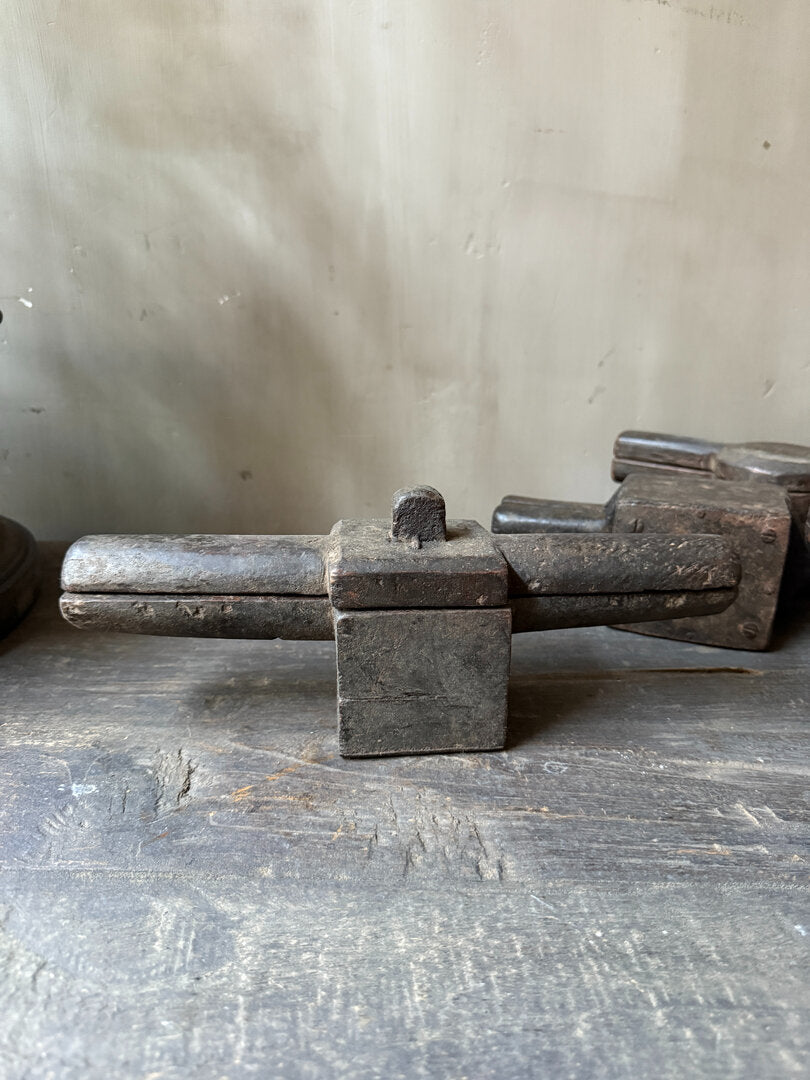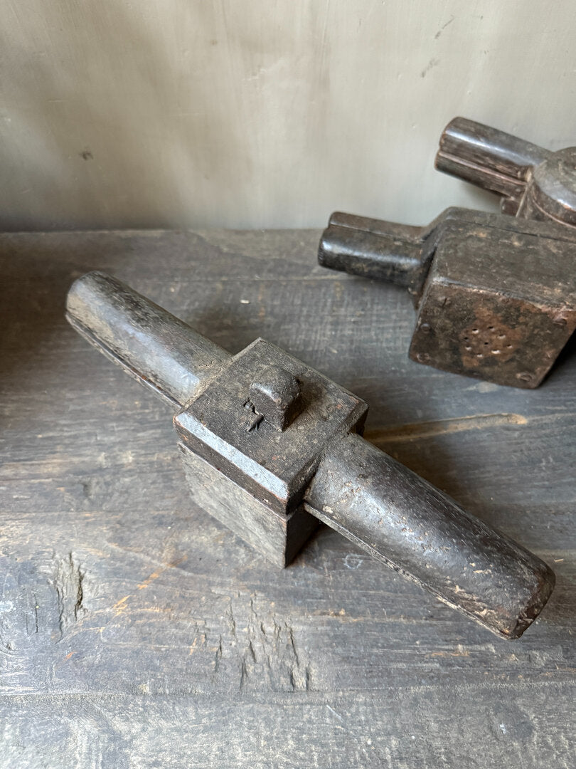 Dit is toch super leuk, weer zo'n uniek item met een verhaal! Deze unieke houten pers met zijn prachtig authentieke patina is een prachtig voorbeeld van traditioneel Indiaas vakmanschap. Met zijn robuuste en doorleefde uitstraling vertelt dit stuk een verhaal van ambacht en gebruik door de jaren heen. De pers is met de hand vervaardigd uit massief hout en metaal, en heeft een cilindervormig lichaam met twee stevige handgrepen. De onderzijde is voorzien van een metalen plaat met zorgvuldig geboorde gaten, bevestigd met kleine schroeven. Vermoedelijk gebruikt voor het persen van kruiden, pasta’s, of pigmenten. 1
