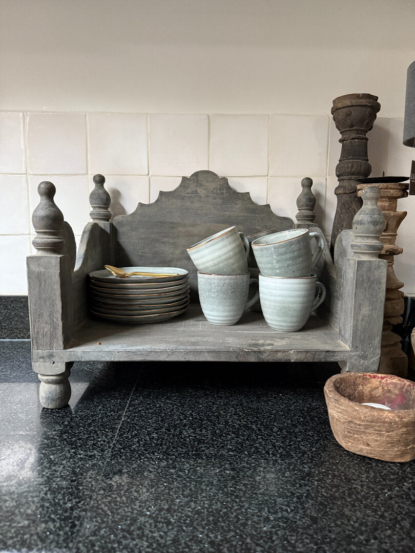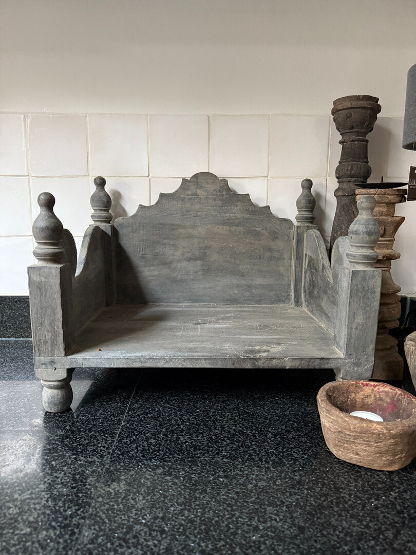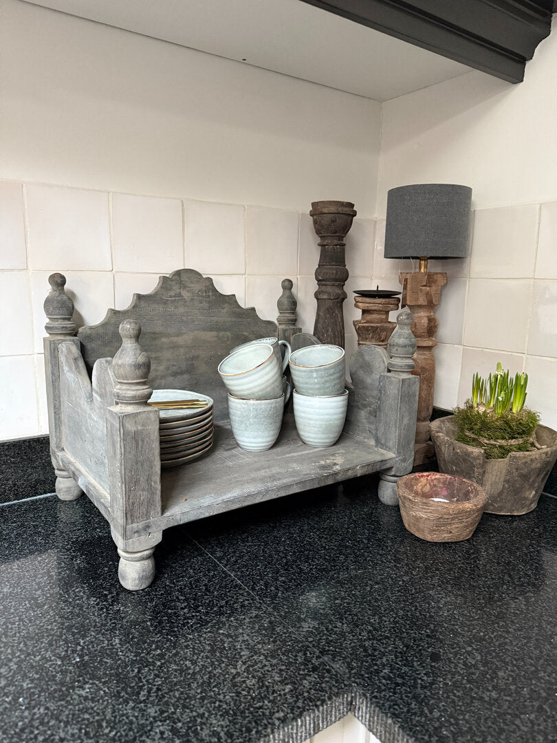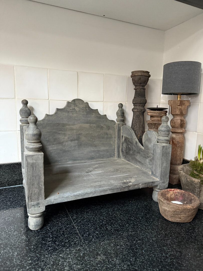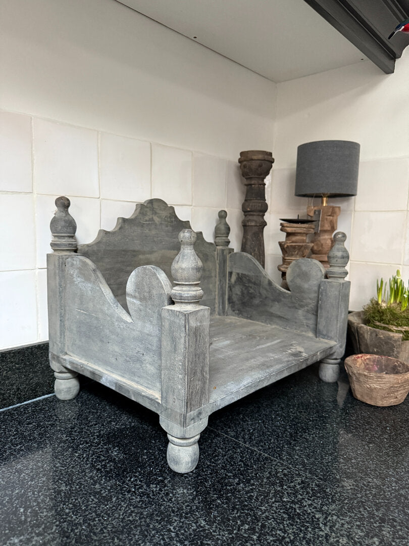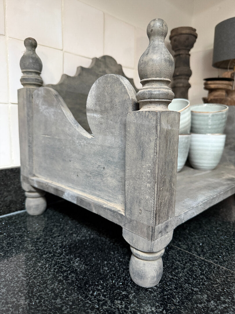 Houten bajot / altaar / keukenrek. Over het doel van dit leuke tafeltje / plateau valt wat te zeggen, maar leuk is die zeker! Gebruik hem als katten of hondenmand met een leuk kleedje er in. Of als altaartje voor je dierbare herinneringen. Of gebruik hem leuk in de keuken zoals op de foto. Het is in ieder geval een beeldig tafeltje.