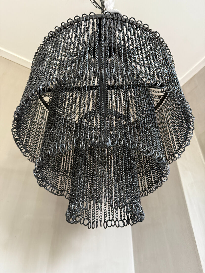 Prachtige hanglamp opgebouwd uit honderden zwarte kettinkjes. Een juweel van een lamp, maakt van iedere ruimte iets speciaals. Geeft een prachtig schouwspel op de muur als lamp brand. Deze vakwerk hanglamp is verkrijgbaar in 3 maten (Ø 60 x 90 cm, Ø 45 x 75 cm, Ø 30 x 60 cm).