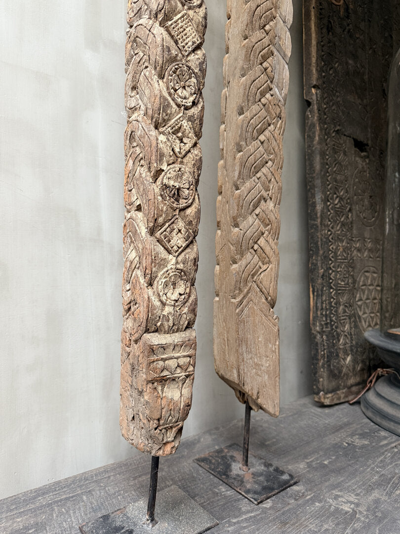 Prachtige houten ornament met houtsnijwerk op voet. Dit zijn de items waar mijn hart een sprongetje van maakt. Hier vind je niet nog een zelfde van. Het hout van dit ornament is prachtig oud, geleefd en verweerd en ademt sfeer uit. Een absolute eye catcher voor uw interieur. Mooi bijvoorbeeld in de vensterband als u een groot en hoog raam heeft. Met zijn formaat kan hij ook heel goed gewoon op de grond staan. Of laat het een sieraad zijn van uw interieur en geef hem een mooi plekje op een mooie tafel. Haal iets unieks in huis met dit prachtige ornament.