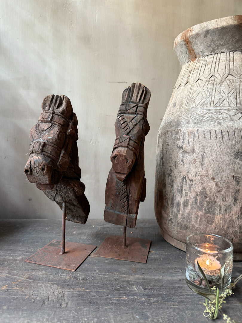Ornament paarden hoofdje op statief. Zeer decoratief paardje van oud hout met mooi houtsnijwerk.
