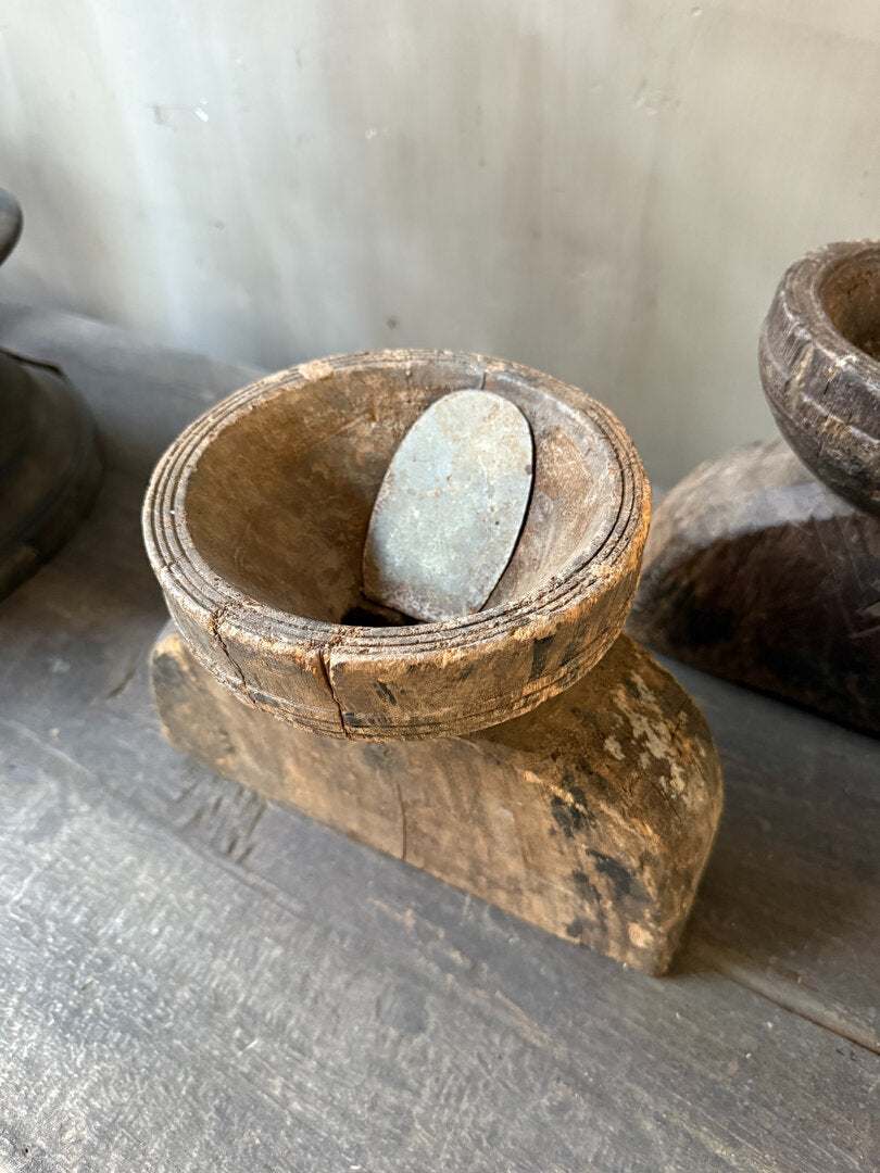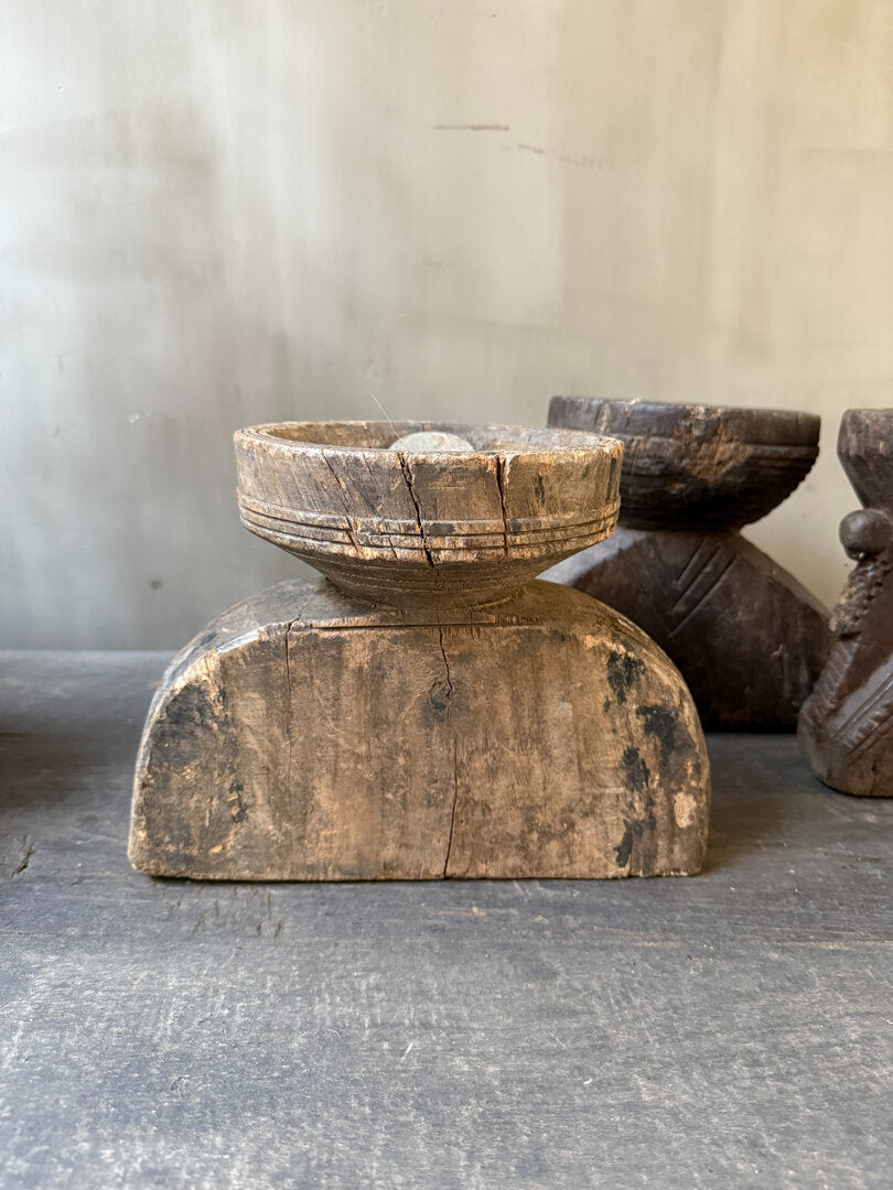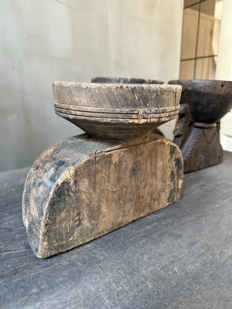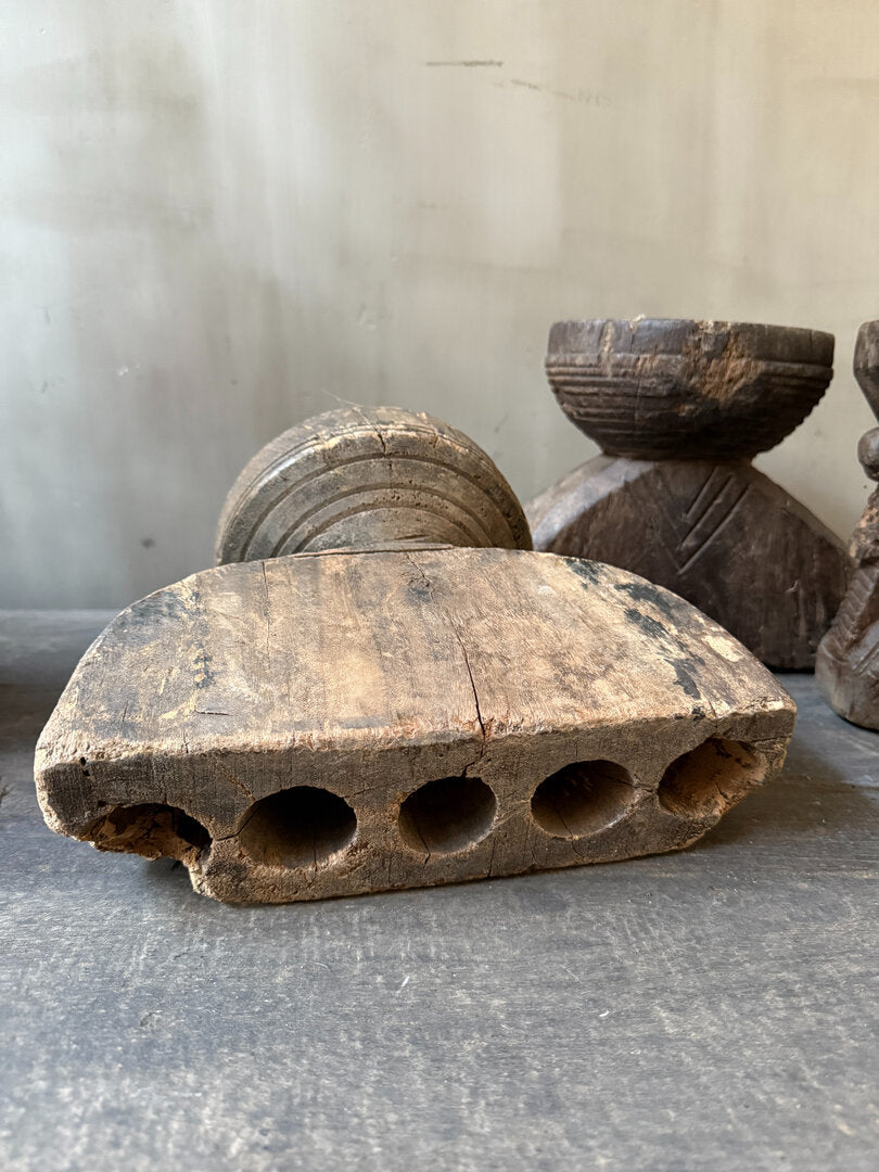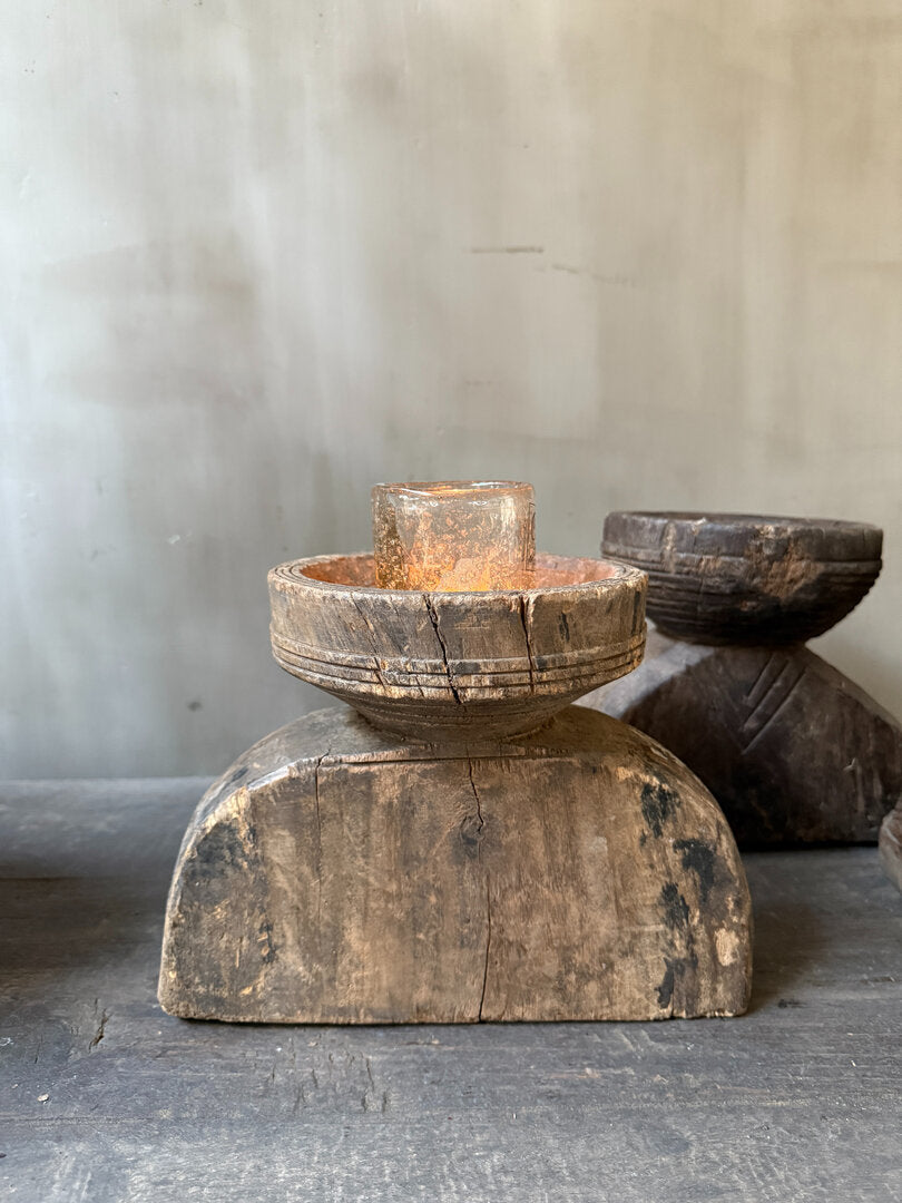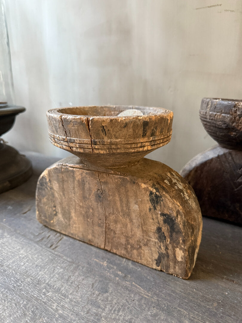 Prachtige oude houten graanverdeler. Hier werd vroeger dus het graan mee verdeeld, aan de ronde bovenkant ging het graan er in en werd door de verdeler verdeeld in 2, 3 of soms wel 4 gangen. Is toch geweldig dit soort items met een verhaal, een echt gebruiksvoorwerp dat er al een leven op heeft zitten. Alle graanverdelers zijn anders en dus allemaal uniek. De ene heeft mooi houtsnijwerk de andere heeft nog een extra metalen klepje. Leuk van zichzelf en heel decoratief, maar je kunt er ook heel leuk een windlichtje of kaars in zetten.
