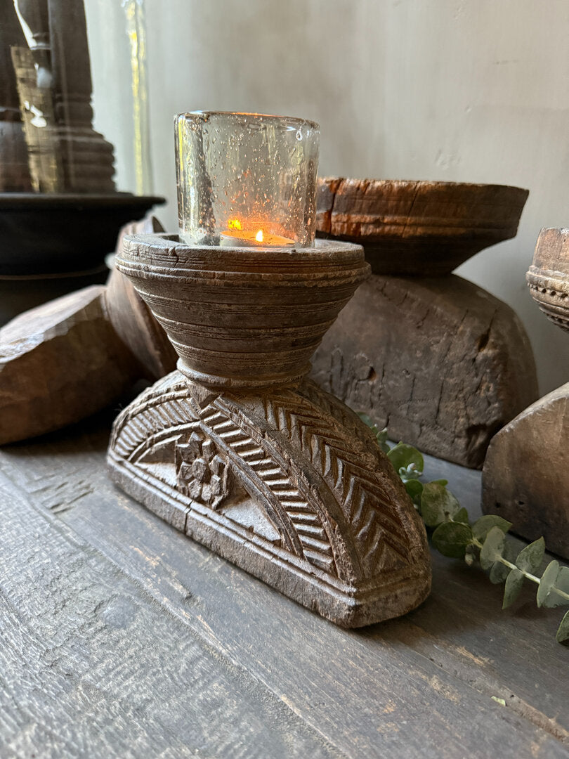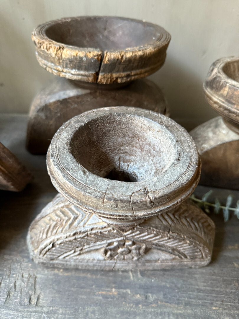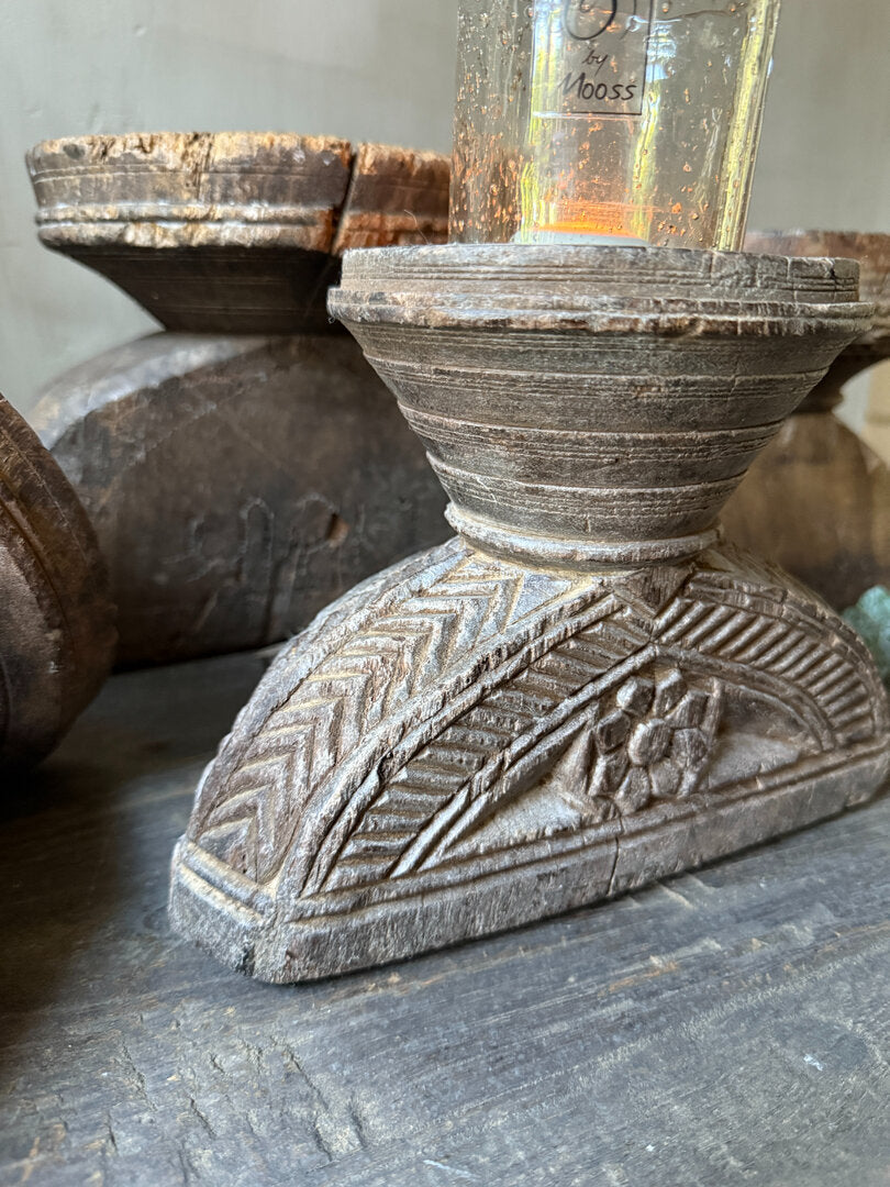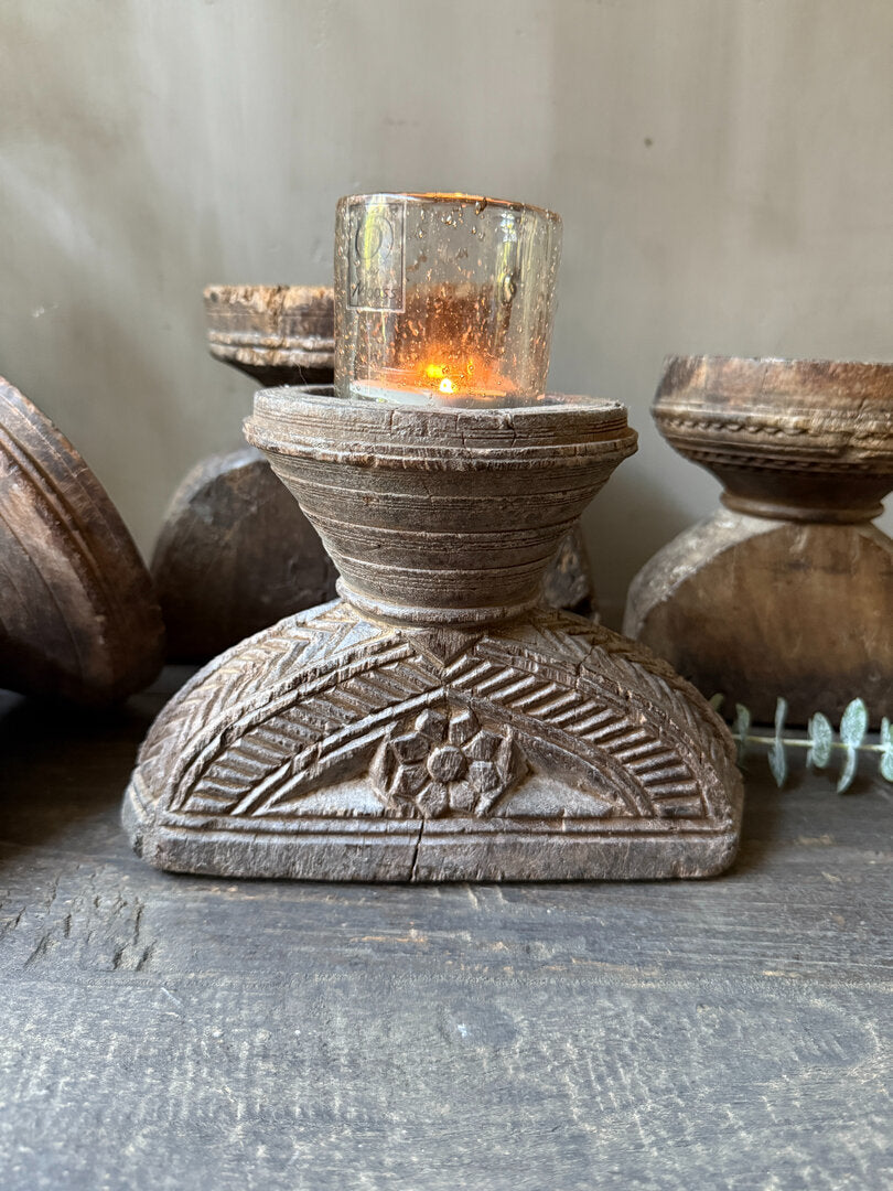 Prachtige oude houten graanverdeler 4. Hier werd vroeger dus het graan mee verdeeld, aan de ronde bovenkant ging het graan er in en werd door de verdeler verdeeld in 2, 3 of soms wel 4 gangen. Is toch geweldig dit soort items met een verhaal, een echt gebruiksvoorwerp dat er al een leven op heeft zitten. Alle graanverdelers zijn anders en dus allemaal uniek. De ene heeft mooi houtsnijwerk de andere heeft nog een extra metalen klepje. Leuk van zichzelf en heel decoratief, maar je kunt er ook heel leuk een windlichtje of kaars in zetten.