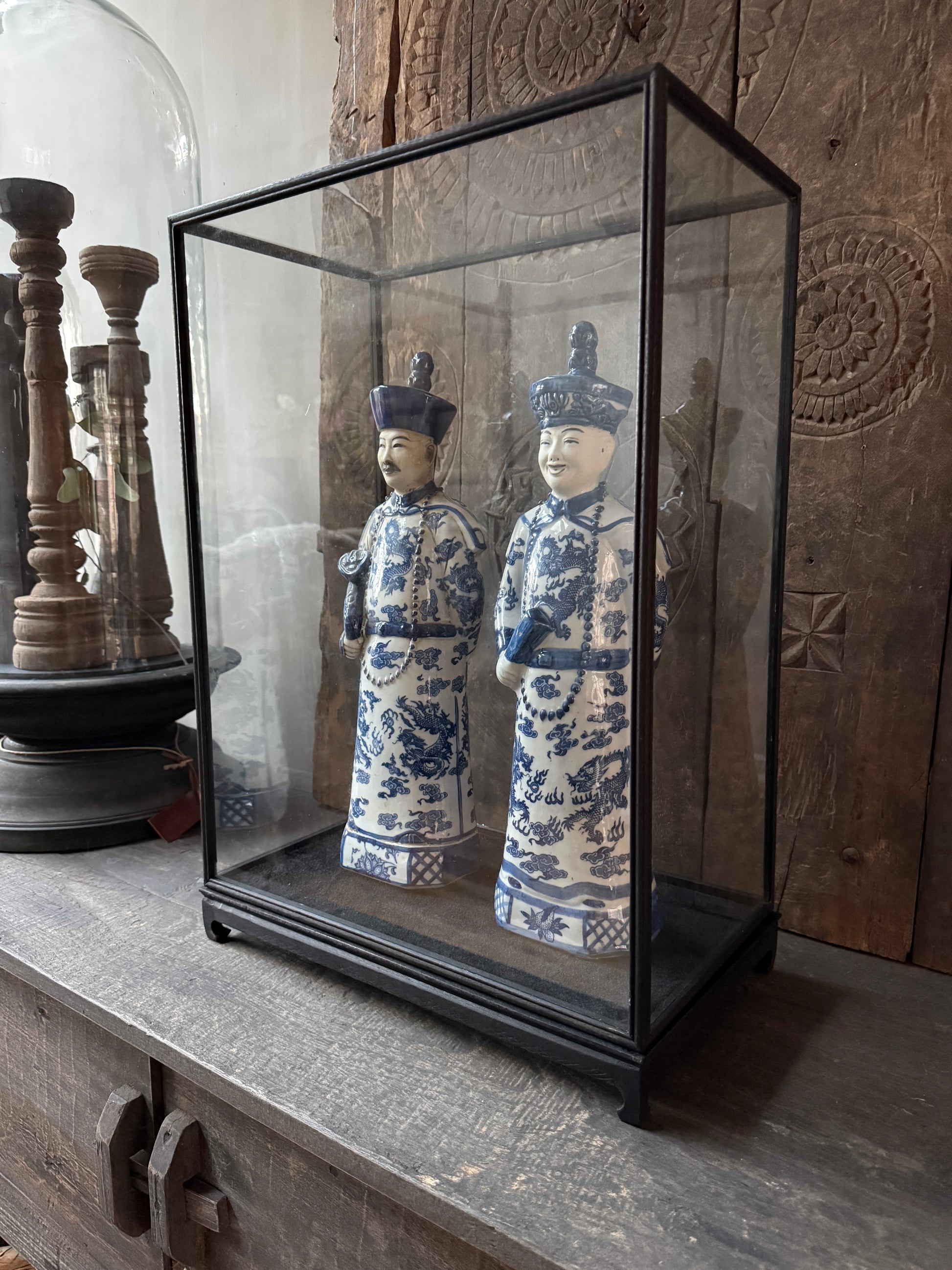 Vitrine mit mattschwarzem Rahmen und vier Füßen. Für all Ihre schönen Stücke, die einen Platz in einer Vitrine verdienen. Perfekt für ein schlichtes Interieur. Präsentieren Sie Ihre edlen Krüge oder antiken Accessoires in diesen eleganten Vitrinen.