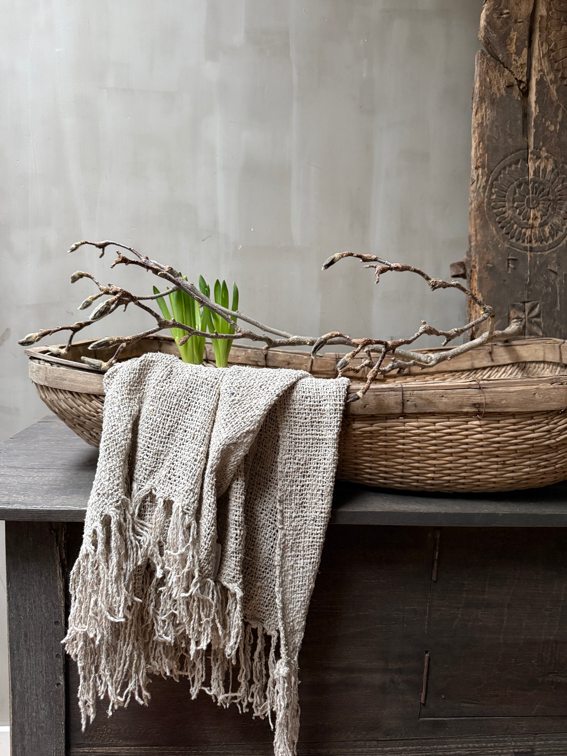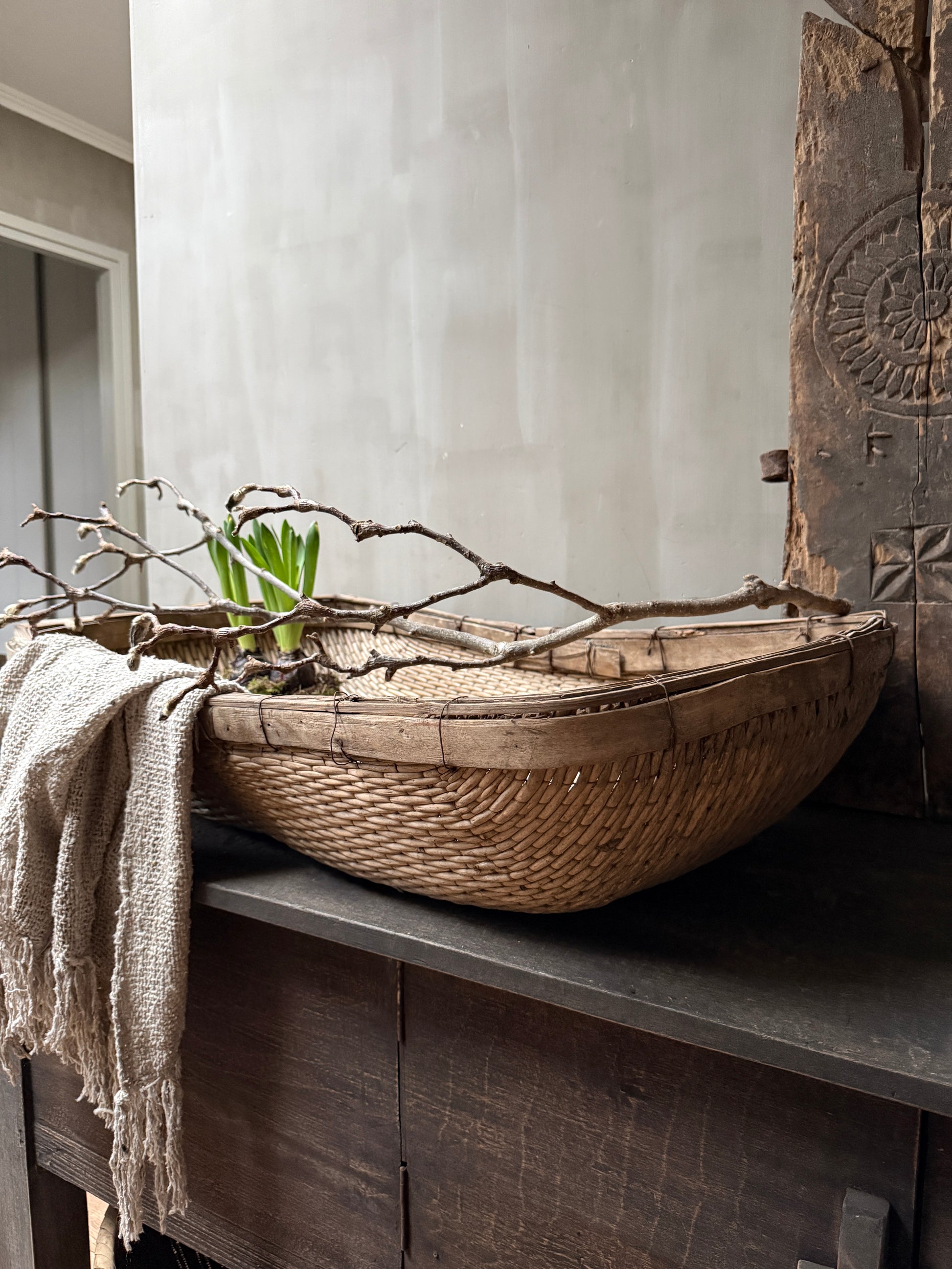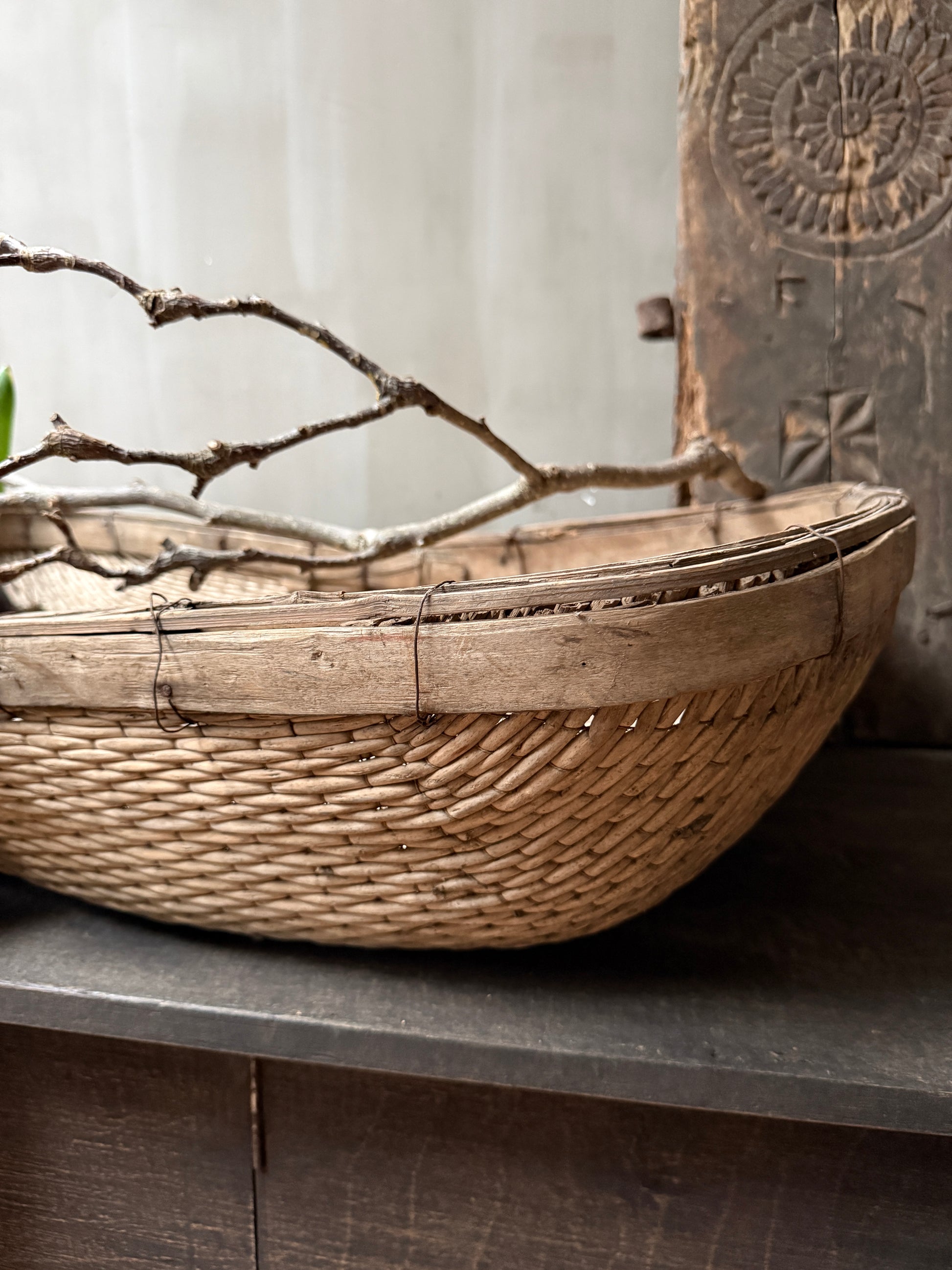 Dieser Korb – ich bin fast sprachlos. Es ist schwer zu beschreiben, wie atemberaubend schön dieser antike, wunderschön gealterte orientalische Reiskorb ist. Diese prächtigen Körbe sind handgeflochten und wurden auf den Reisfeldern verwendet, um den Reis von den Spelzen zu trennen. Ein wahrhaft authentisches, antikes Stück und ein echter Blickfang. Der Korb ist nicht nur äußerst dekorativ, sondern auch perfekt nutzbar. Stellen Sie ihn mit ein paar Kissen und Decken unter das Bett oder den Tisch oder hängen Sie dieses Schmuckstück an die Wand. Damit holen Sie sich ein absolut einzigartiges und wunderschönes Objekt in Ihr Zuhause.