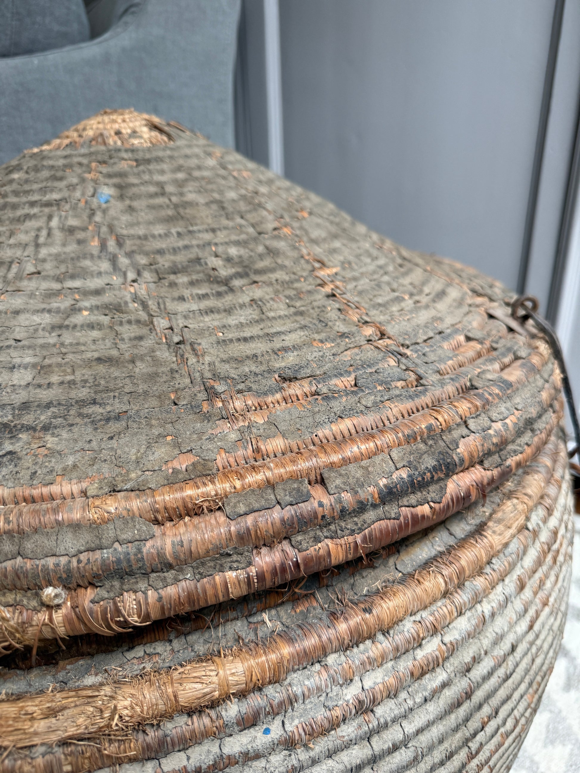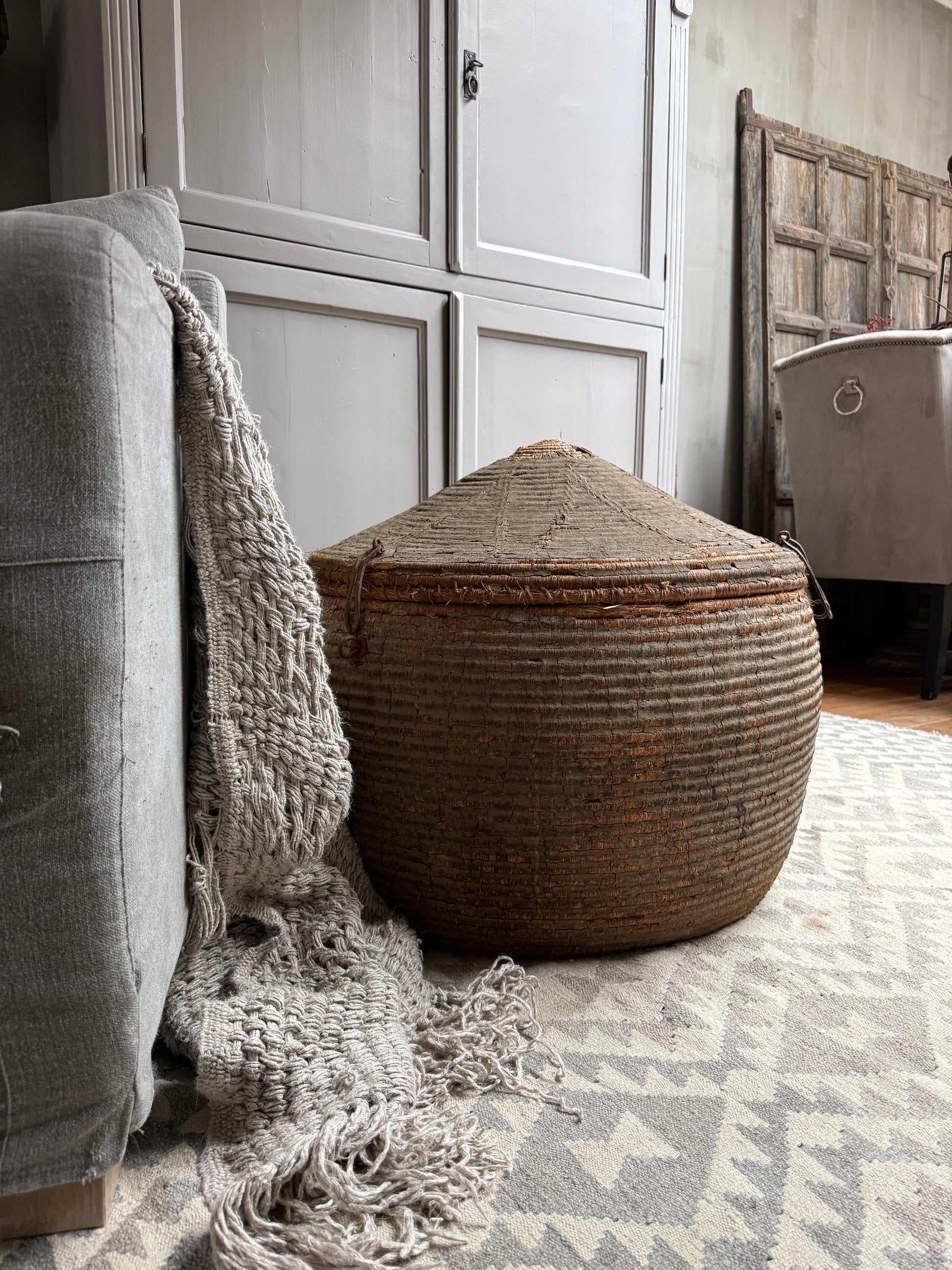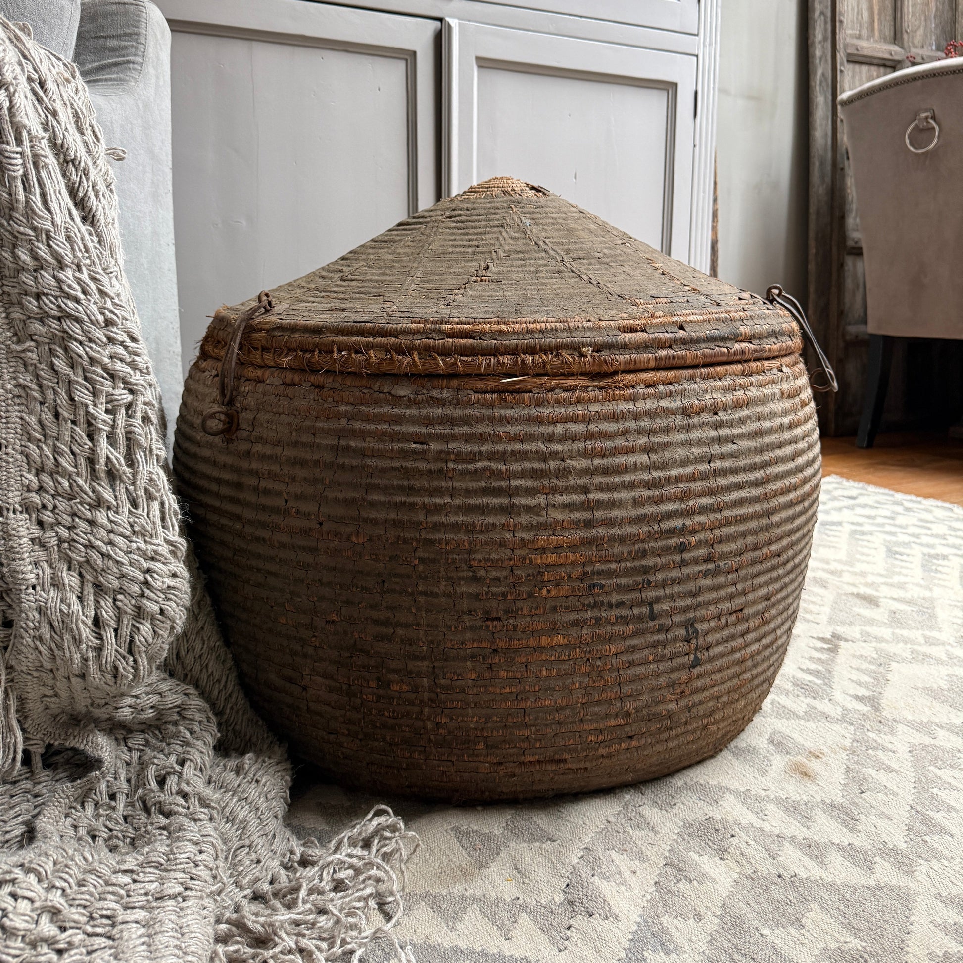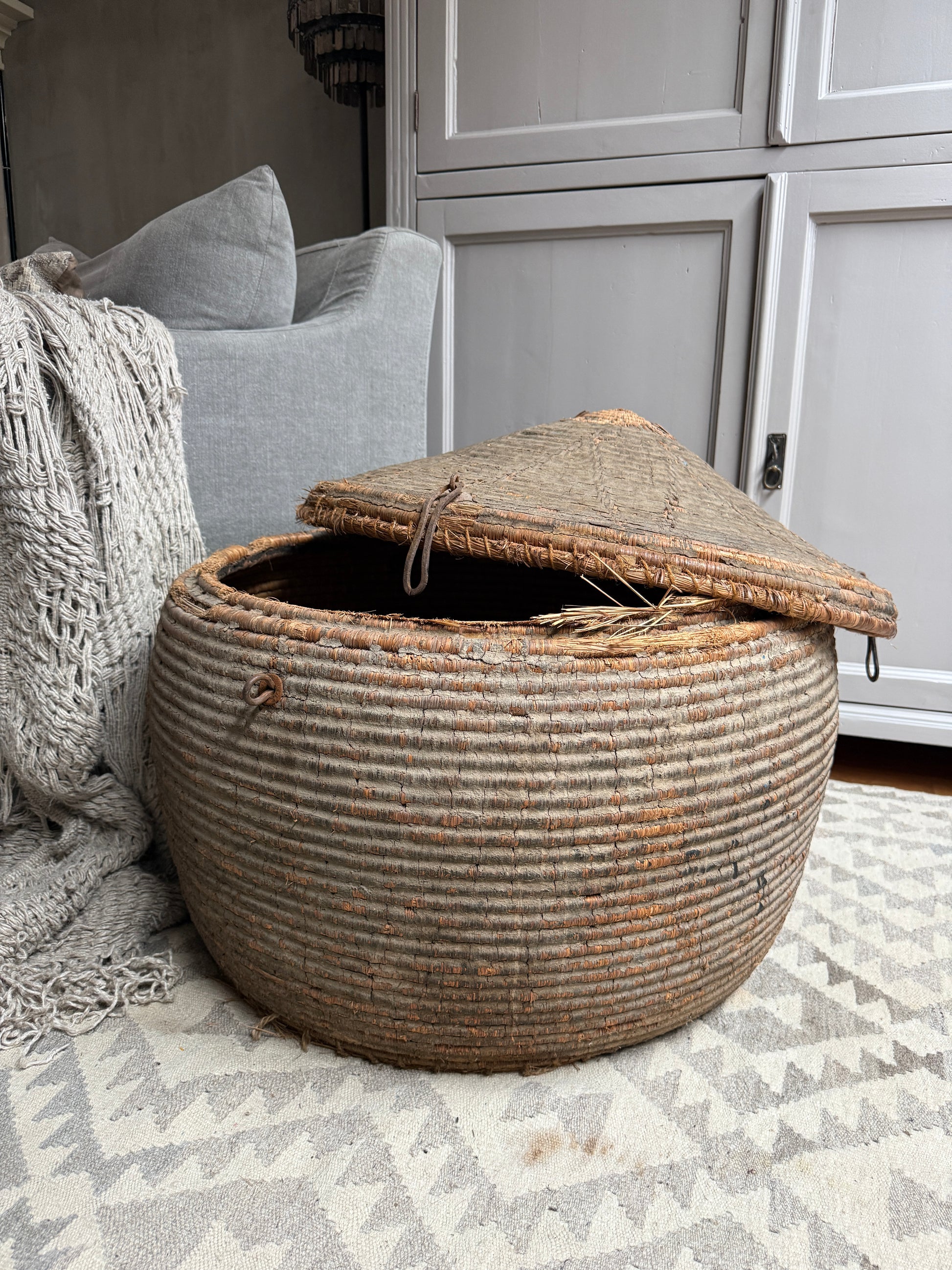 Ein wunderschöner, origineller, großer antiker Korb mit Deckel, der schon etwas verwittert ist – ideal als Dessertkorb. Er erinnert mich ein wenig an einen Korb mit einer Schlange. Ein echter Hingucker! Die Patina ist einfach traumhaft. Jeder dieser Körbe ist ein Unikat. Hätten Sie vielleicht einen Platz für dieses Prachtstück?