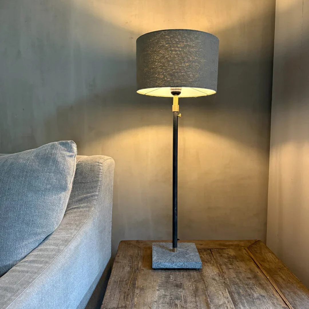 Natürliche, schwarz-graue Tischleuchte mit Steinsockel. Die Leuchte ist höhenverstellbar (50–70 cm).
