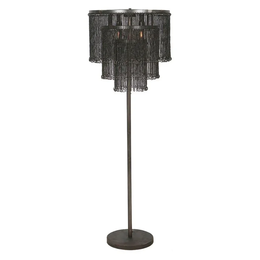 Eine wunderschöne Stehlampe aus Hunderten schwarzer Ketten. Ein wahres Schmuckstück, das jeden Raum in etwas Besonderes verwandelt. Beleuchtet bietet sie einen atemberaubenden Anblick an der Wand.