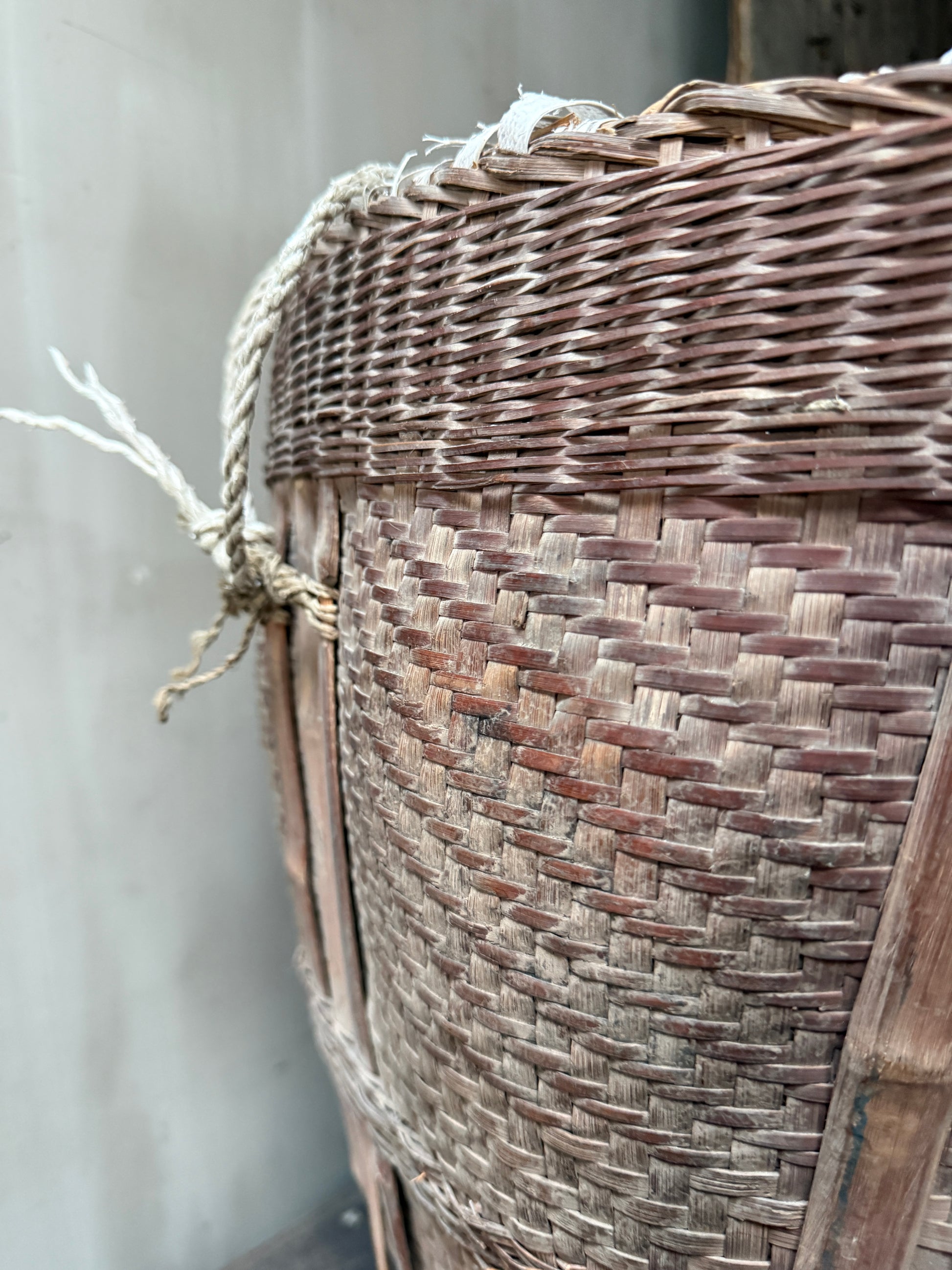 Beautiful original old Chinese wicker basket. Beautiful large authentic weathered wicker basket from China. The original colored rope can be removed if desired.
