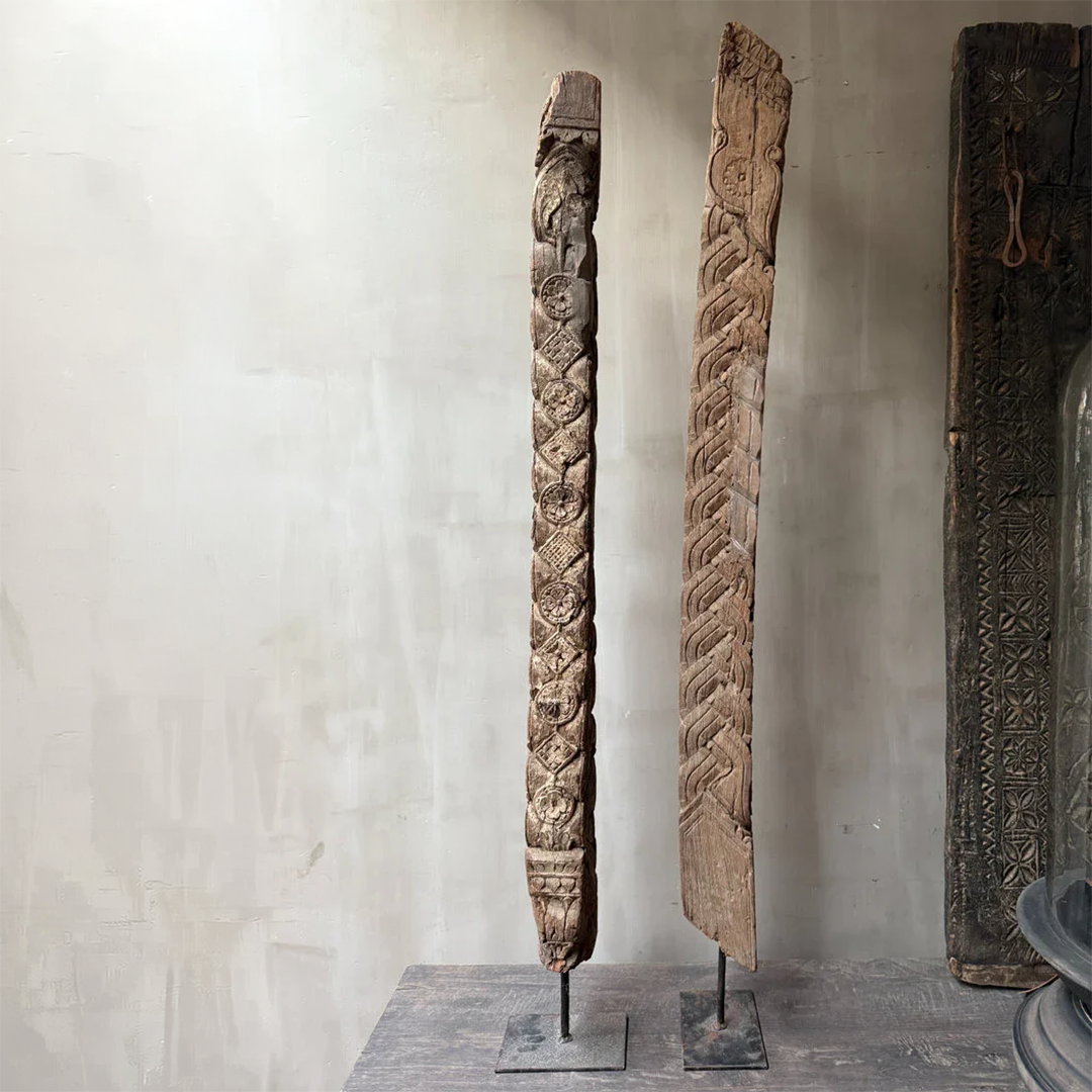 Beautiful wooden ornament with carvings on a base. These are the kind of items that make my heart leap for joy. You won't find another one like this. The wood of this ornament is beautifully aged, lived-in, and weathered, and exudes ambiance. A true eye-catcher for your interior. It would look lovely, for example, in the windowsill if you have a large, high window. Its size also makes it a perfect floor stand. Or let it be a true centerpiece and give it a prominent place on a beautiful table. Bring something truly unique into your home with this beautiful ornament.