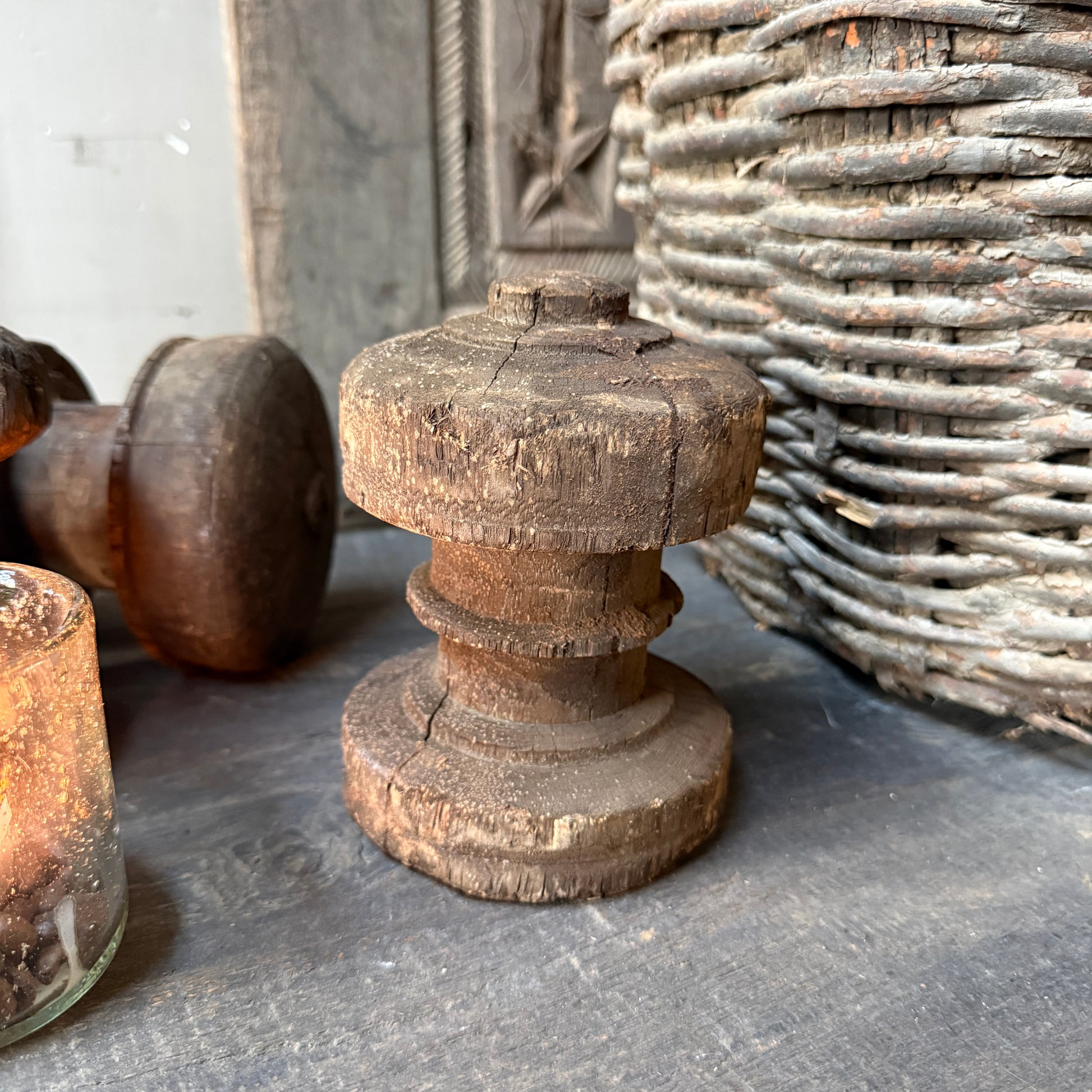Cute old wooden bobbin. Beautifully weathered wood. Great for decorating.
