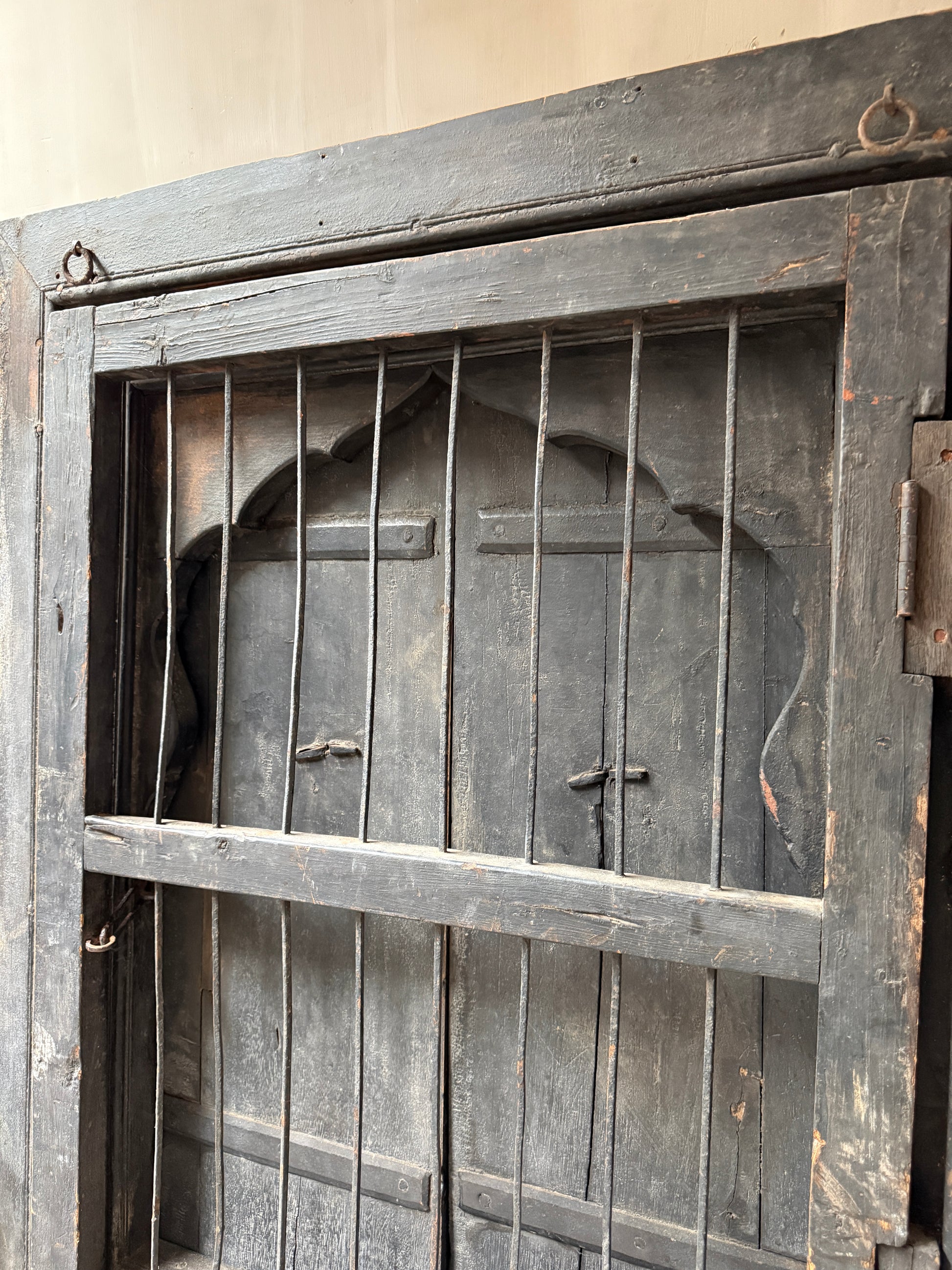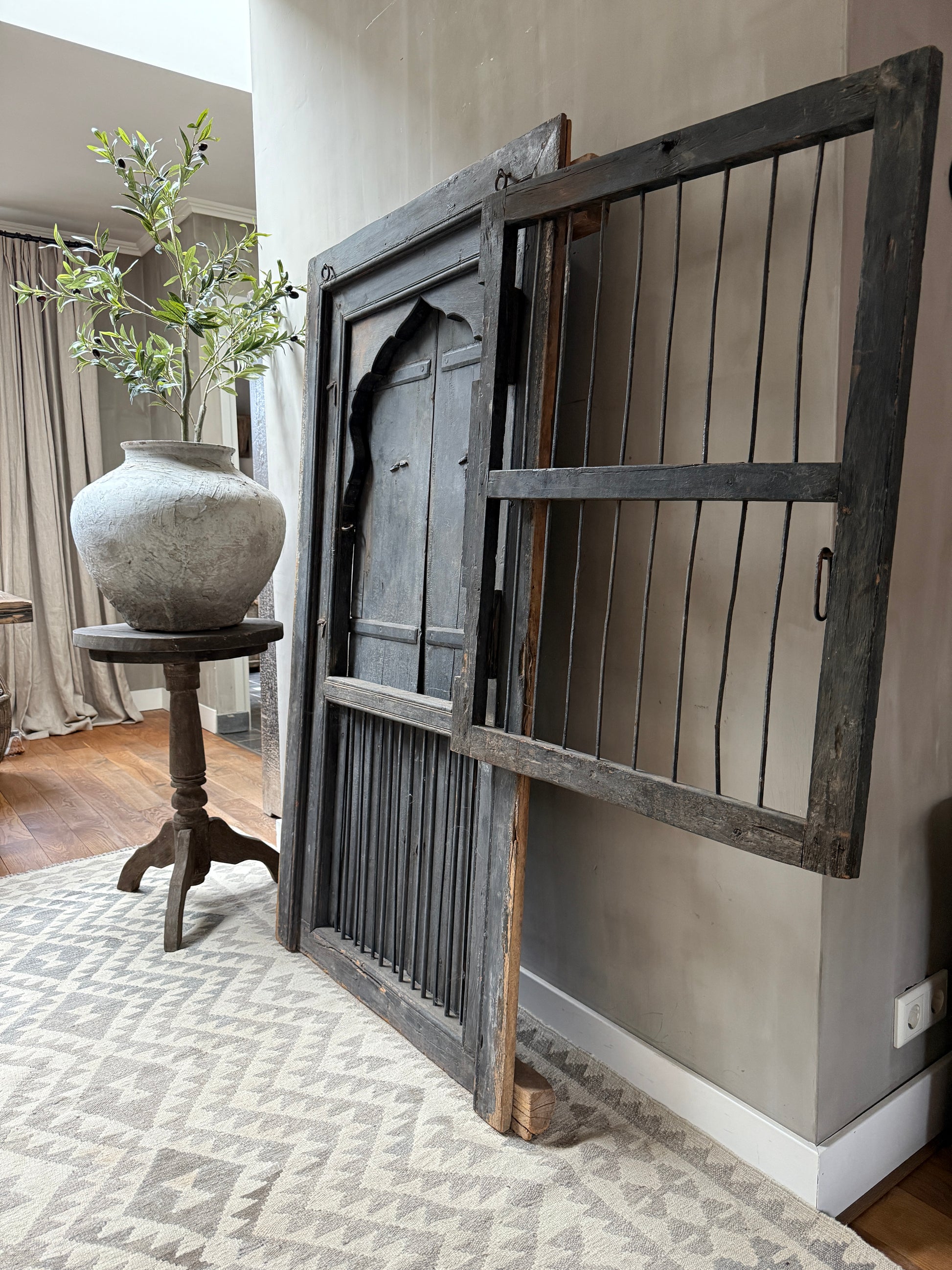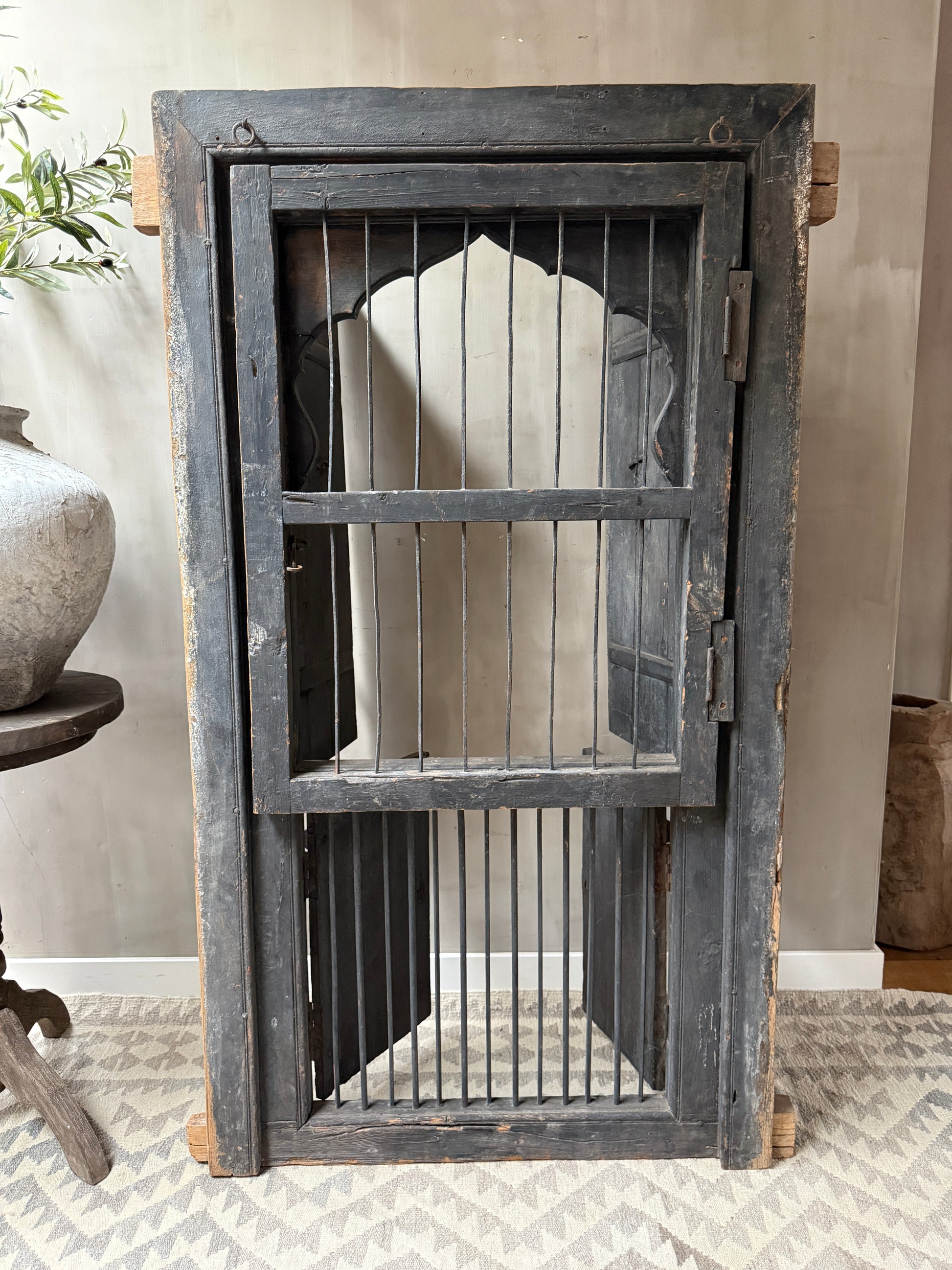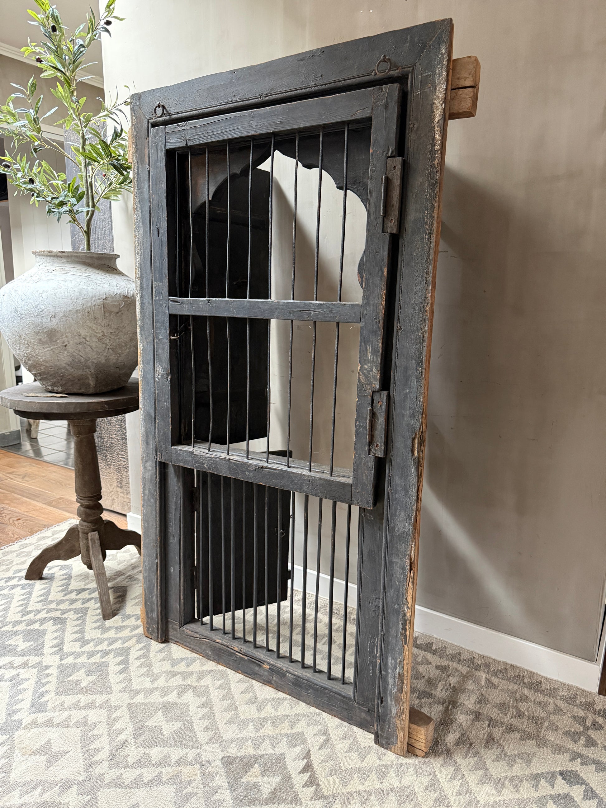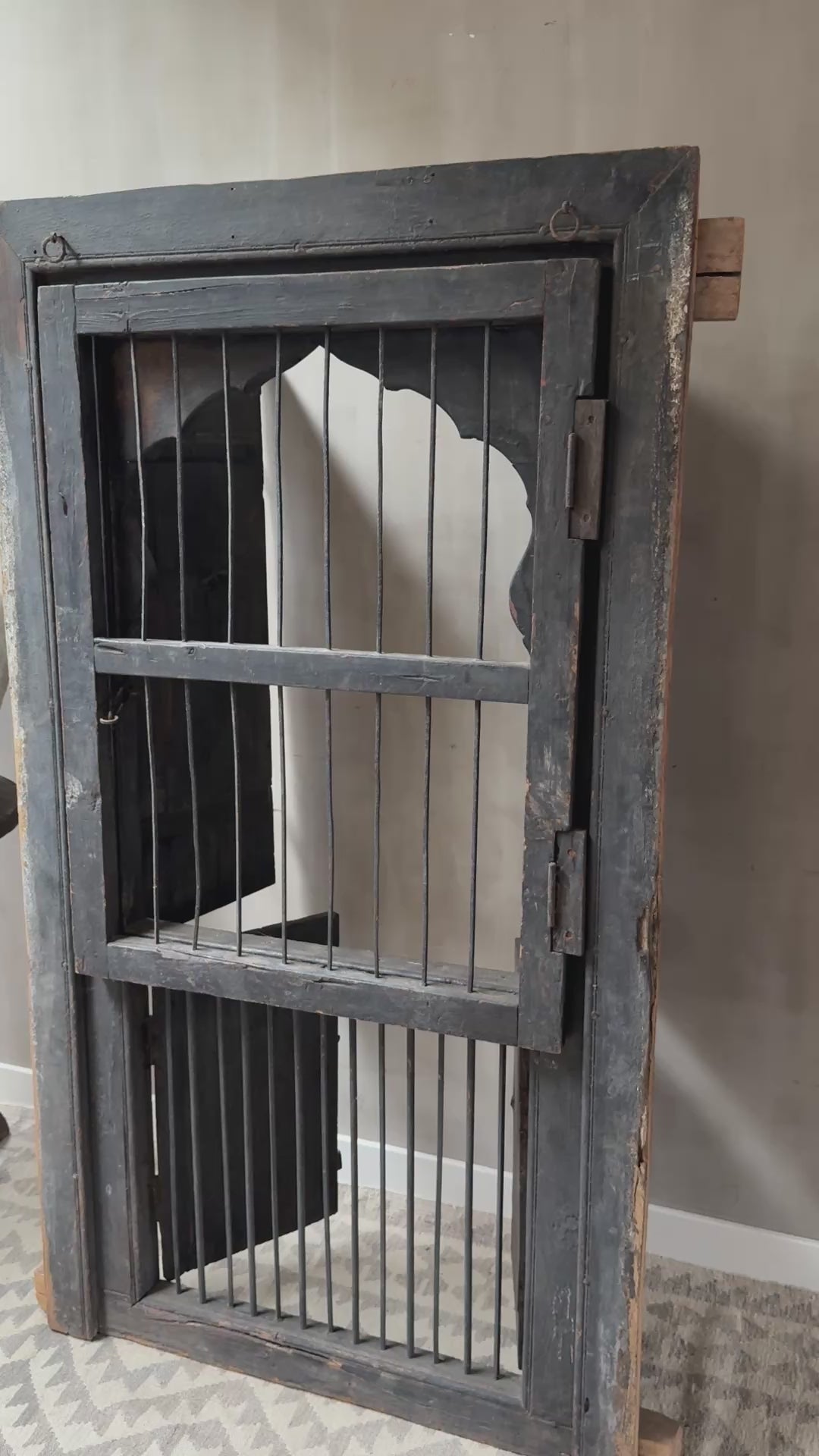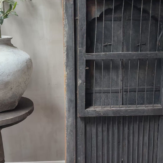 Geweldig mooi authentieke, zeer unieke houten deuren set met uit India. Echt een uniek item en heel decoratief. Deze luiken waren ooit gewoon onderdeel van een huis of gebouw in India, het blijft bijzonder. Hij is groot genoeg om hem op de grond tegen de muur te plaatsen maar is ook heel mooi op een wandkast. De deuren kunnen zowel aan de tralies kant als aan de achterkant open. Wat een eyecatcher!