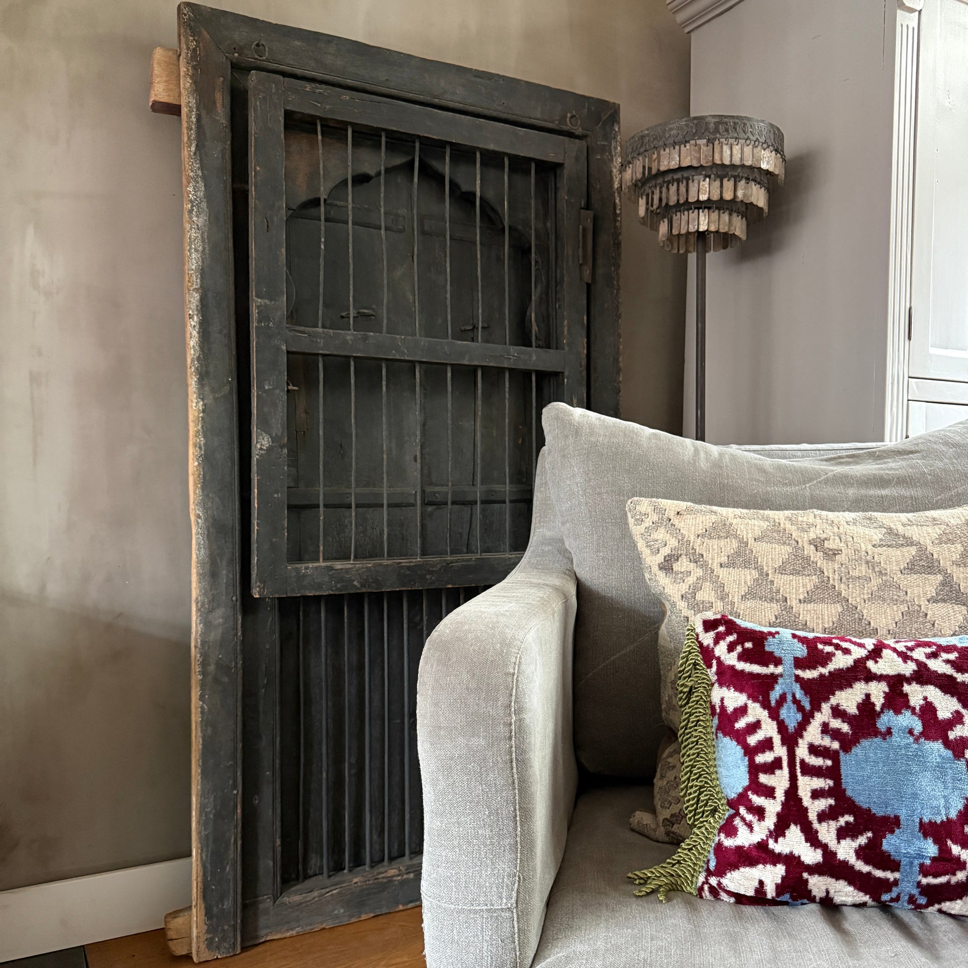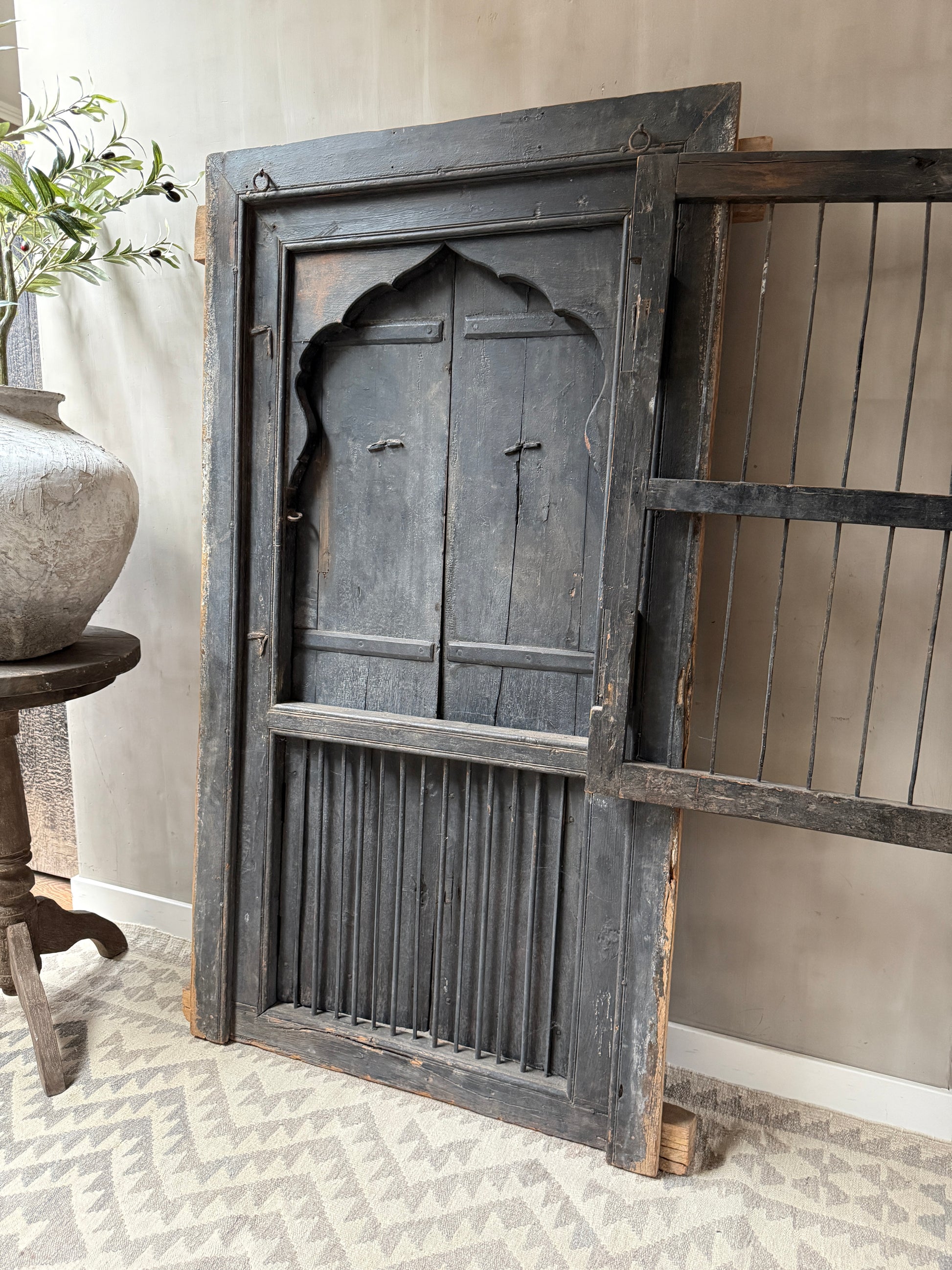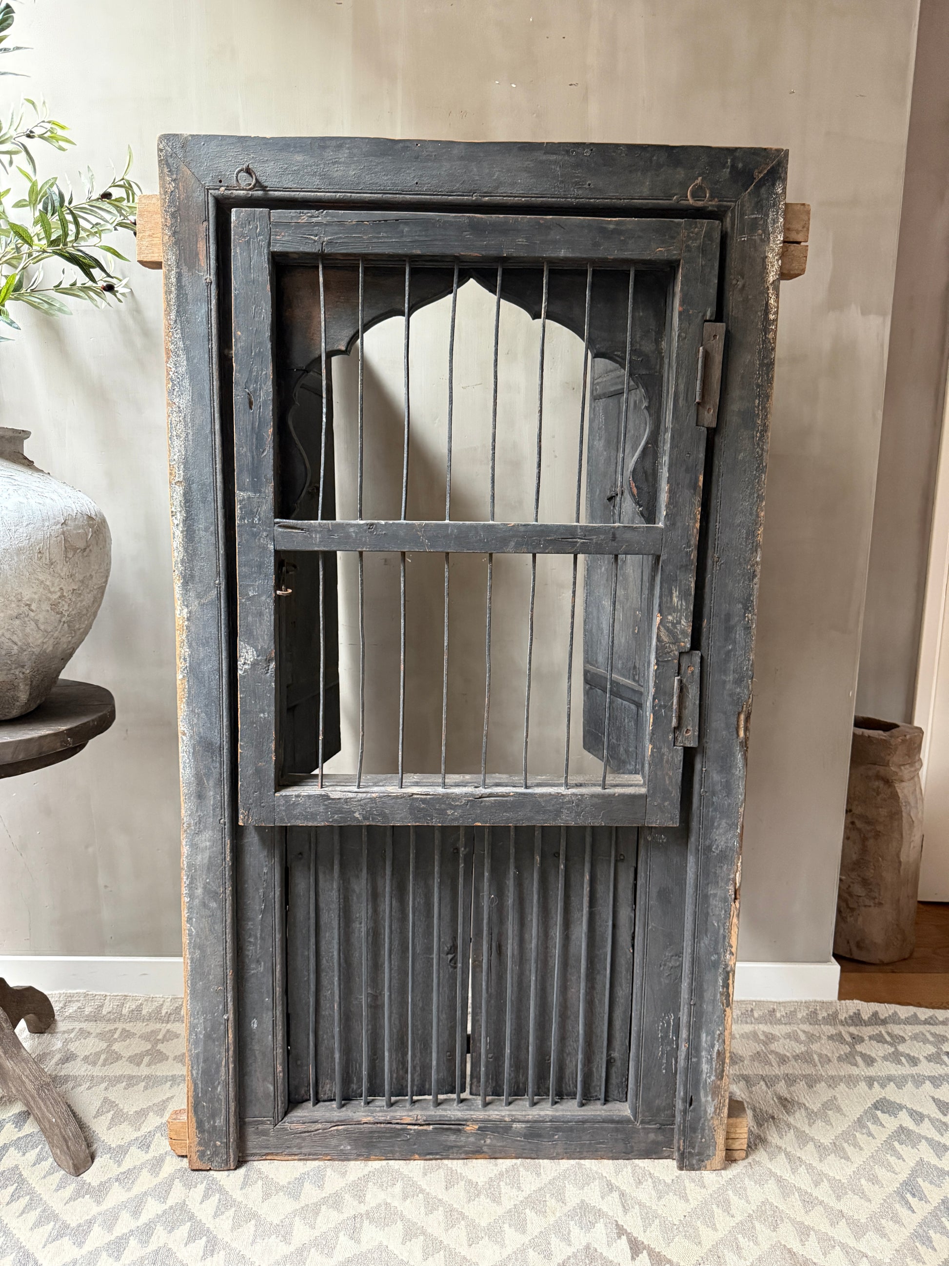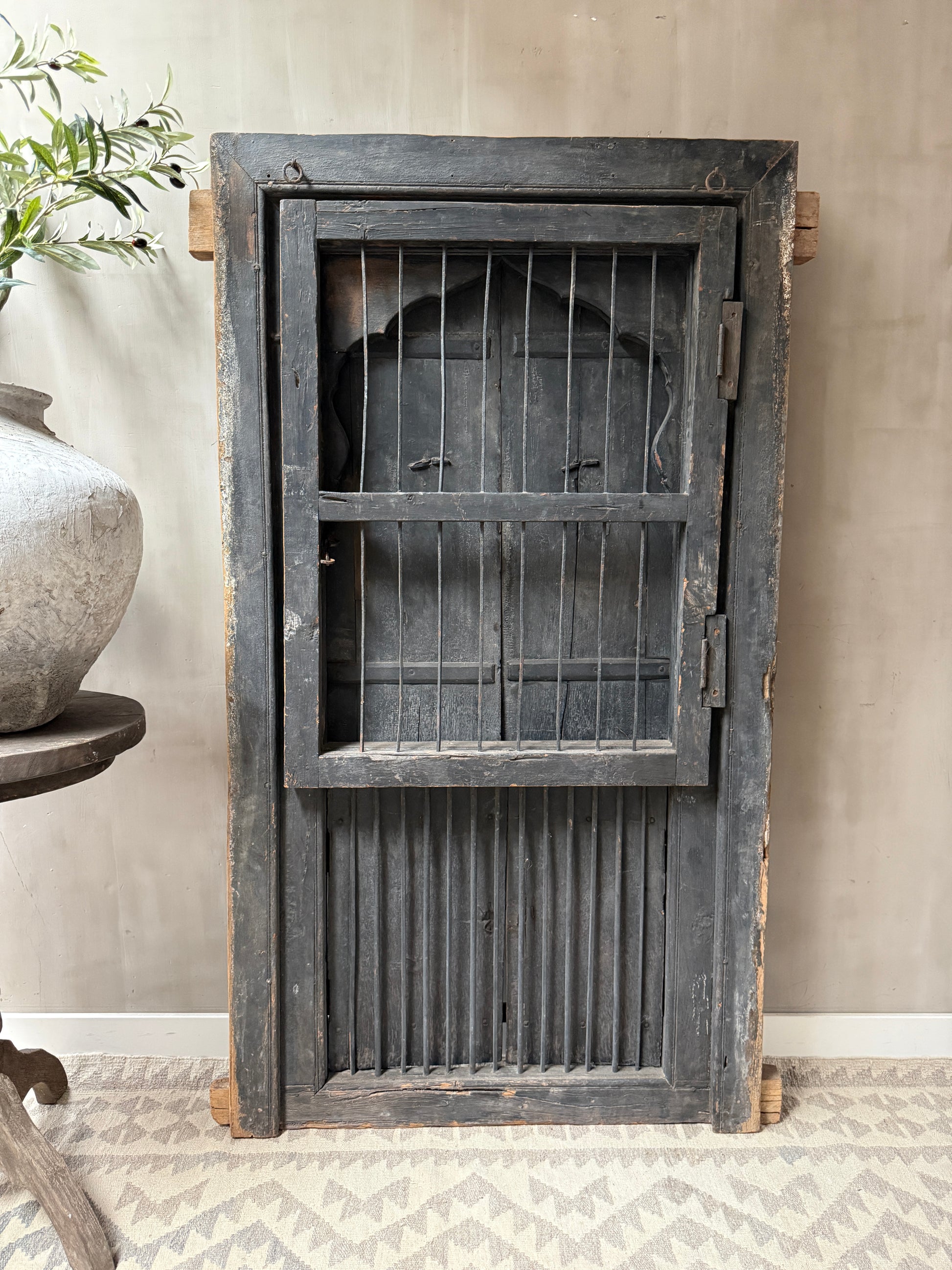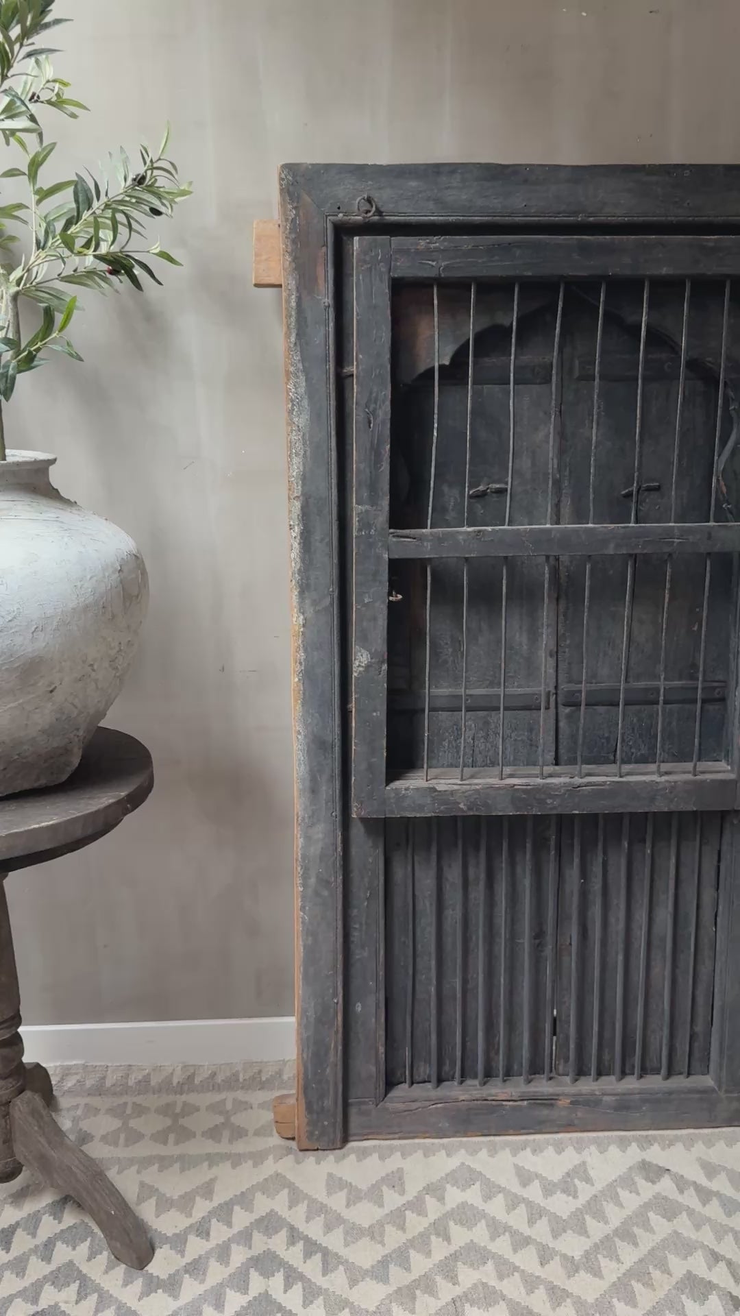 Geweldig mooi authentieke, zeer unieke houten deuren set met uit India. Echt een uniek item en heel decoratief. Deze luiken waren ooit gewoon onderdeel van een huis of gebouw in India, het blijft bijzonder. Hij is groot genoeg om hem op de grond tegen de muur te plaatsen maar is ook heel mooi op een wandkast. De deuren kunnen zowel aan de tralies kant als aan de achterkant open. Wat een eyecatcher!