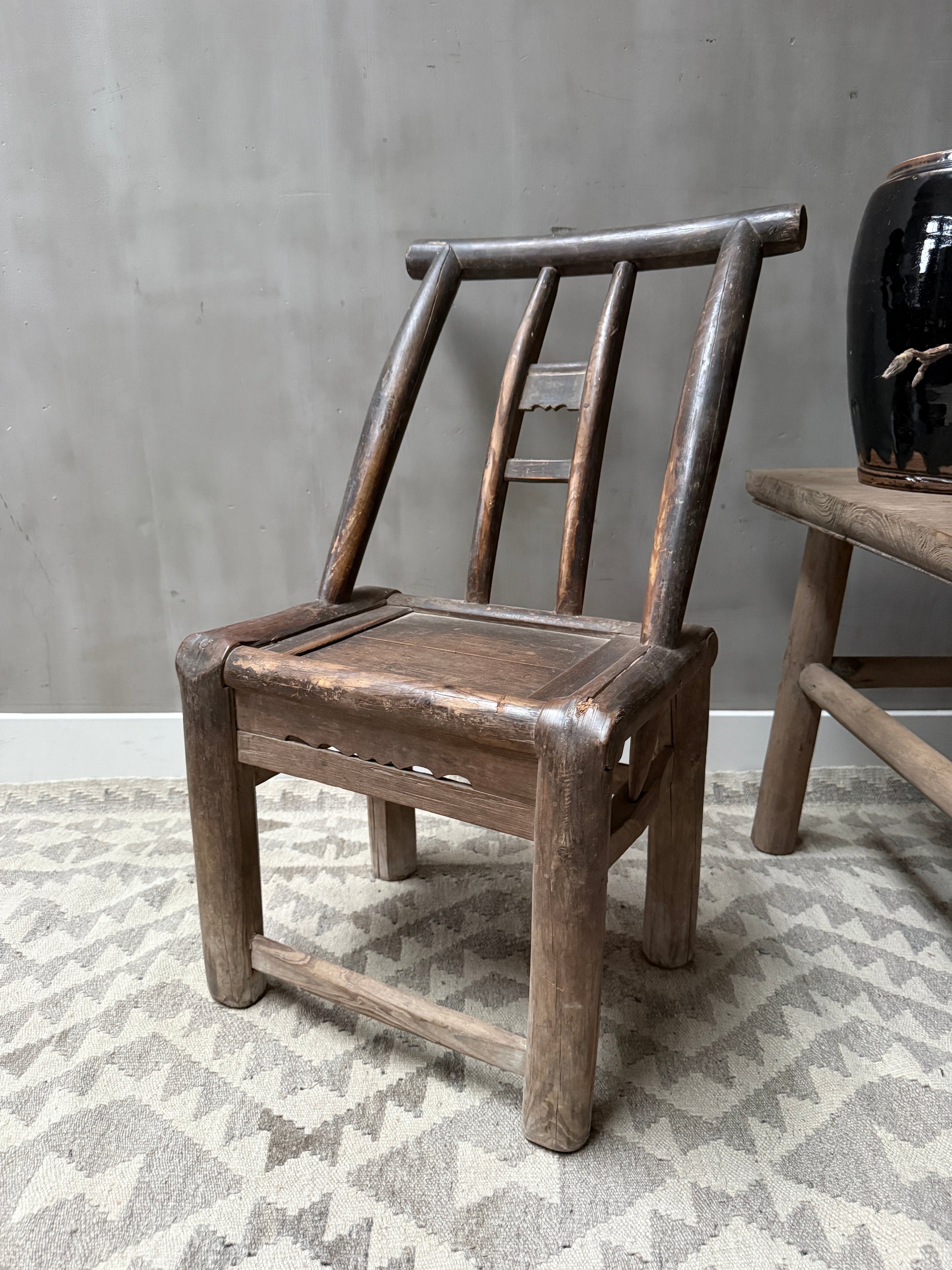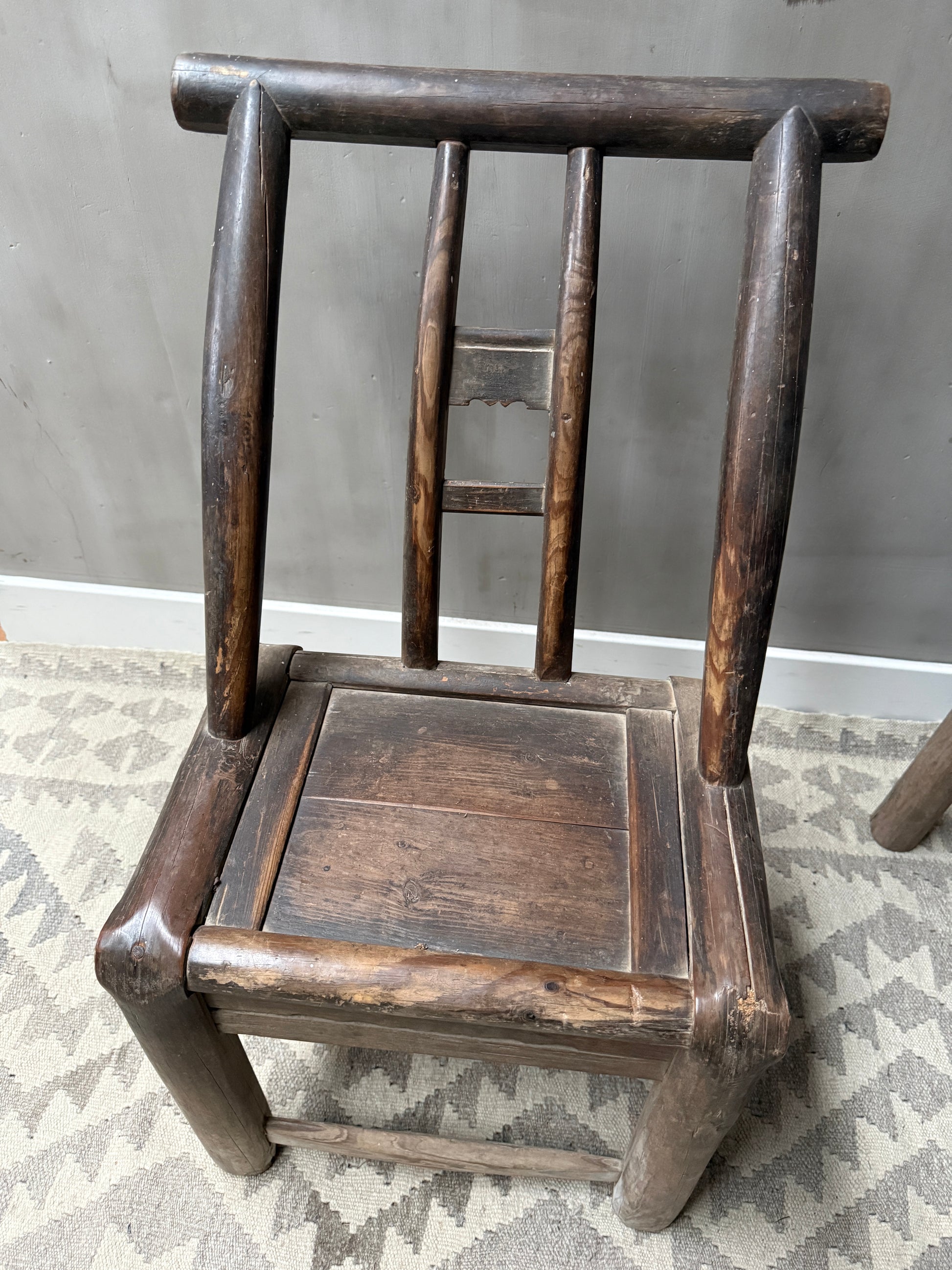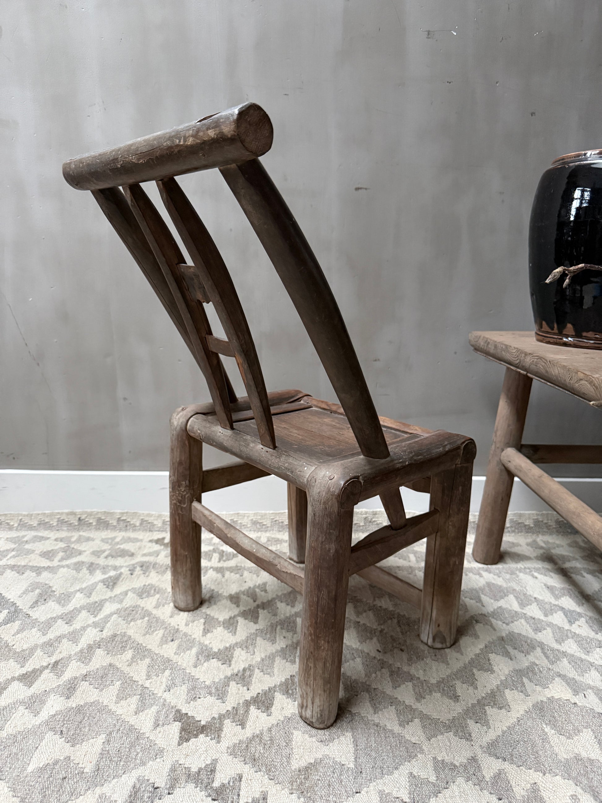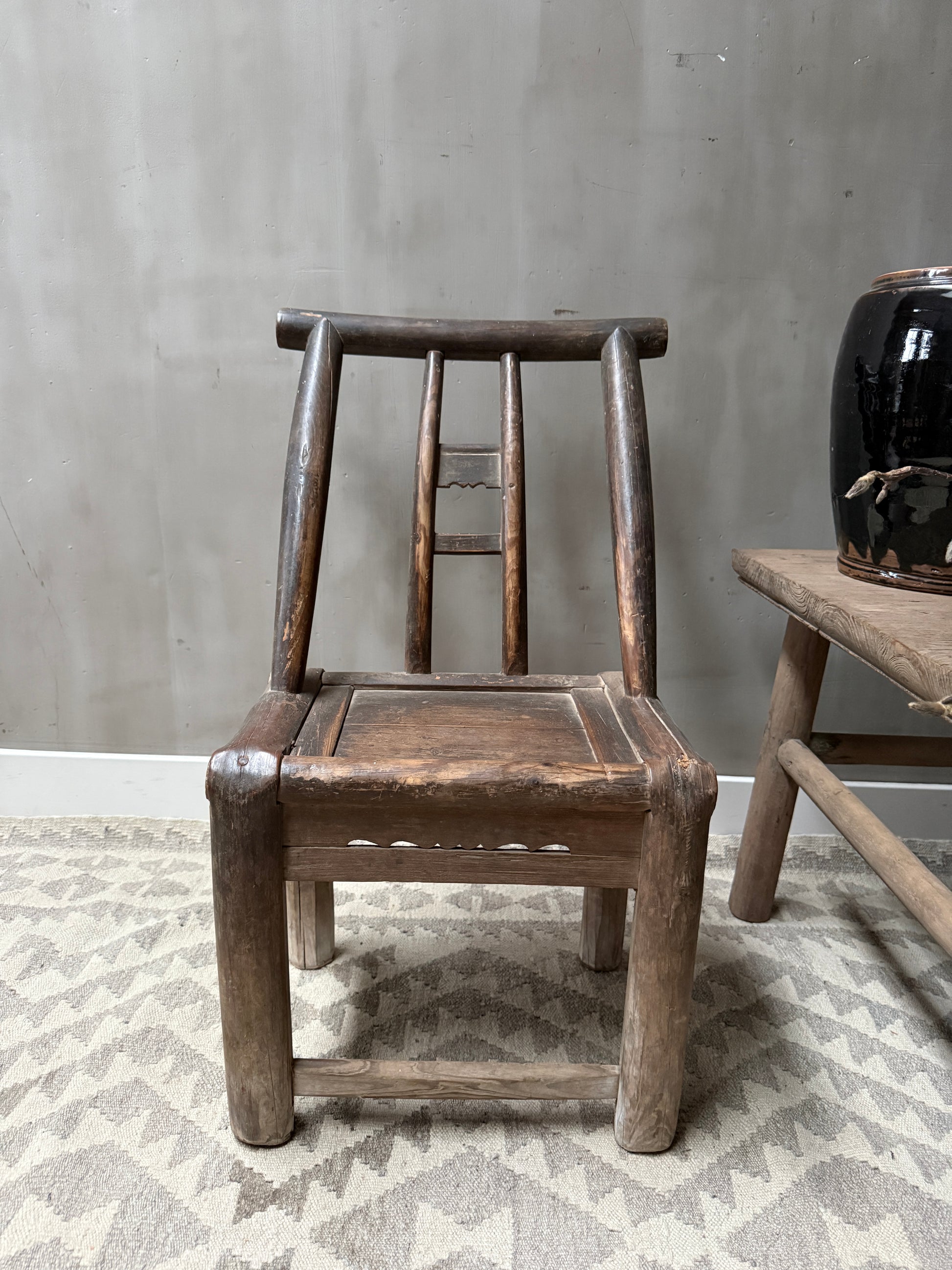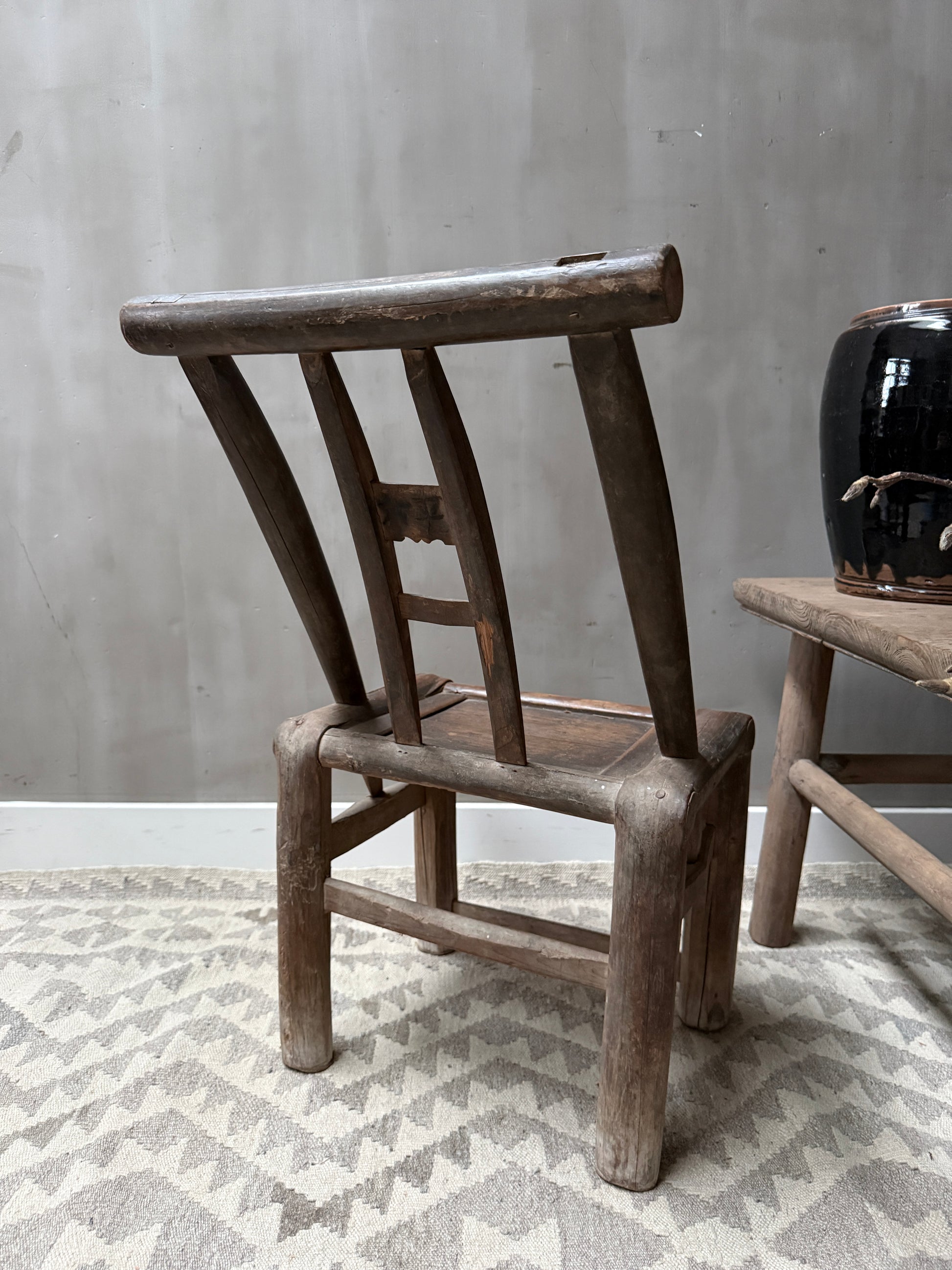 Prachtige oud Chinees stoeltje! Dit type wordt vaak aangeduid als een Chinese houten armloze stoel, soms farmer's chair of minyi jiaoyi. Deze stoeltjes werden gemaakt van elm of populier hout. Geen lak, maar een natuurlijke patina door jaren van gebruik. De sporen van tijd zijn zichtbaar in elke nerf, elke verkleuring en elk detail. Elke imperfectie in het hout is als een herinnering, een bewijs dat deze tafel heeft geleefd. Juist dat maakt het zo puur en waardevol. Wabi sabi in zijn mooiste vorm. Dit is geen meubel. Dit is een verhaal.