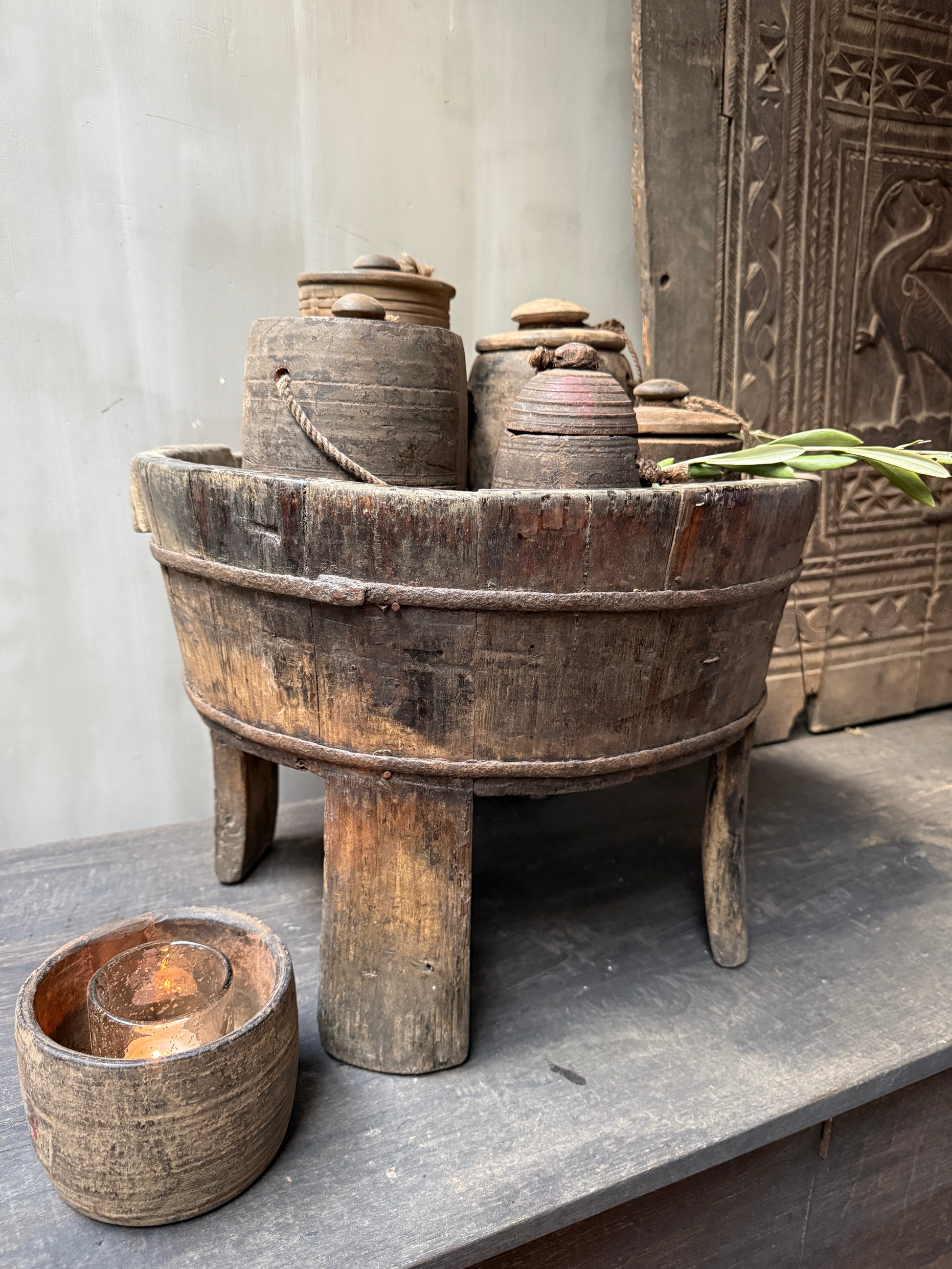 Hout hout en nog eens hout! En dat kan zo ontzettend goed in de sobere woonstijl, heel veel hout combineren. Prachtige set van mooie oude olijfbak op pootjes gevuld met mooie oude houten kruikjes met deksel. Als tegenhanger een klein takje vers groen en een leuk houten bakje met windlichtje. En het leuke is, deze items zijn individueel ook allemaal geweldig en altijd overal goed te stijlen! En een set is altijd voordeliger, dubbel winst!