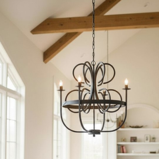 Prachtige landelijke zwart ijzeren kroonluchter met 6 armen. Voorzien van een zwarte ketting en halfronde (bolvormige) zwarte canopy. Een juweel van een lamp, maakt van iedere ruimte iets speciaals. Geeft een prachtig schouwspel op de muur als lamp brand.