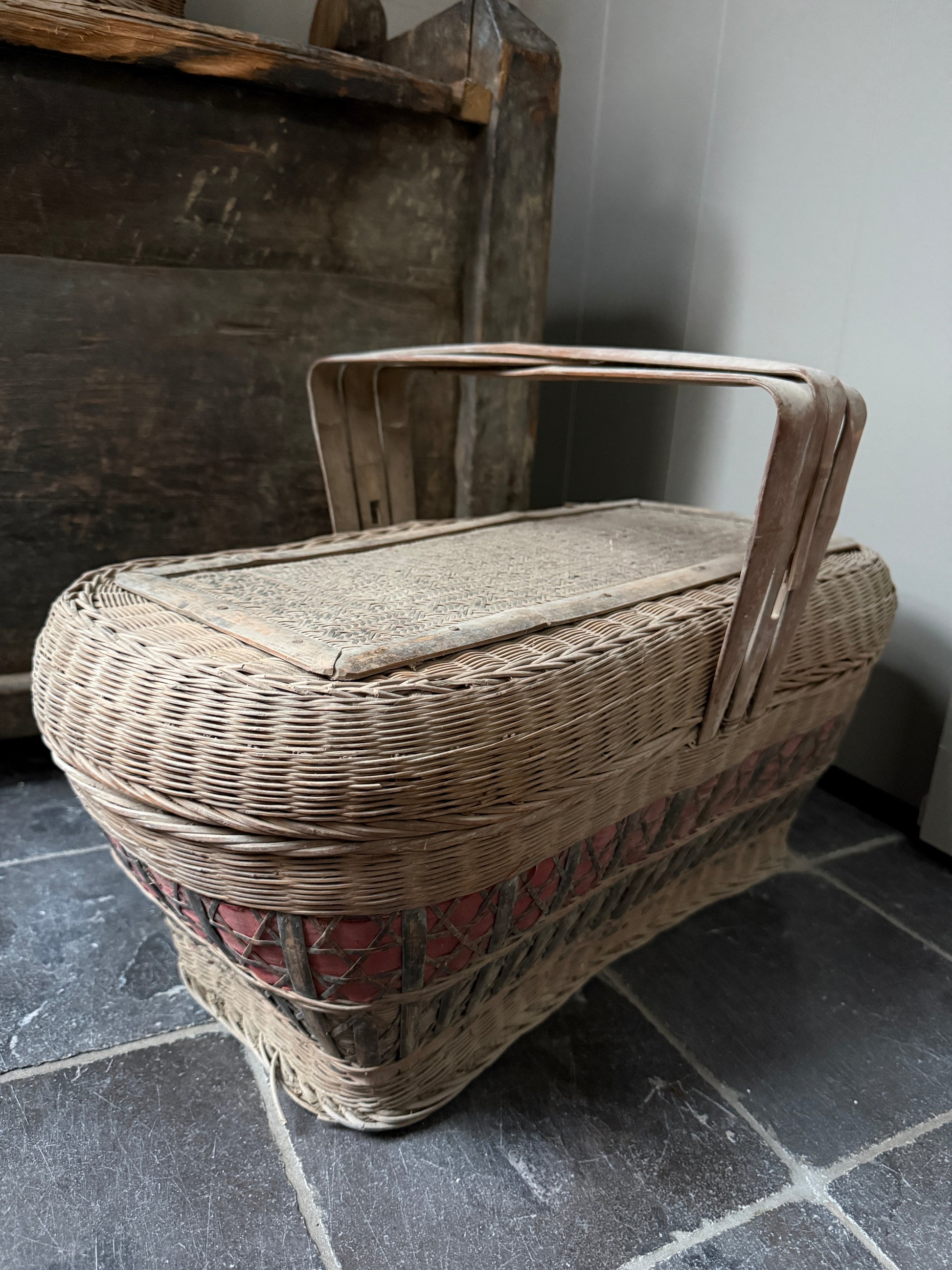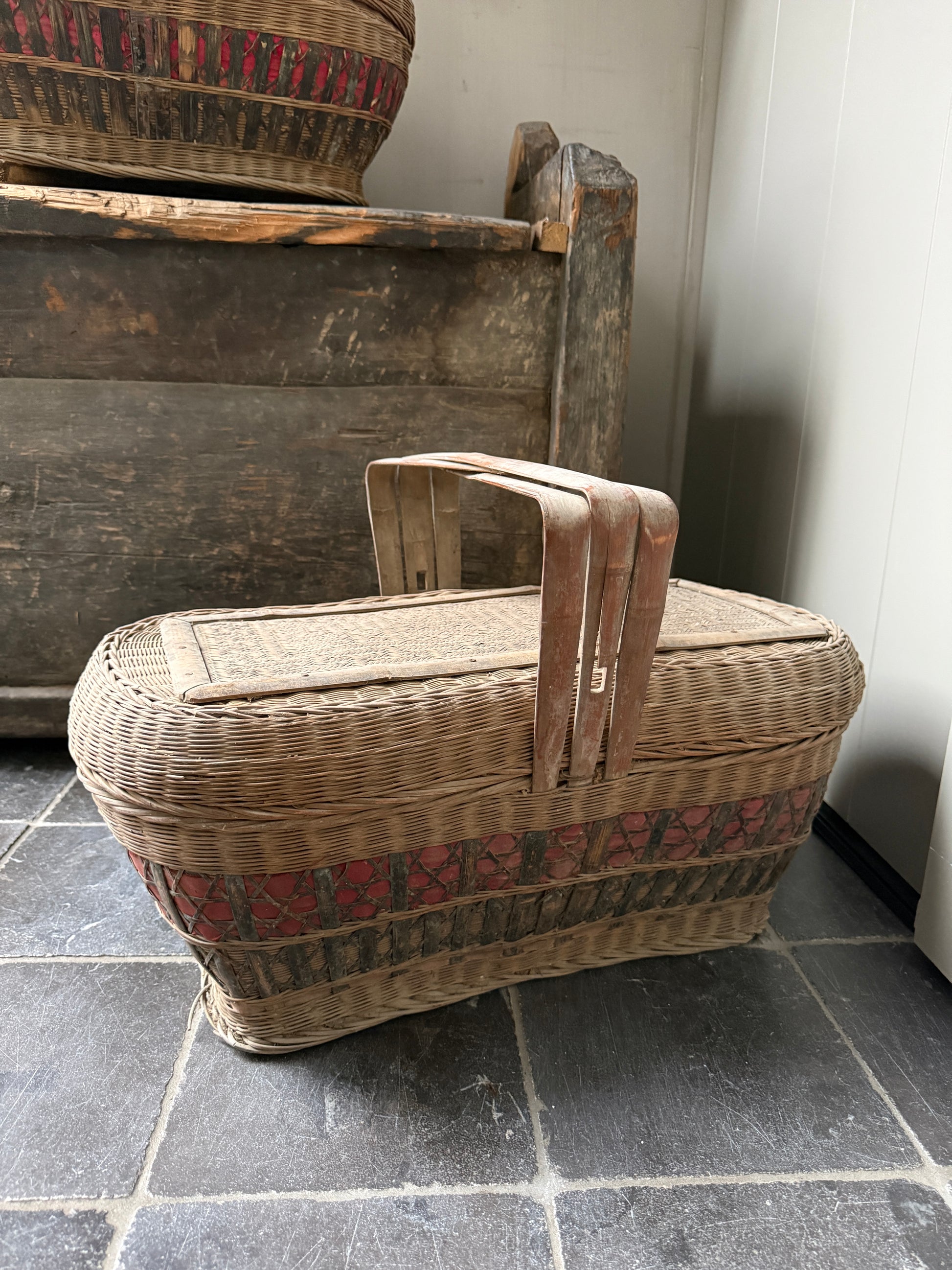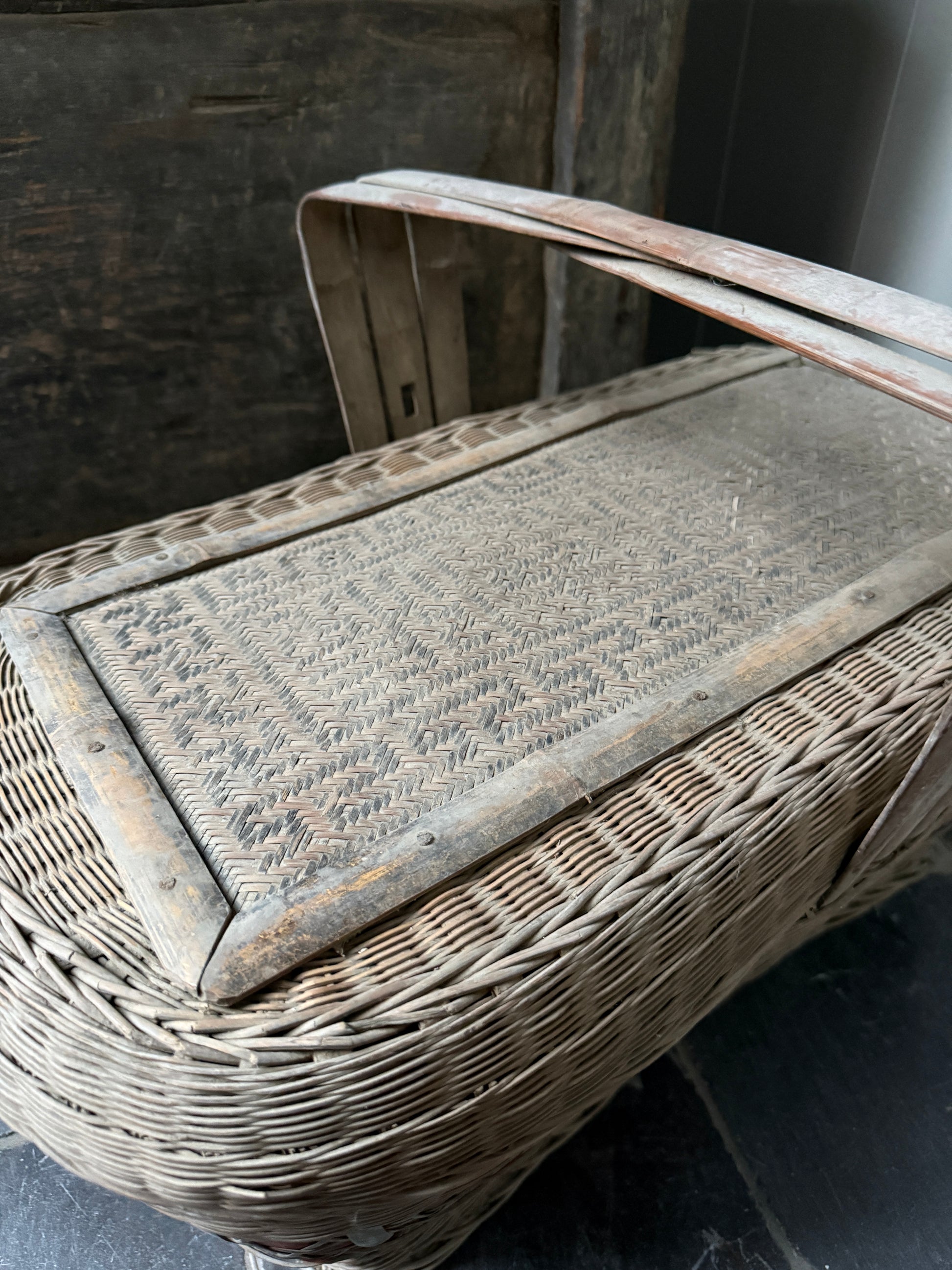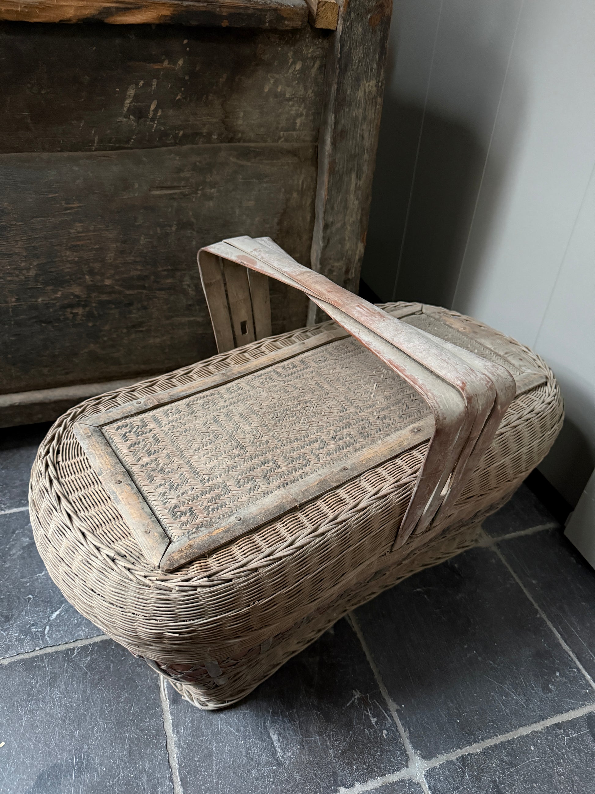 Deze mand, ik heb er bijna geen woorden voor, het is lastig uit te leggen hoe indrukwekkend mooi deze antieke prachtig vergrijsde mand met deksel en hengsel is. De mand heeft een mooi werk in de deksel en is een oude picknickmand of transportmand. Deze prachtige manden zijn handgevlochten. Absoluut een authentiek item met prachtig patina en een echte eye catcher. De mand is zeer decoratief maar ook nog goed te gebruiken. Hiermee haal je absoluut een uniek en prachtig item in huis.