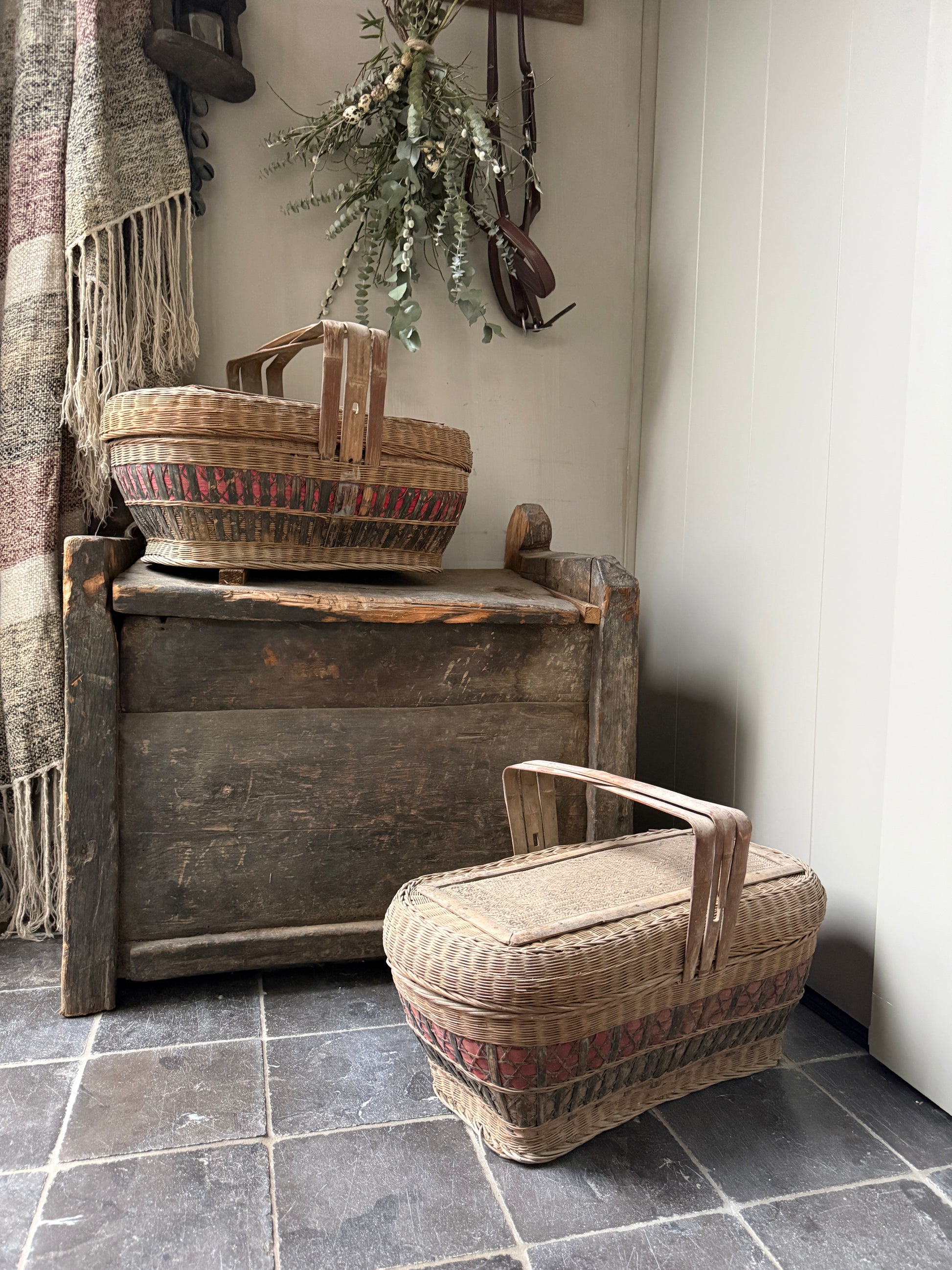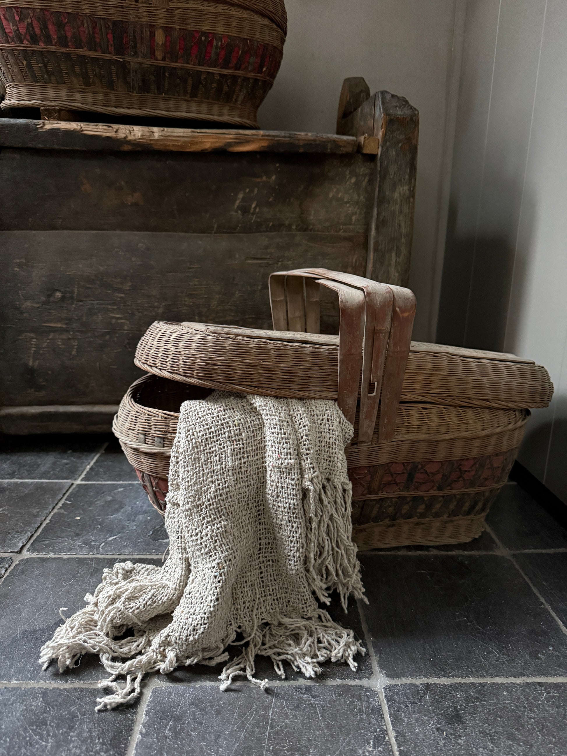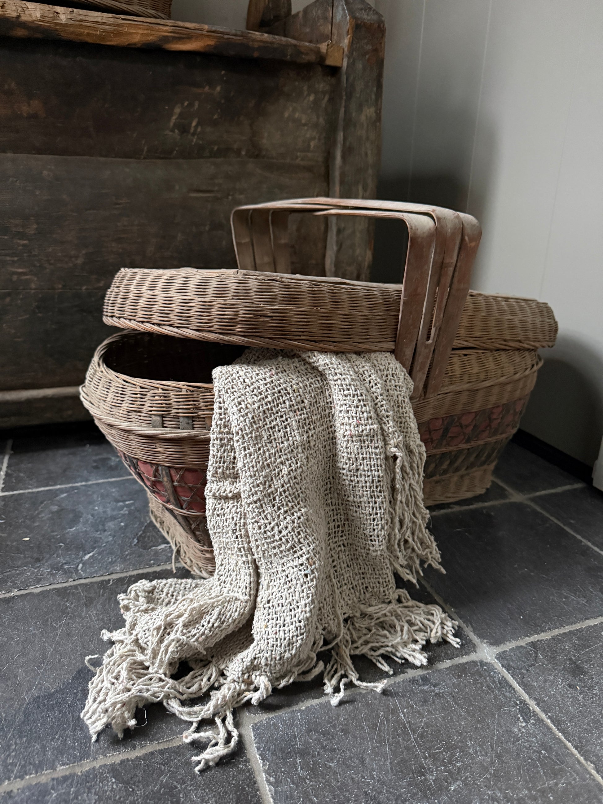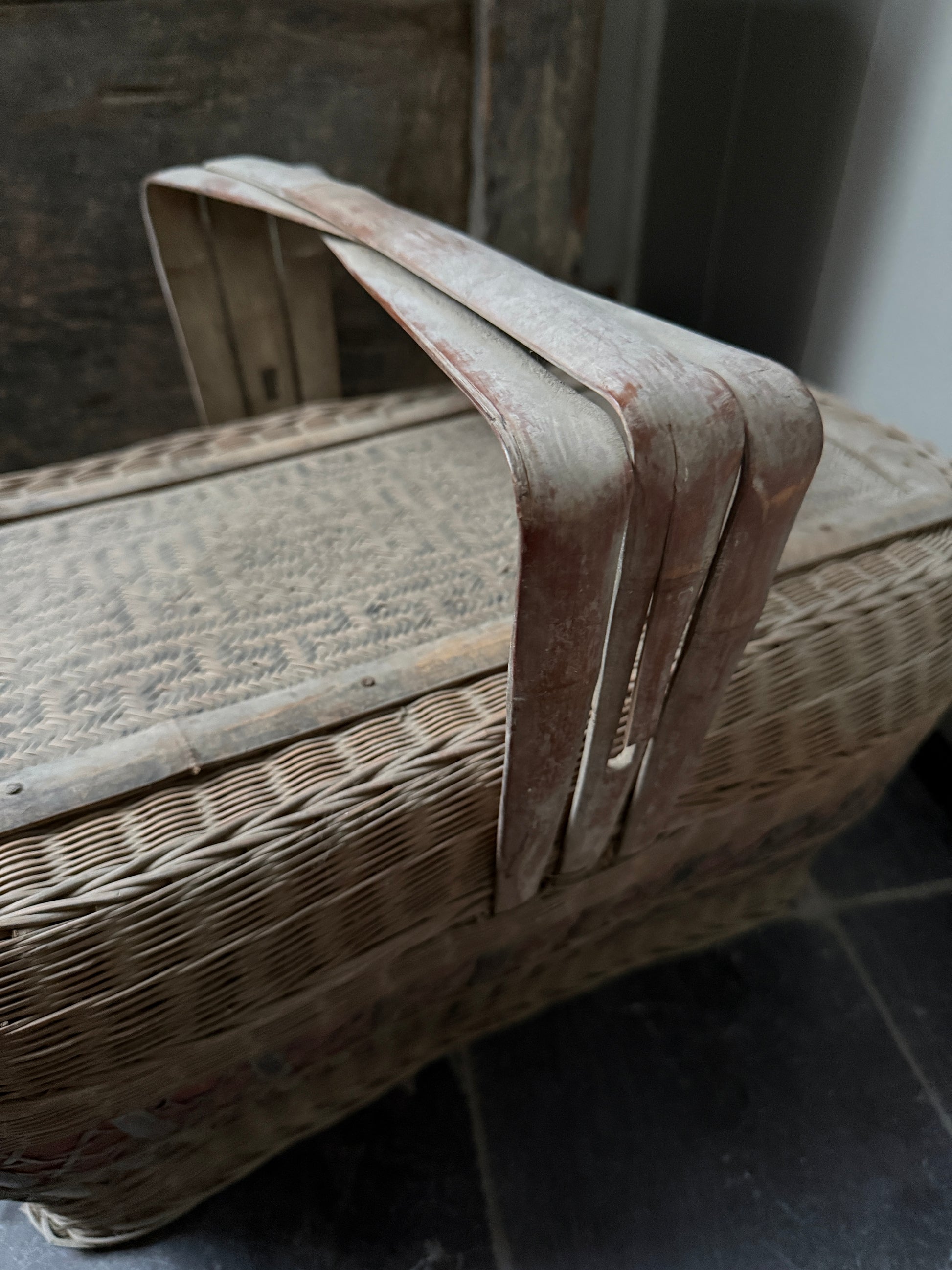 Deze mand, ik heb er bijna geen woorden voor, het is lastig uit te leggen hoe indrukwekkend mooi deze antieke prachtig vergrijsde mand met deksel en hengsel is. De mand heeft een mooi werk in de deksel en is een oude picknickmand of transportmand. Deze prachtige manden zijn handgevlochten. Absoluut een authentiek item met prachtig patina en een echte eye catcher. De mand is zeer decoratief maar ook nog goed te gebruiken. Hiermee haal je absoluut een uniek en prachtig item in huis.