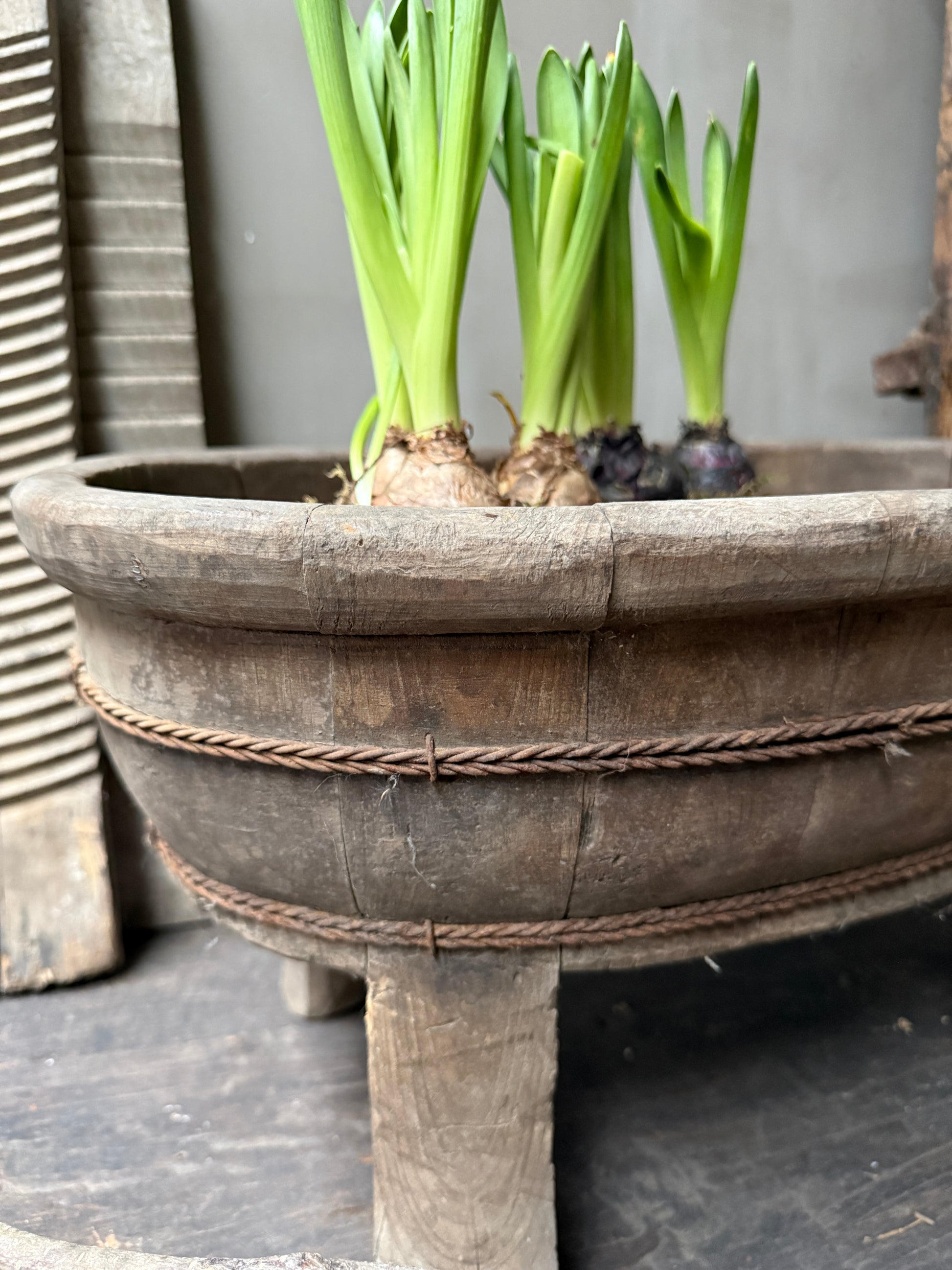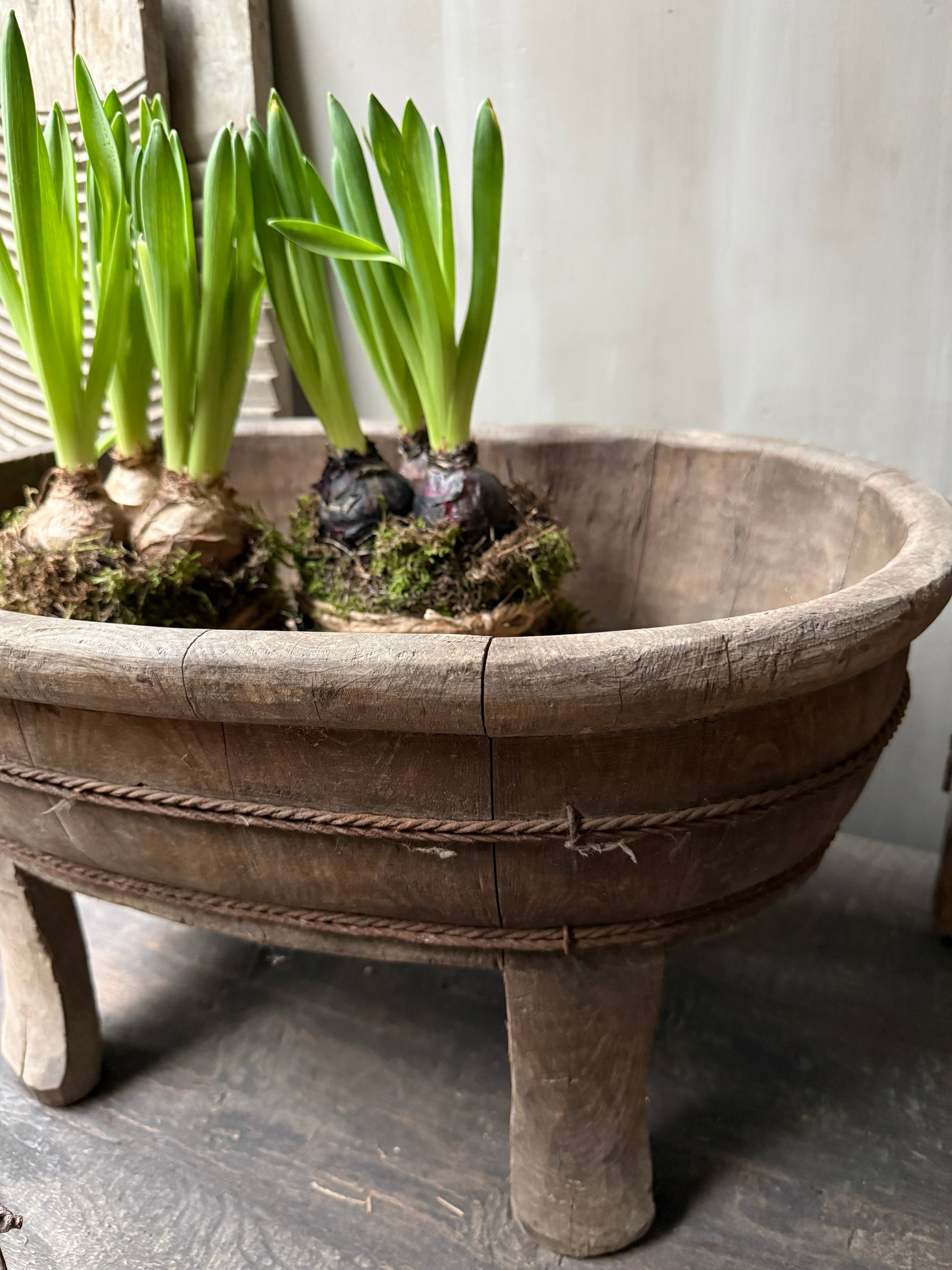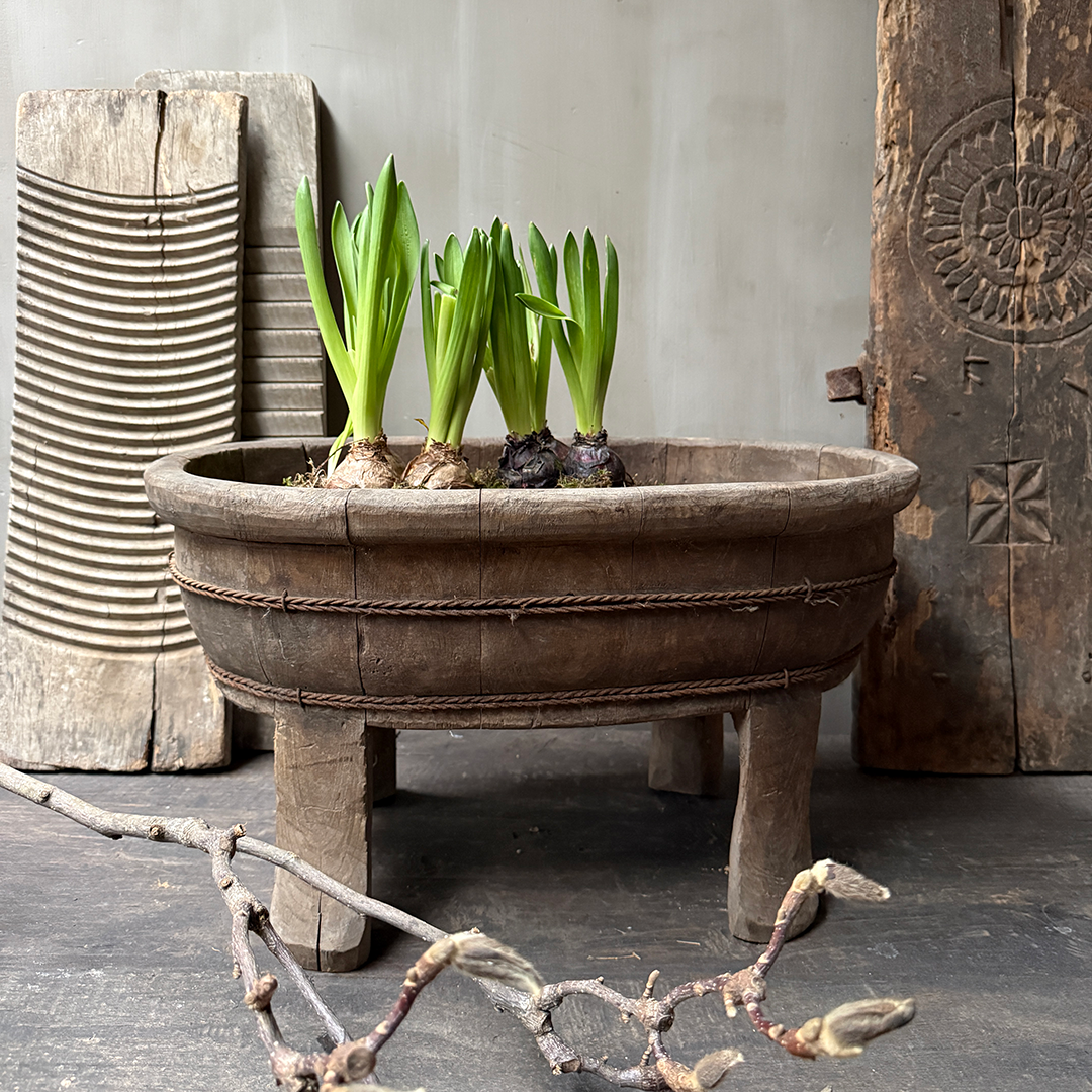 Prachige ovale olijfbak op poten van oud hout in een echt prachtige vergrijsdekleur. Deze bak is op ontzettend veel verschillende manieren te decoreren. Zet hem bijvoorbeeld leuk vol met Nepalese kruikjes, met windlichten, een leemmand of leuk met mosbollen. Of zet hem buiten op de tafel en zet hem vol met plantjes. Een echte aanwinst voor ieder interieur met zijn prachtige verweerde en geleefde uiterlijk.