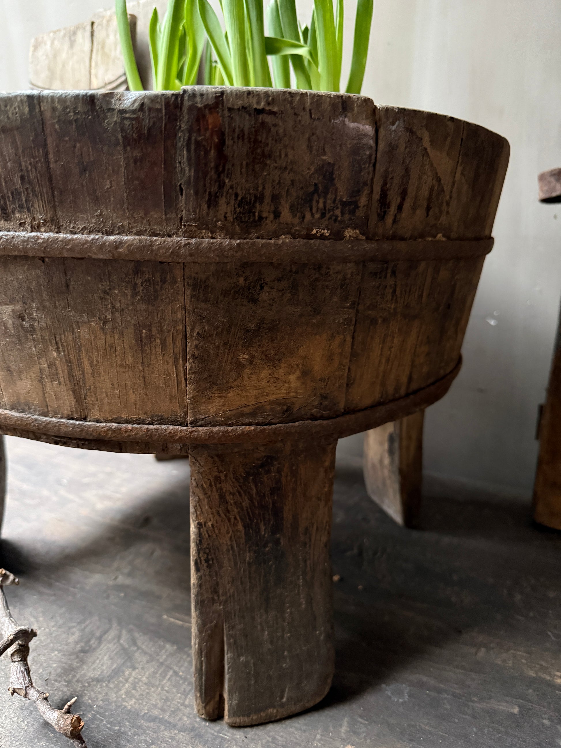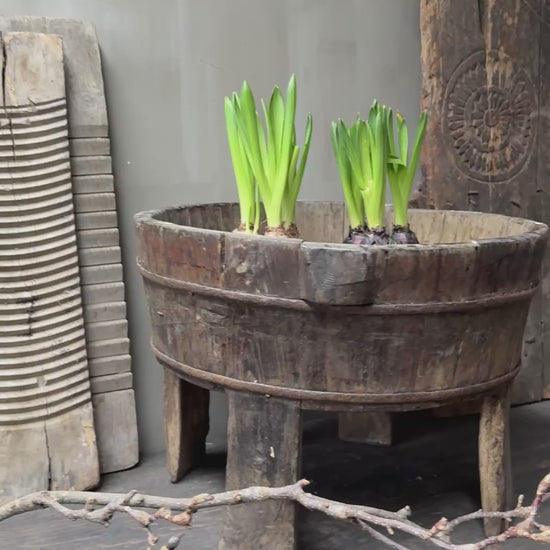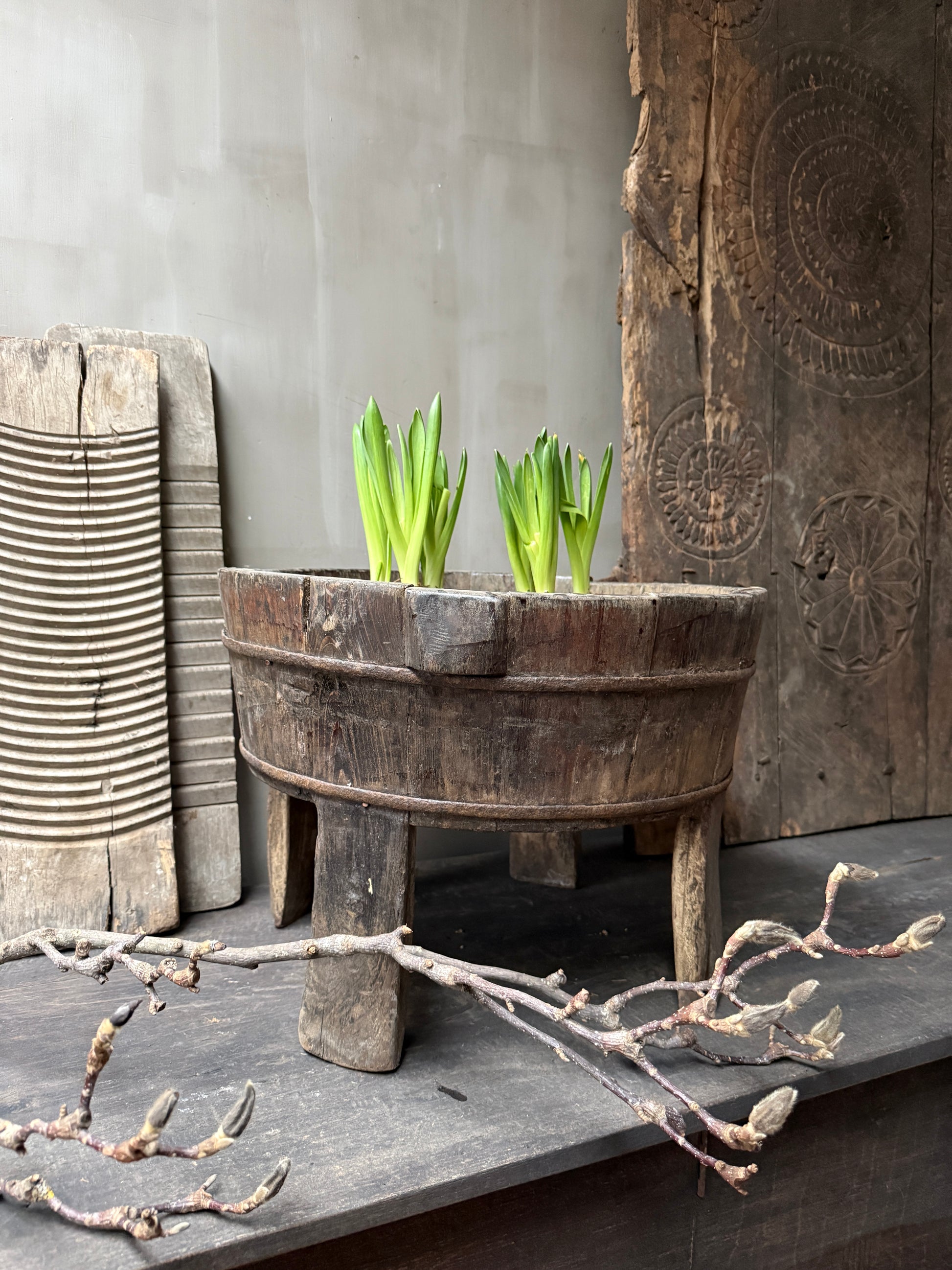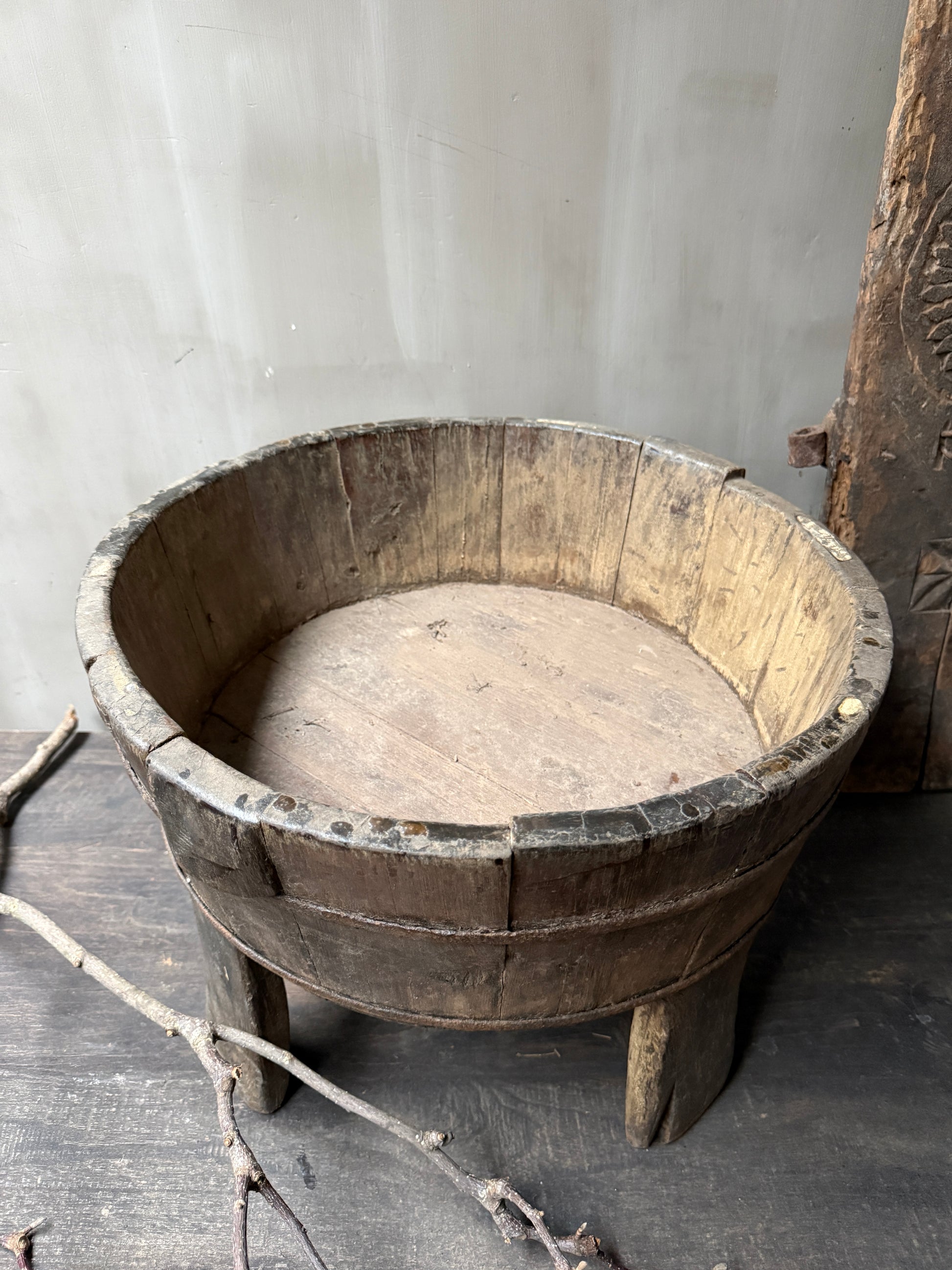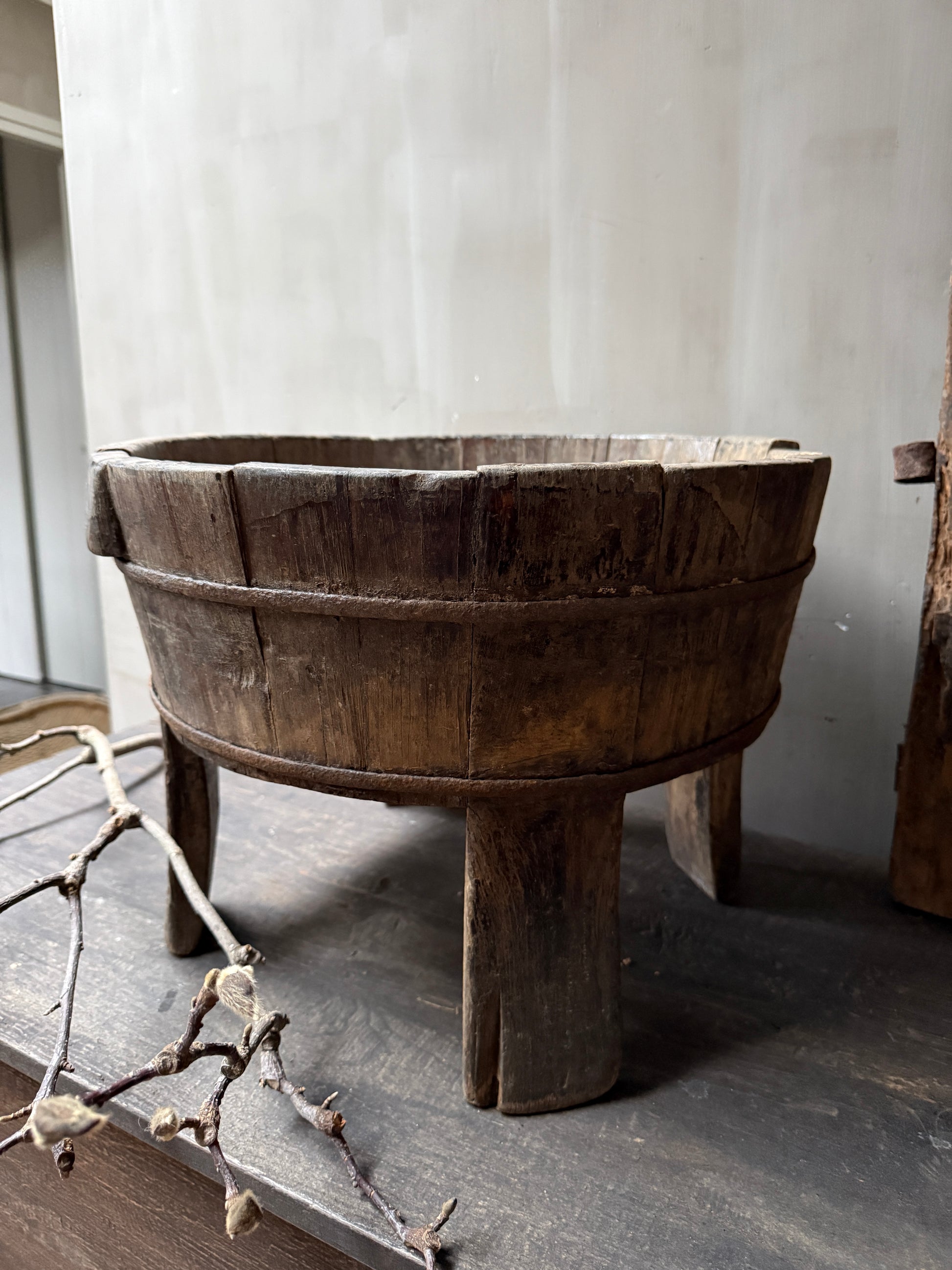 Prachtige ronde olijfbak op poten van oud hout in een echt prachtige vergrijs de kleur. Deze bak is op ontzettend veel verschillende manieren te decoreren. Zet hem bijvoorbeeld leuk vol met Nepalese kruikjes, met windlichten, een leemmand of leuk met mosbollen. Of zet hem buiten op de tafel en zet hem vol met plantjes. Een echte aanwinst voor ieder interieur met zijn prachtige verweerde en geleefde uiterlijk.