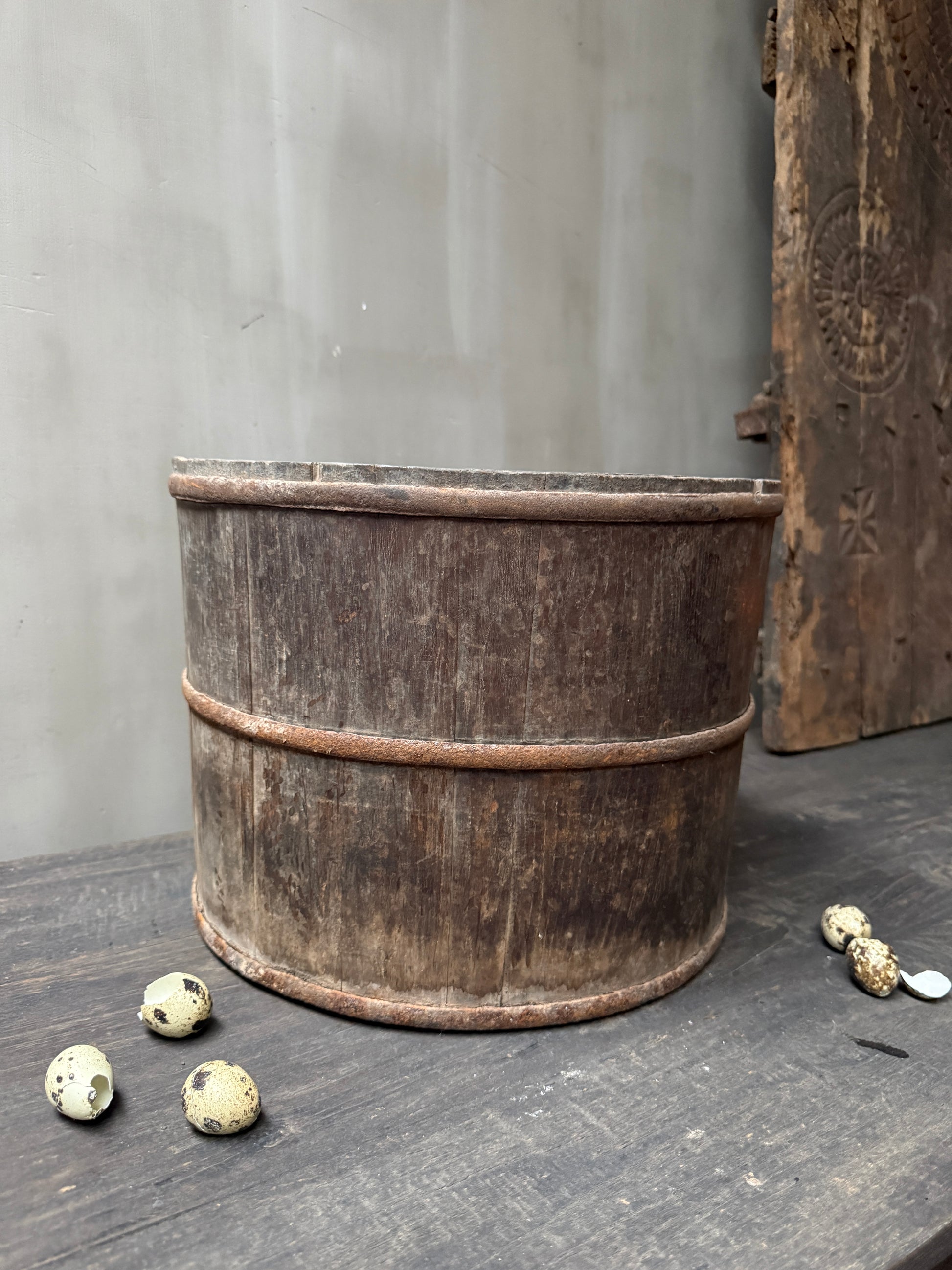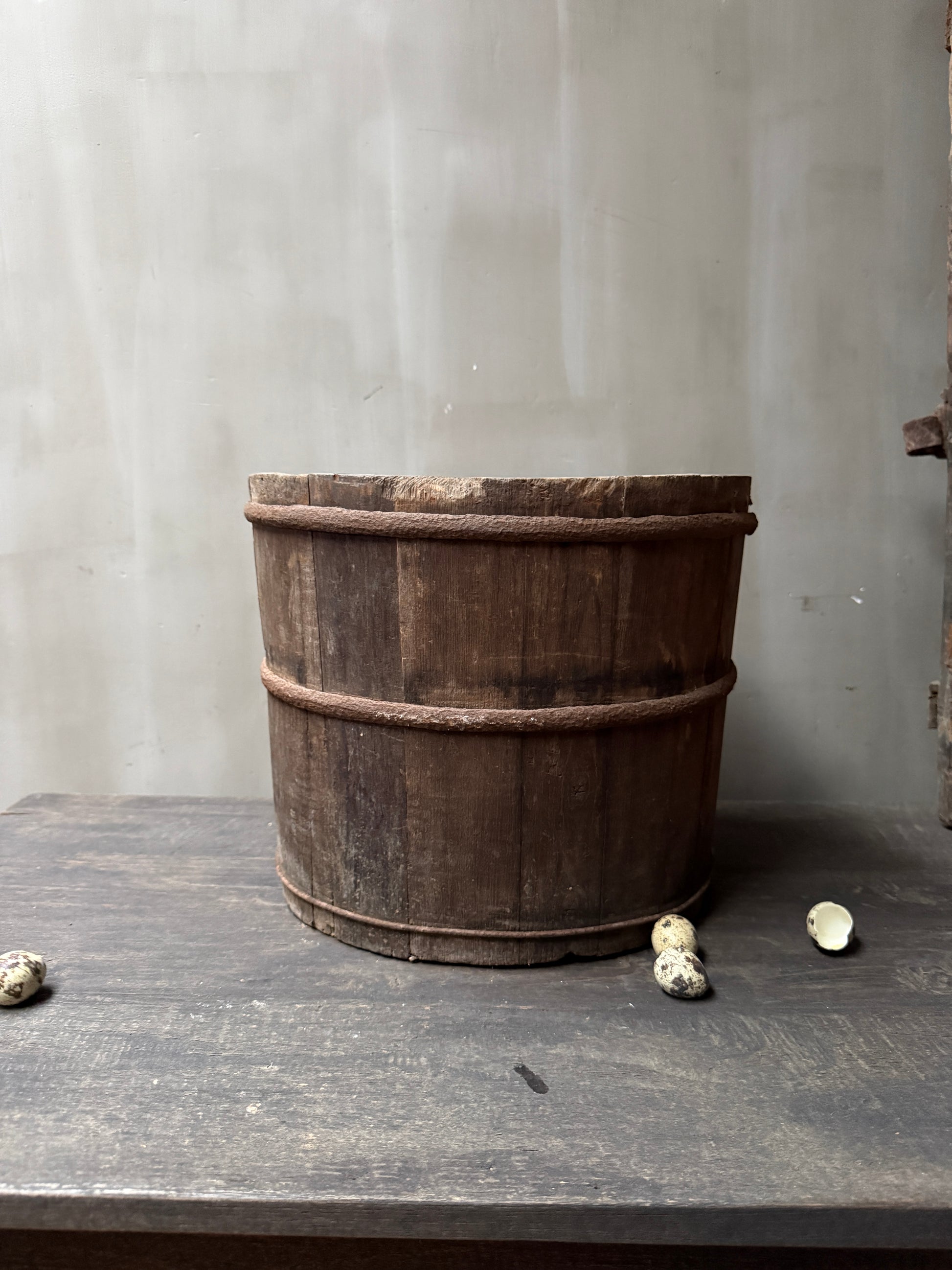Prachtige oude houten bak / ton met metalen ringen. Mooi geleefd oud hout. Geef jij deze leukerd binnen of buiten een plekje?