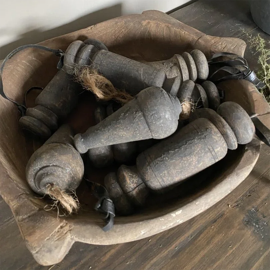 Oude houten klossen aan leren veter. Leuk om bijvoorbeeld te verwerken in een toef. Deze klossen verwerkt in een toef staan ook als set in de webshop.